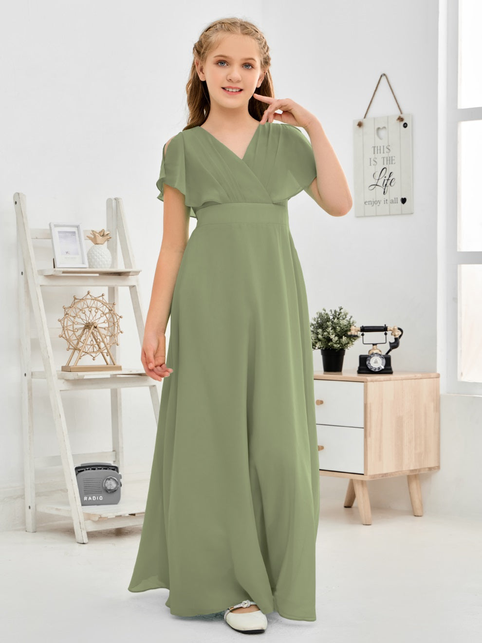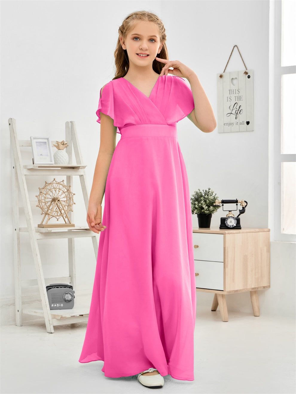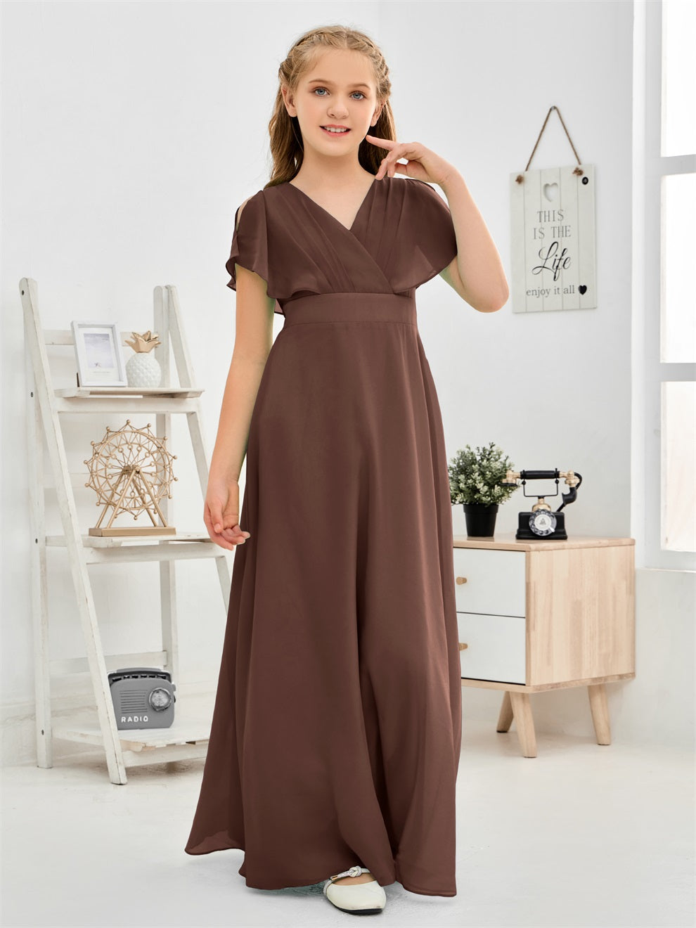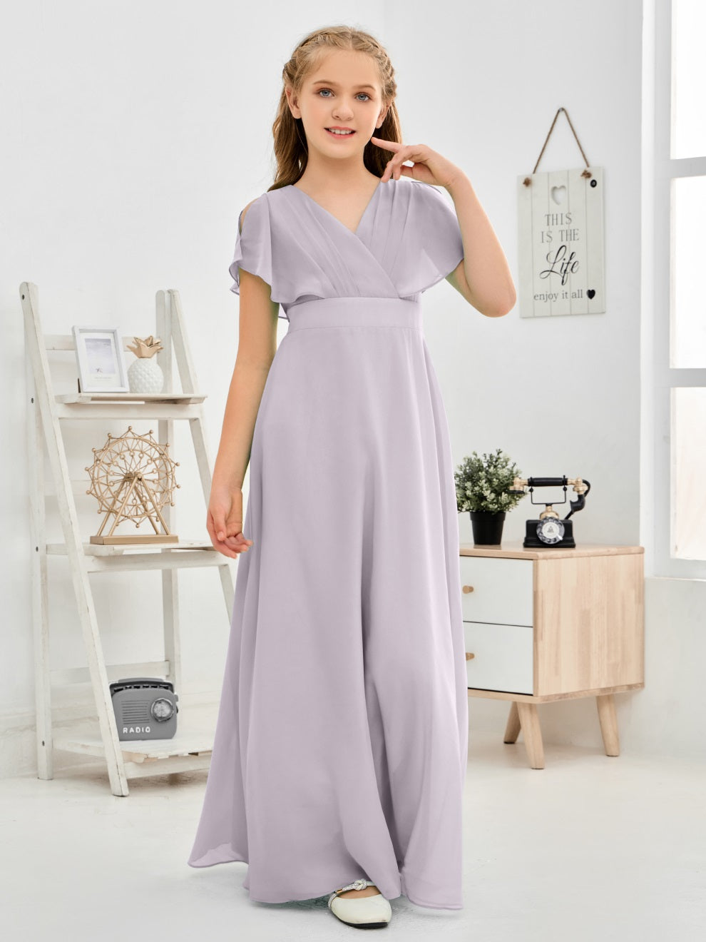 Gewellter V-Ausschnitt Chiffon Junior Brautjungfernkleid
