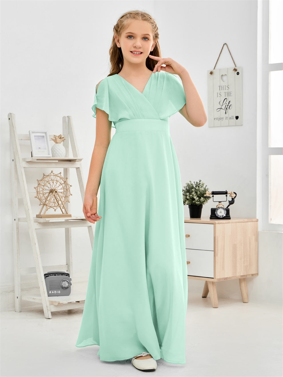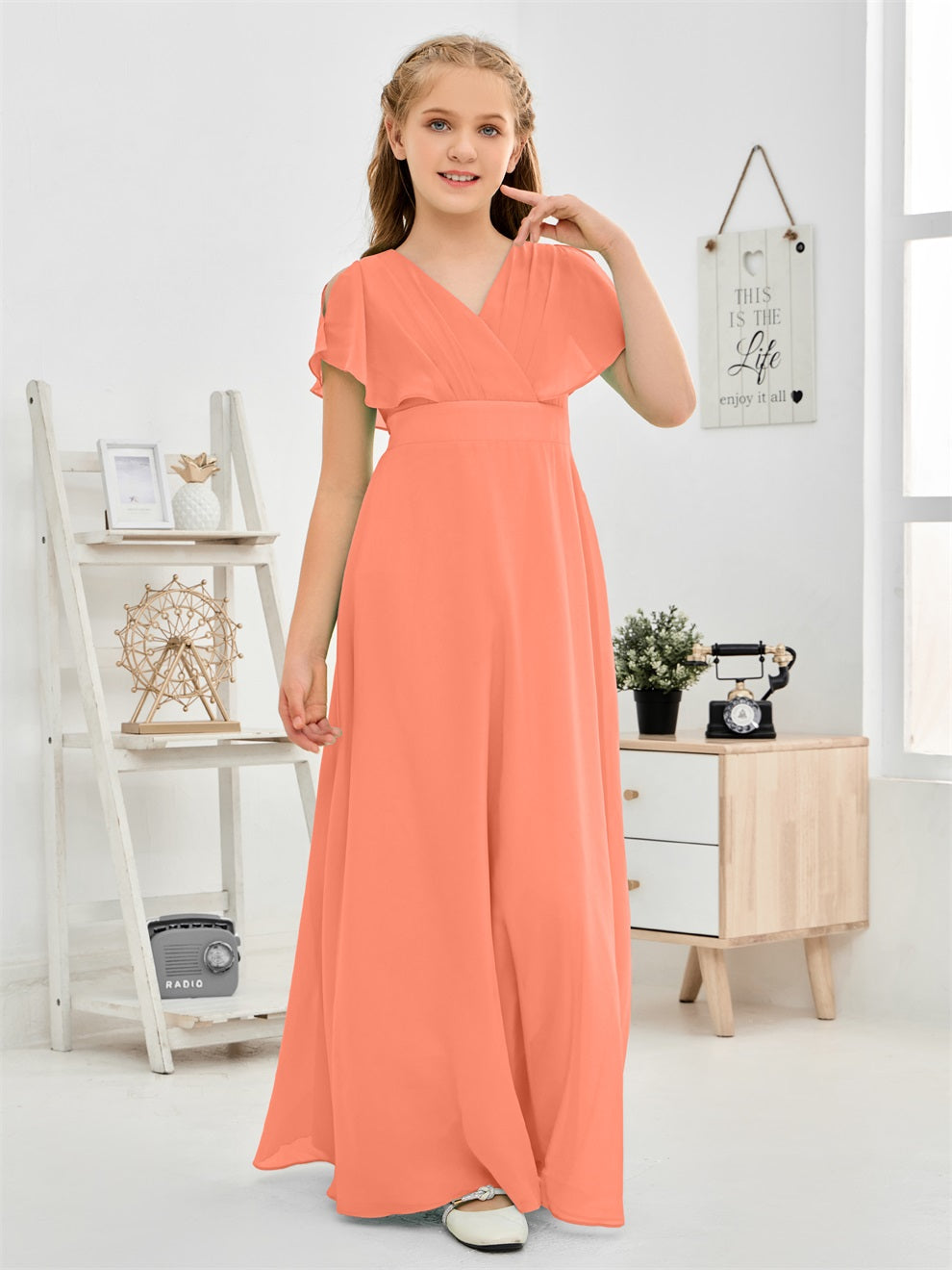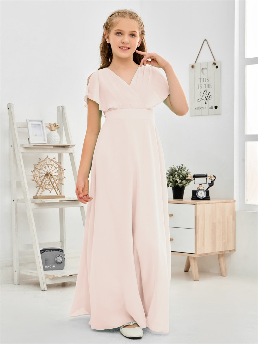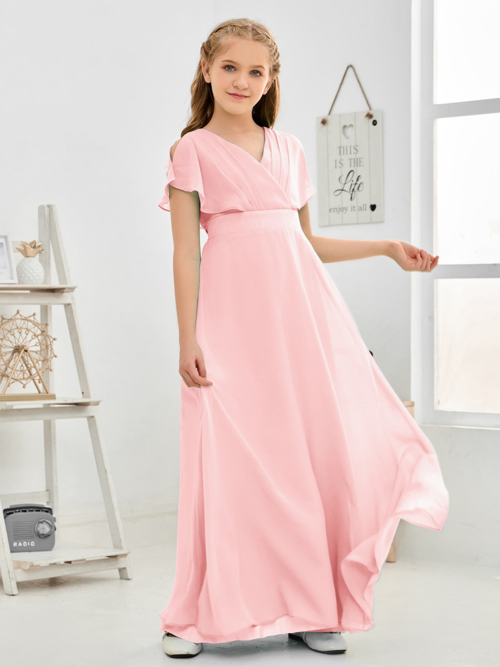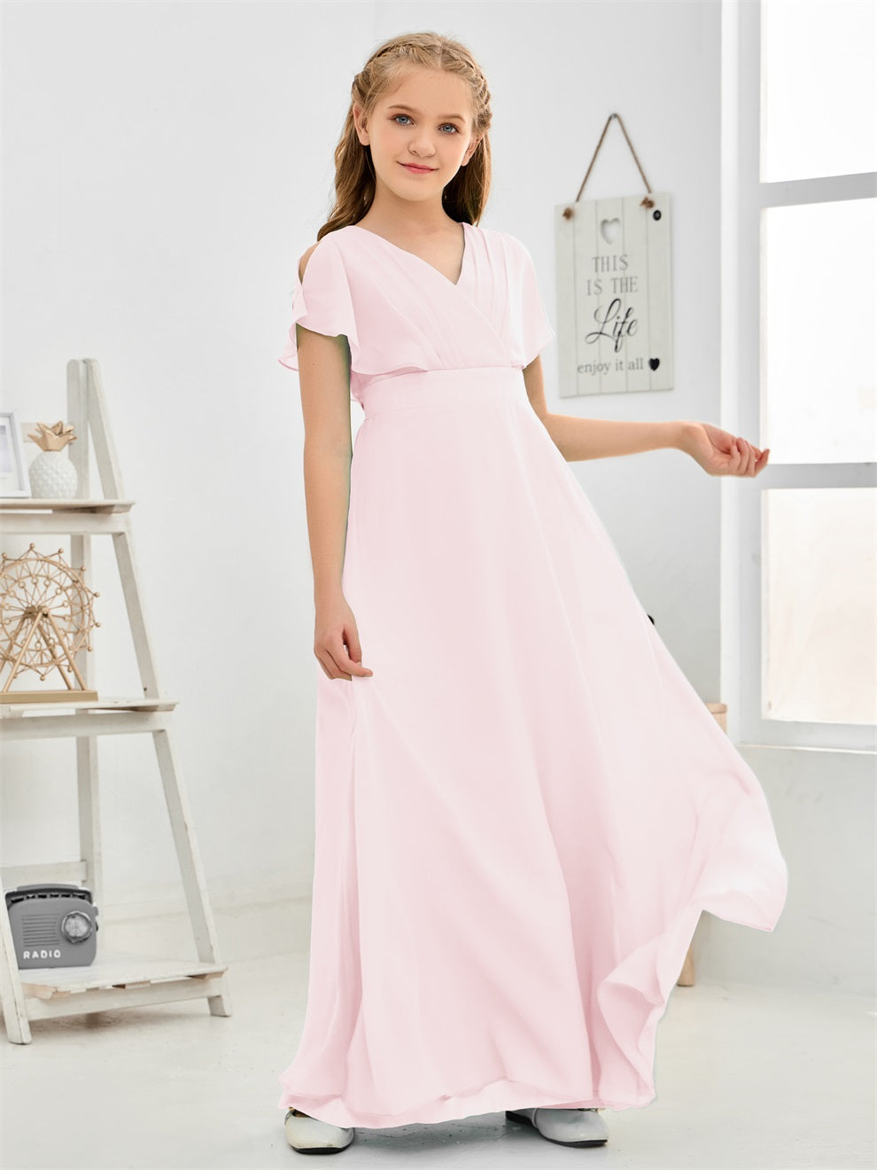 Gewellter V-Ausschnitt Chiffon Junior Brautjungfernkleid