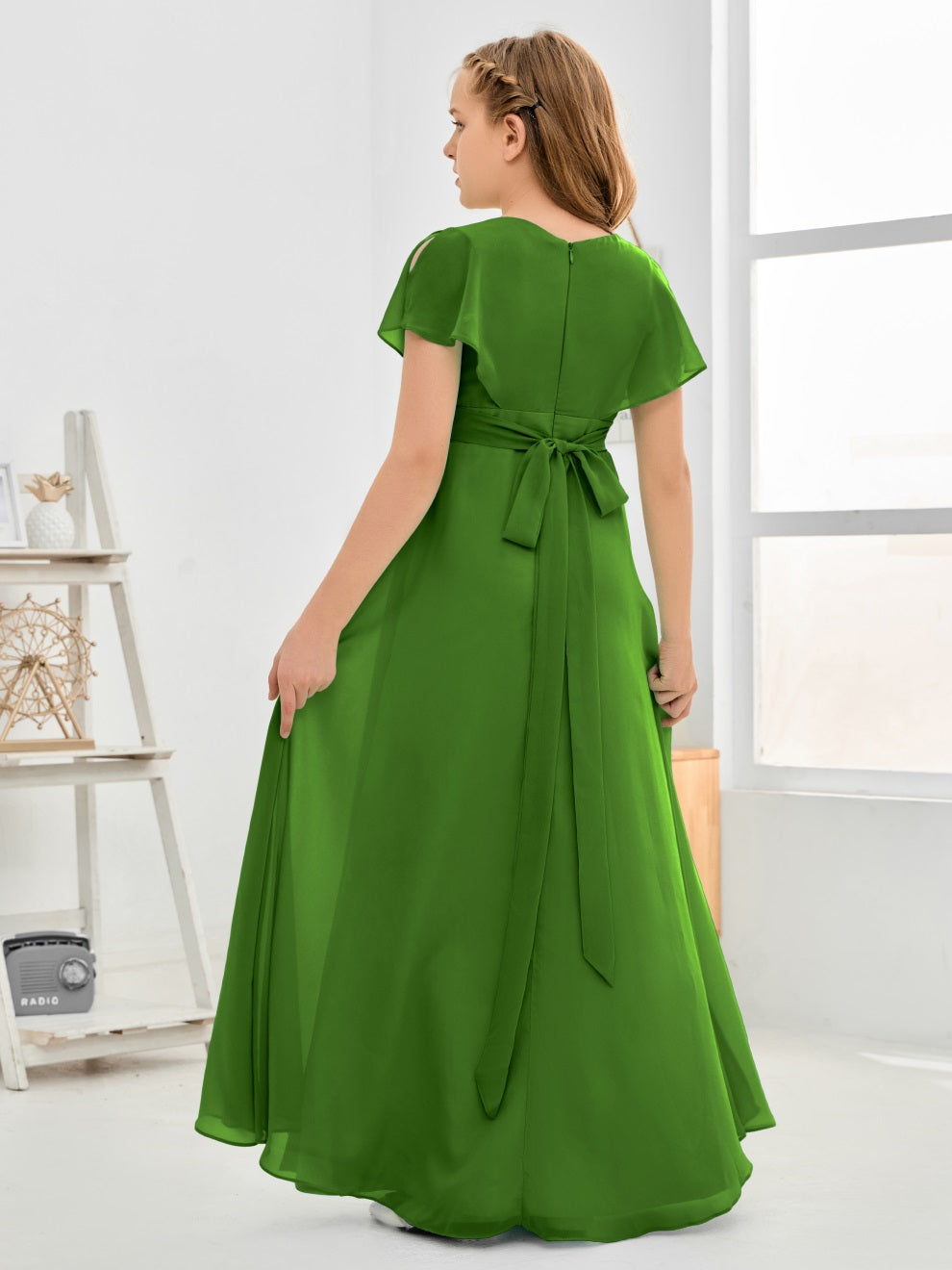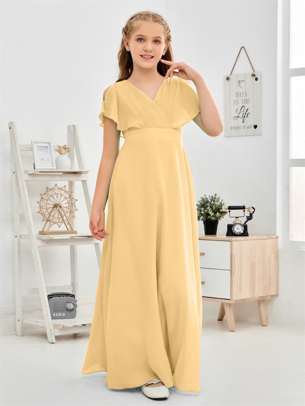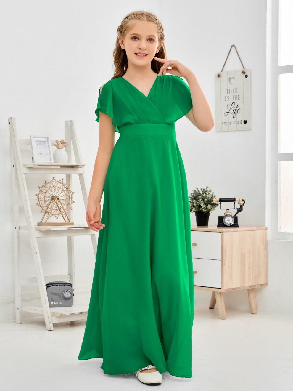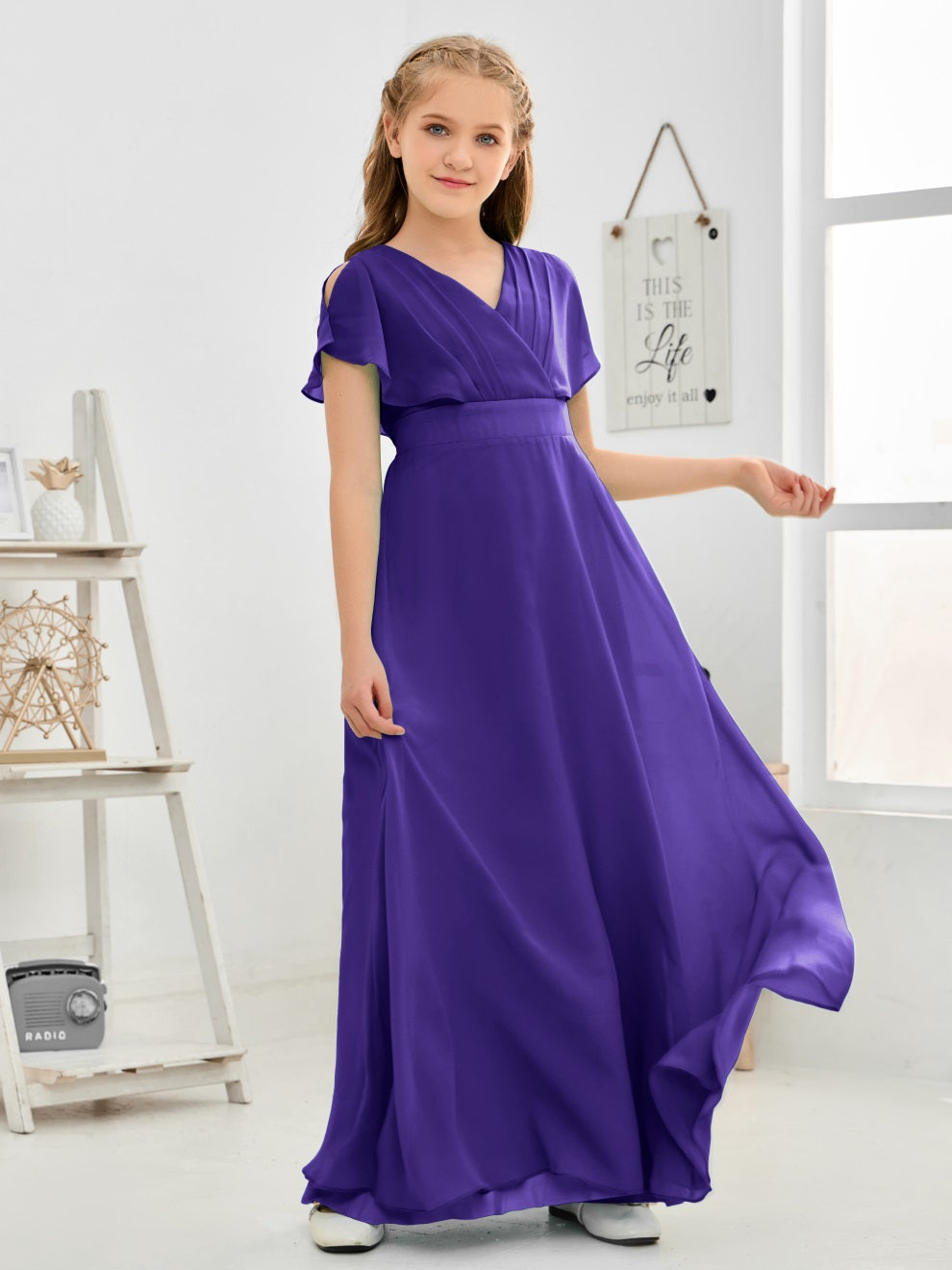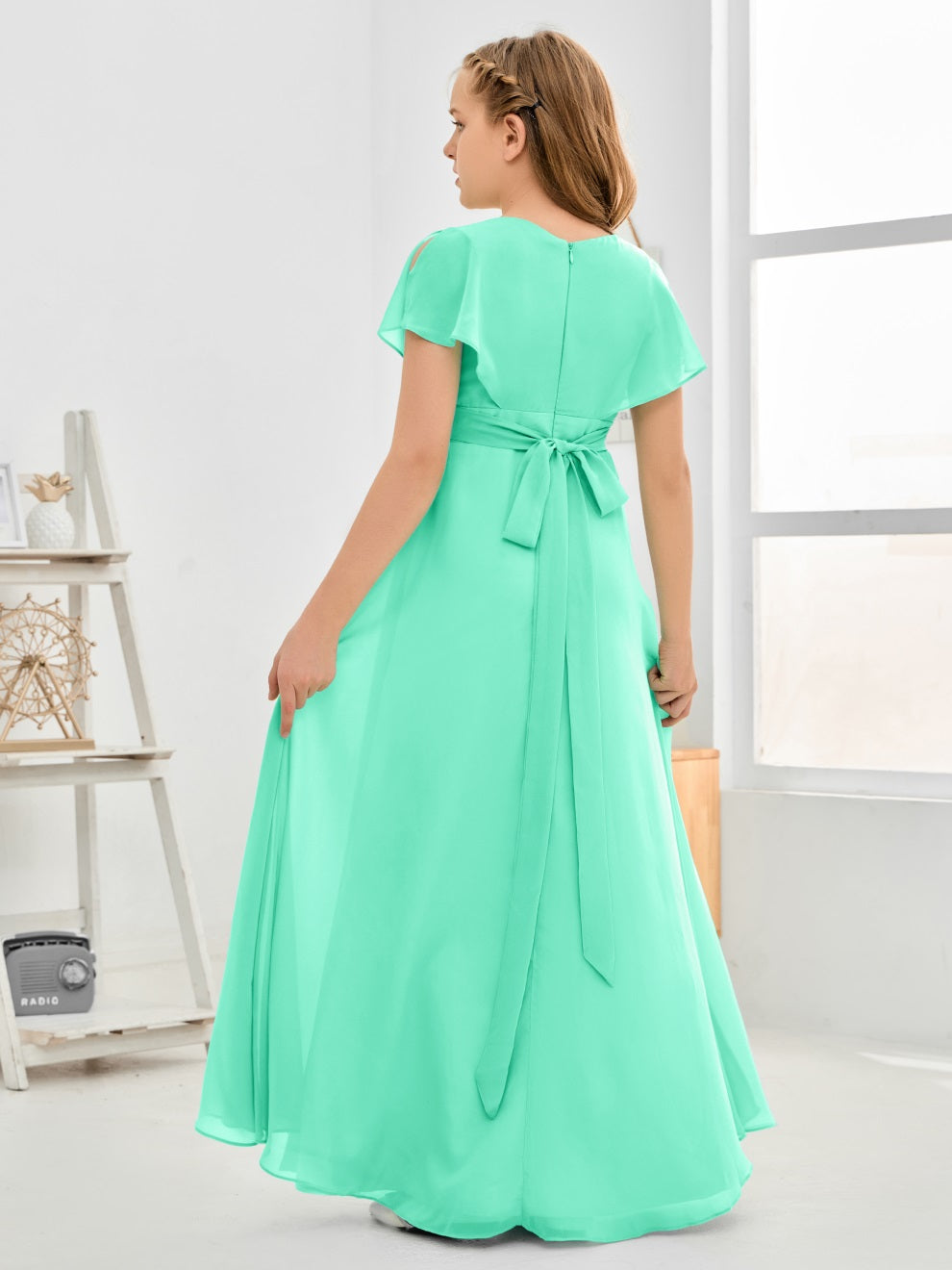 Gewellter V-Ausschnitt Chiffon Junior Brautjungfernkleid