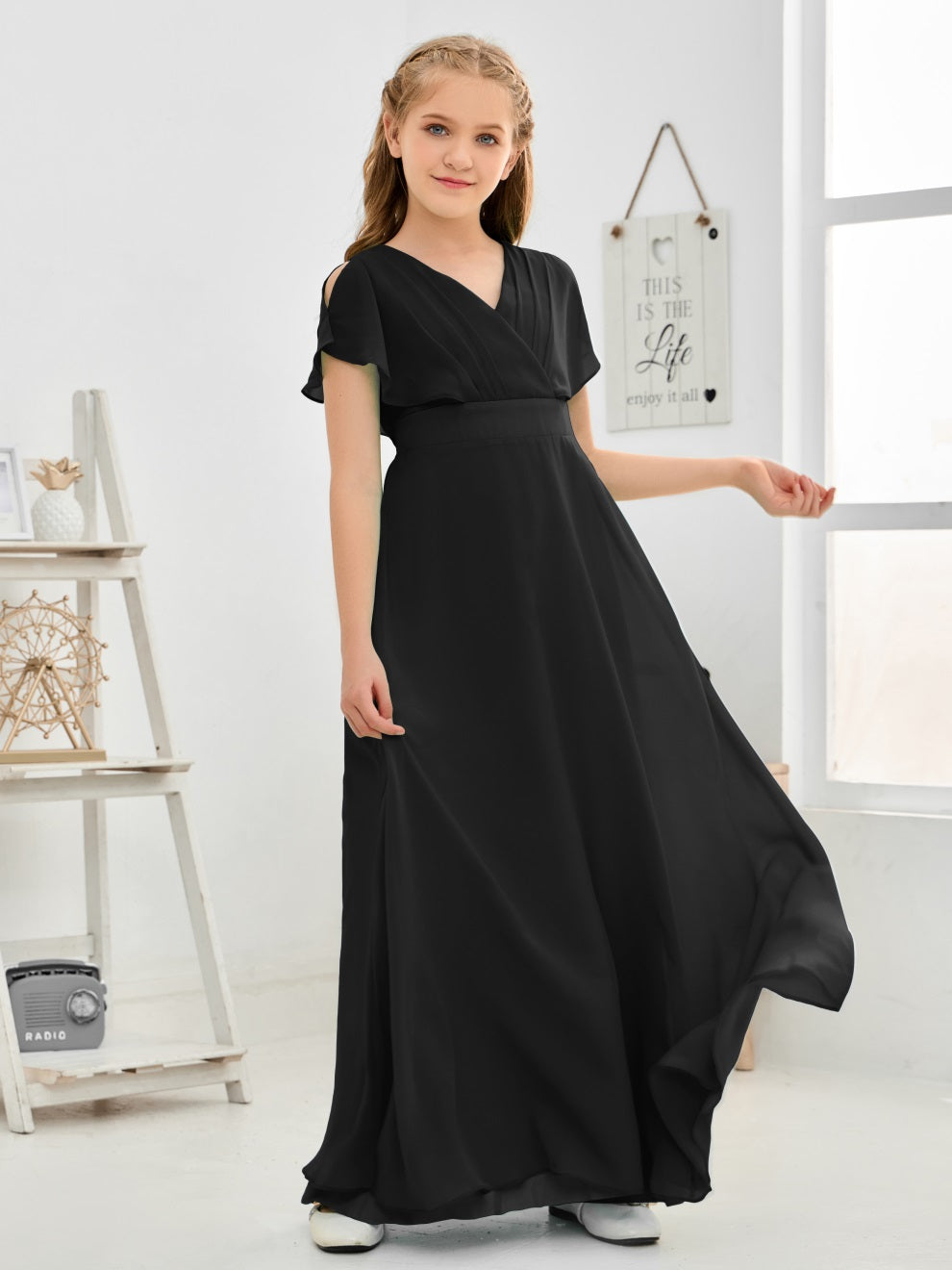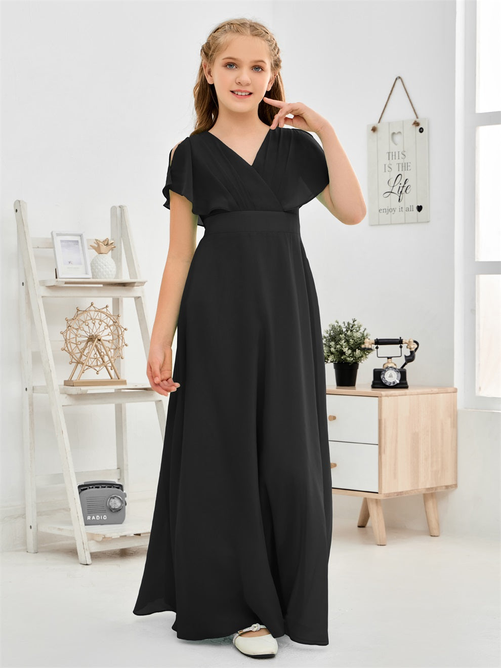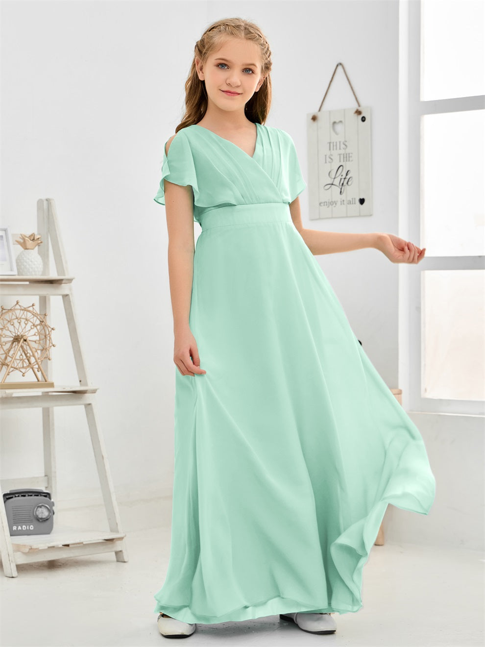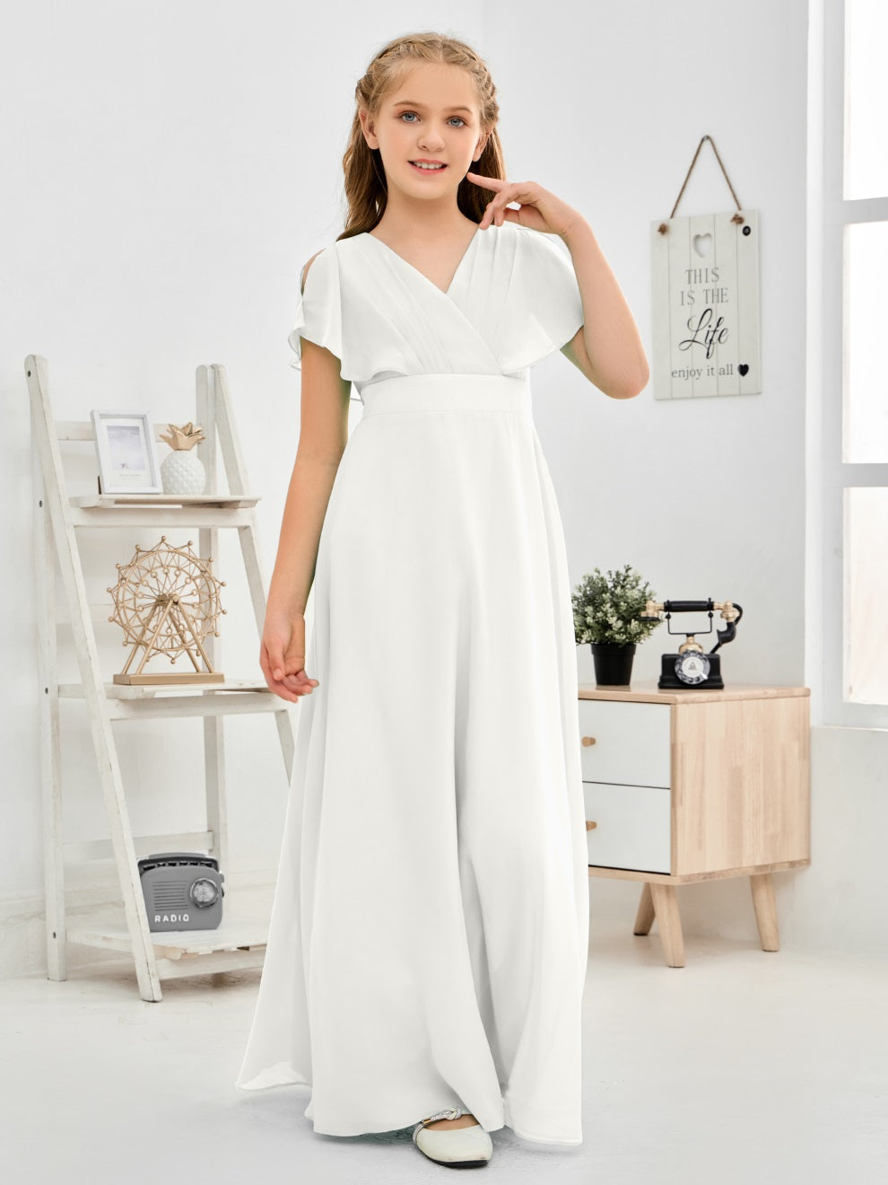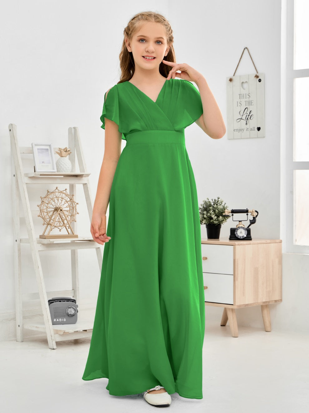 Gewellter V-Ausschnitt Chiffon Junior Brautjungfernkleid