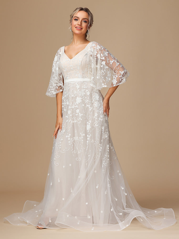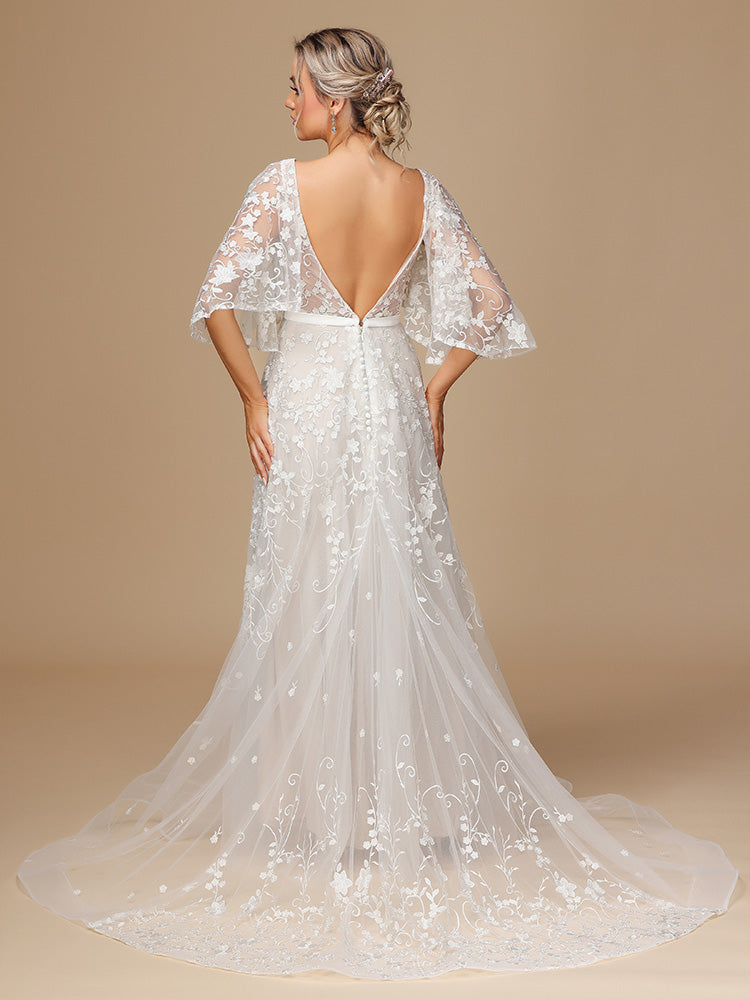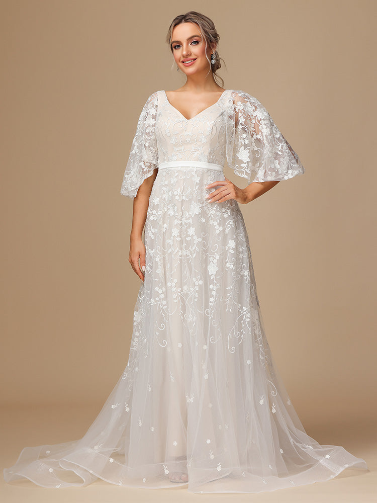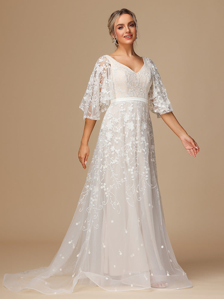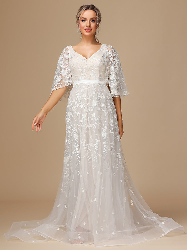 Halbe Ärmel V-Ausschnitt Hof Schleppe Tüll Brautkleider mit Spitze