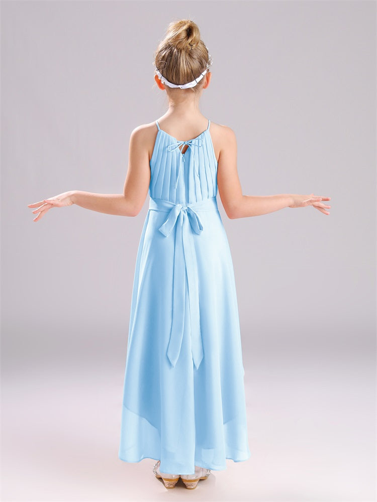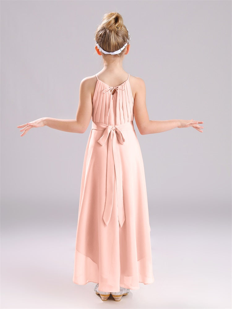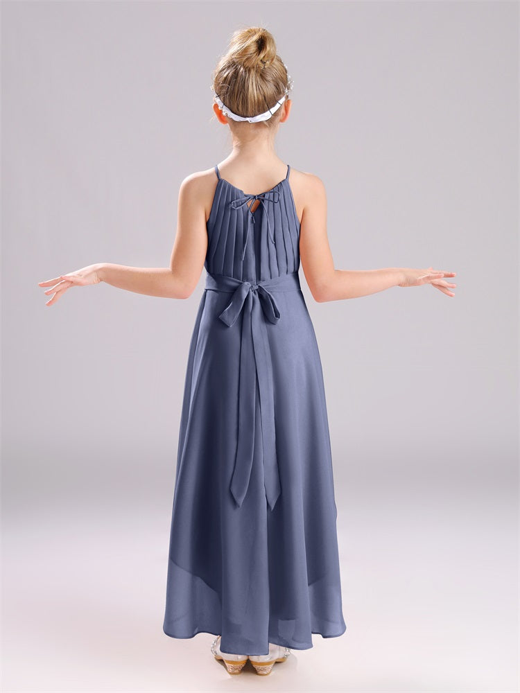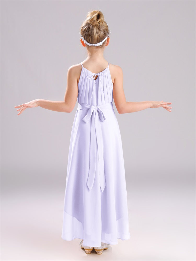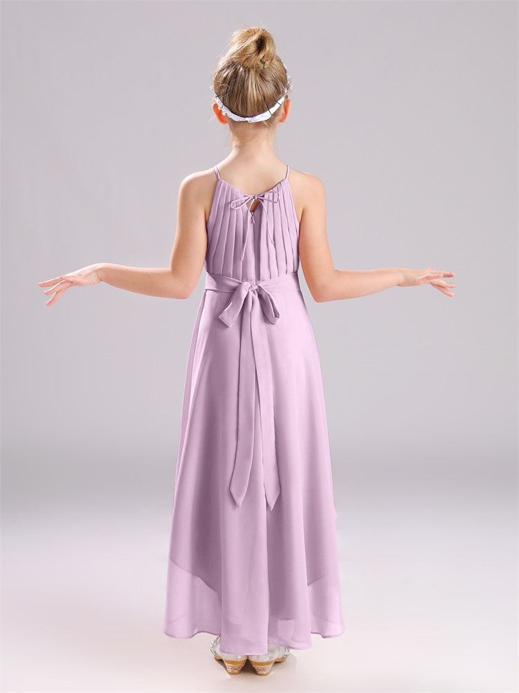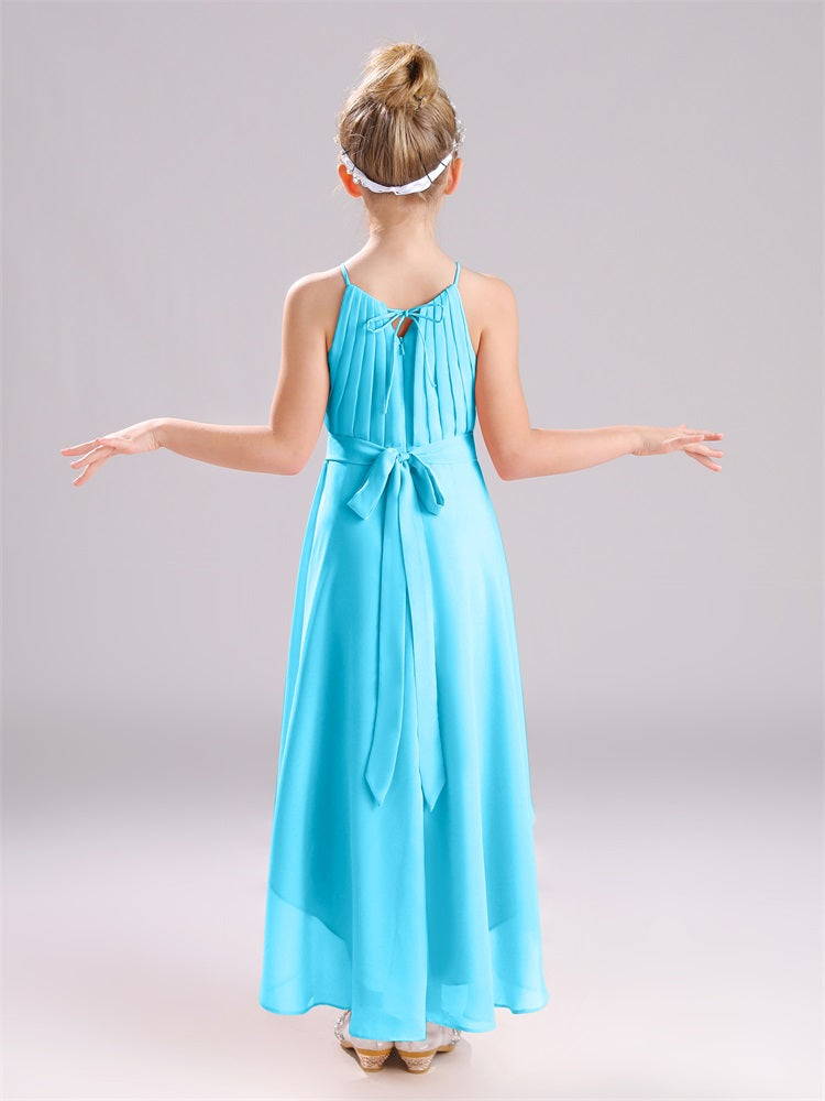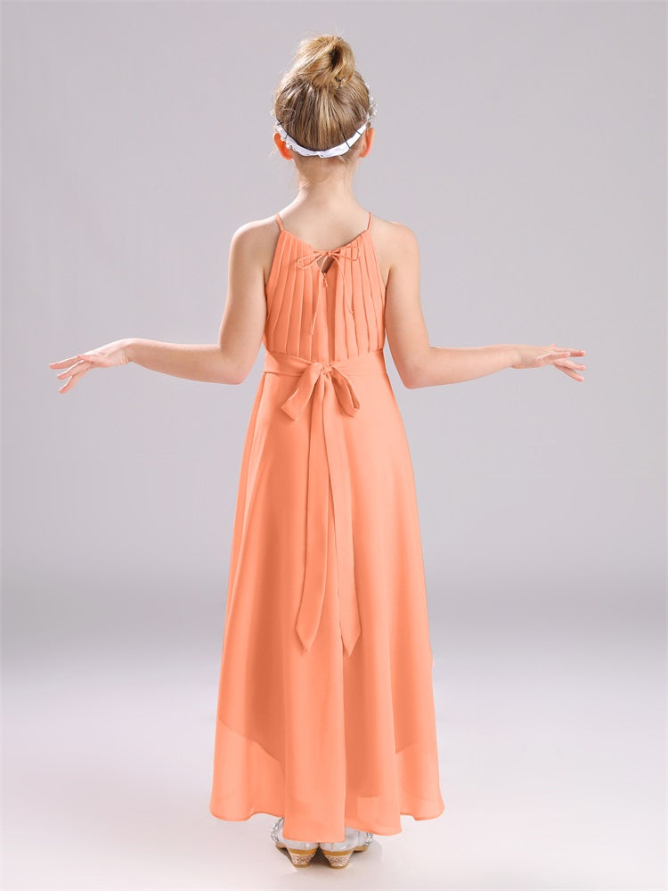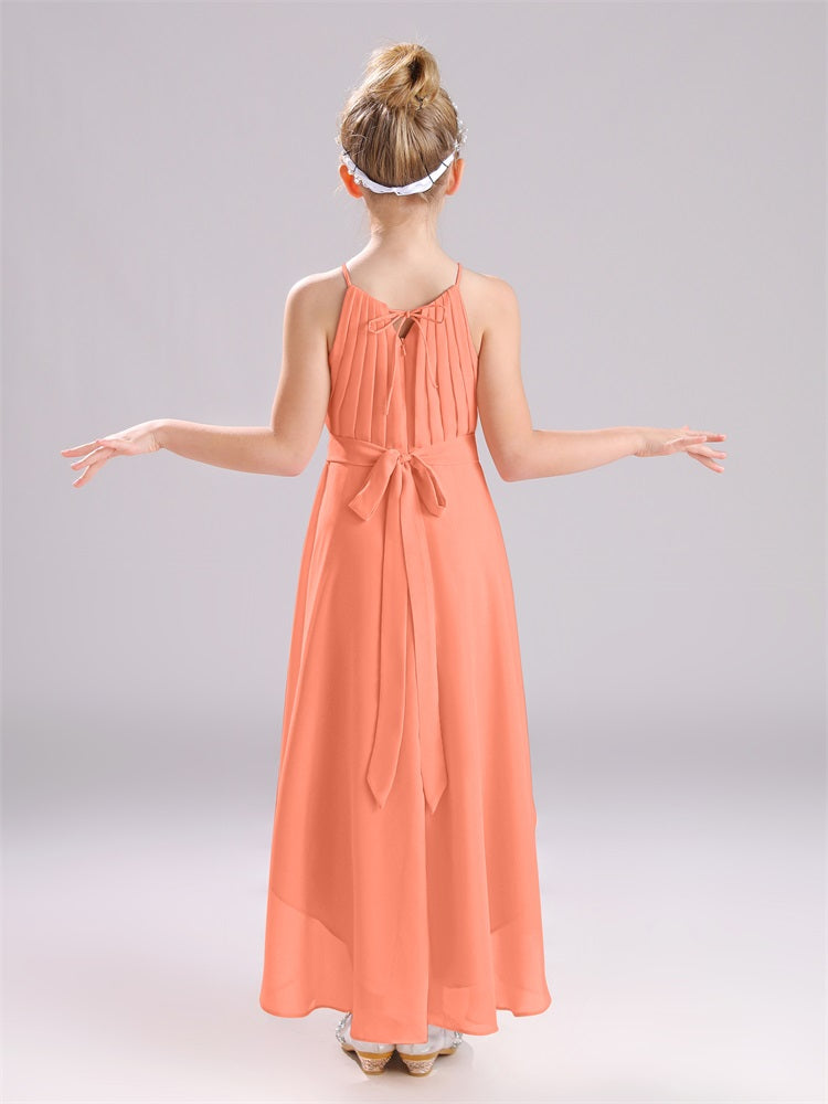 Dieses ärmellose, lange Chiffonkleid mit Neckholder und Plisseefalten wurde speziell für junge Brautjungfern angefertigt und strahlt Eleganz und Raffinesse aus. Die raffinierten Falten und der luftige Chiffonstoff sorgen für eine schmeichelhafte Silhouette und machen es perfekt für jeden Anlass. Ihre jungen Brautjungfern werden sich den ganzen Tag über wohlfühlen und elegant aussehen.