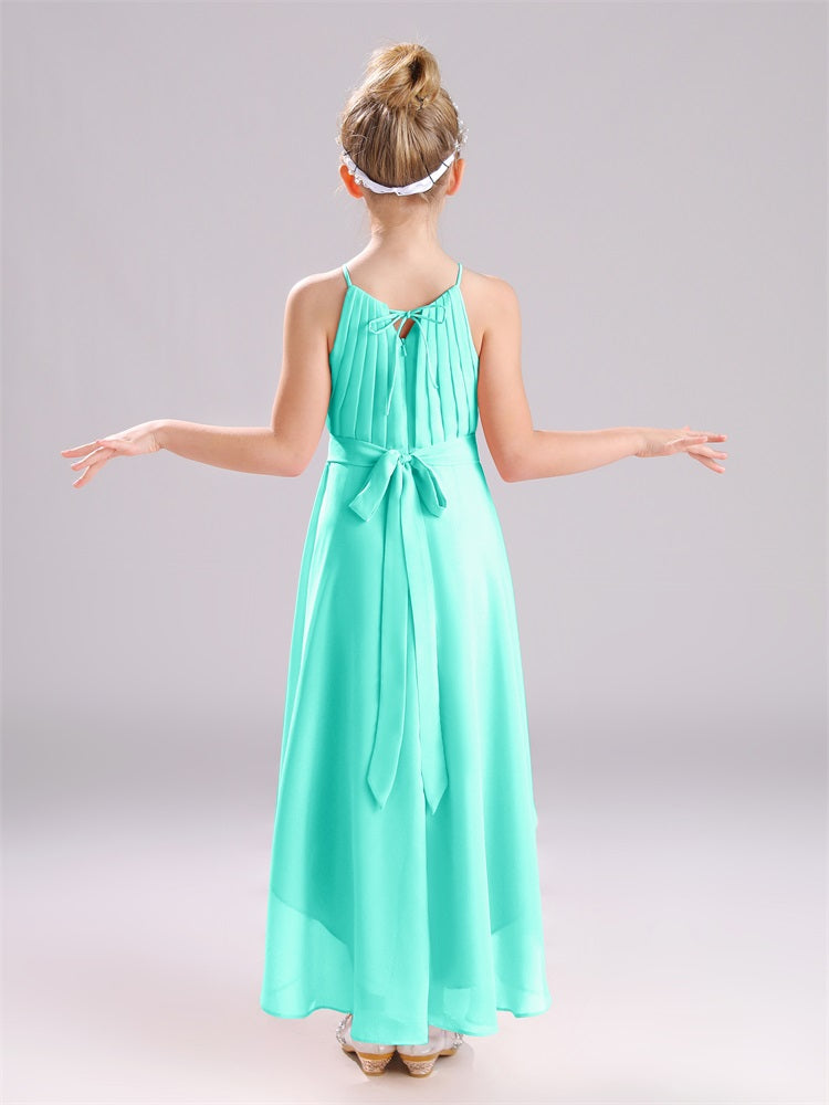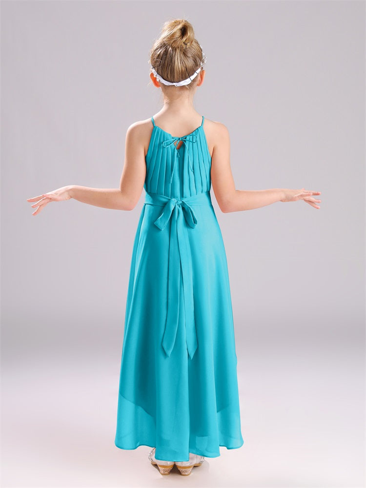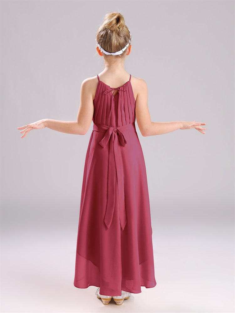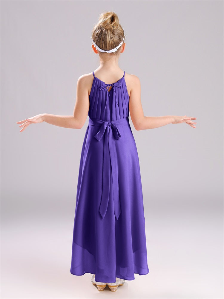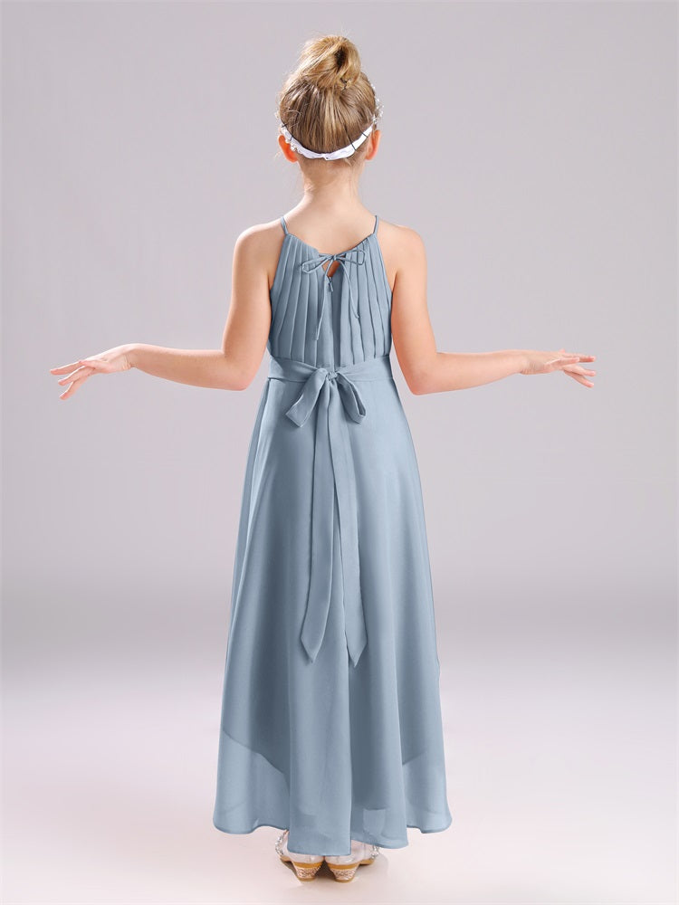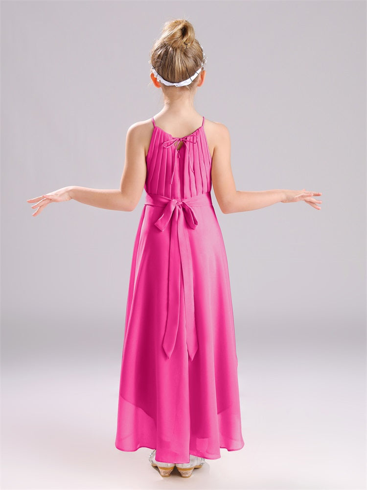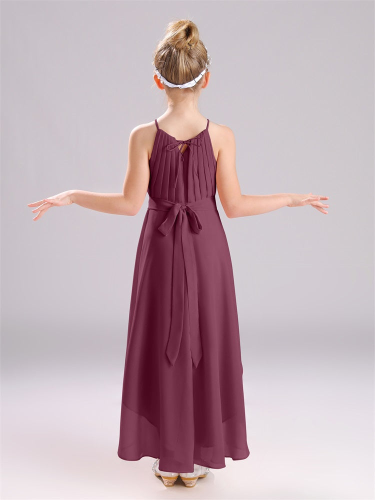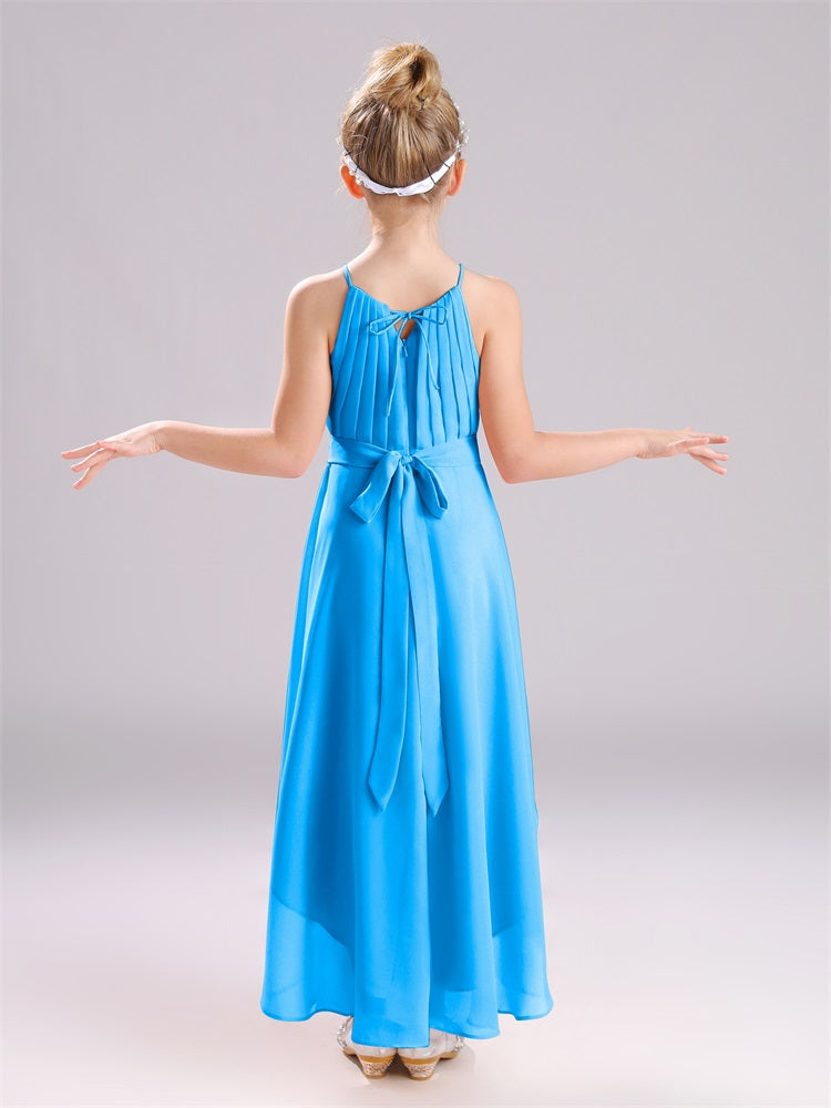 Dieses ärmellose, lange Chiffonkleid mit Neckholder und Plisseefalten wurde speziell für junge Brautjungfern angefertigt und strahlt Eleganz und Raffinesse aus. Die raffinierten Falten und der luftige Chiffonstoff sorgen für eine schmeichelhafte Silhouette und machen es perfekt für jeden Anlass. Ihre jungen Brautjungfern werden sich den ganzen Tag über wohlfühlen und elegant aussehen.