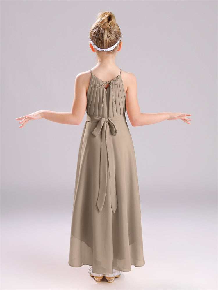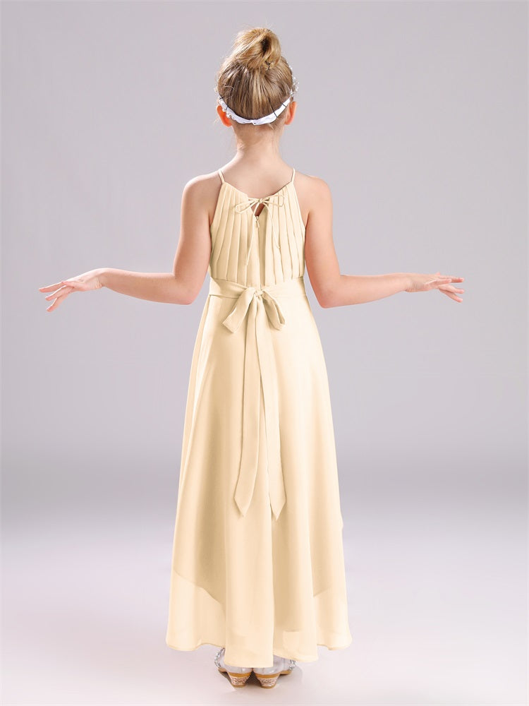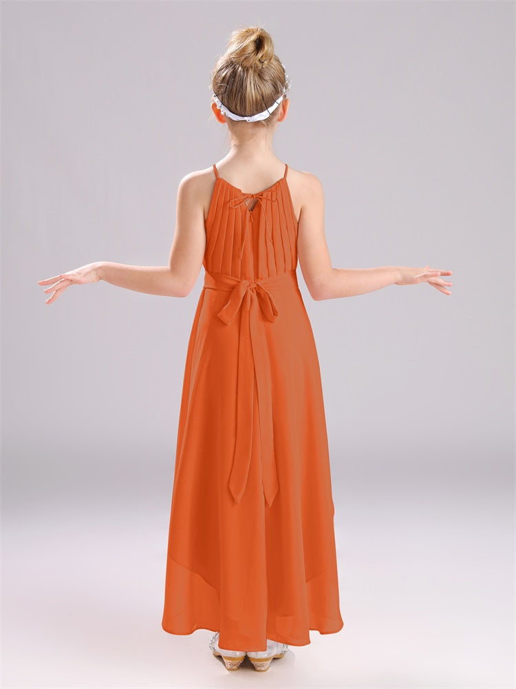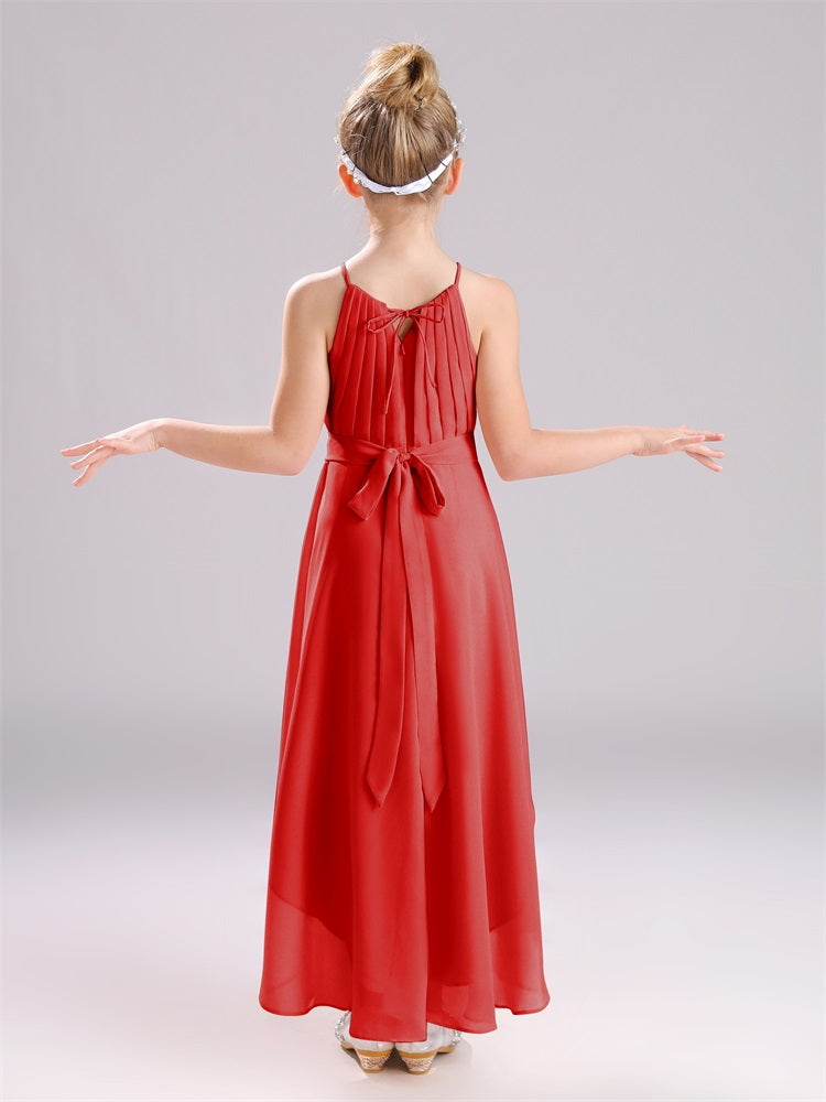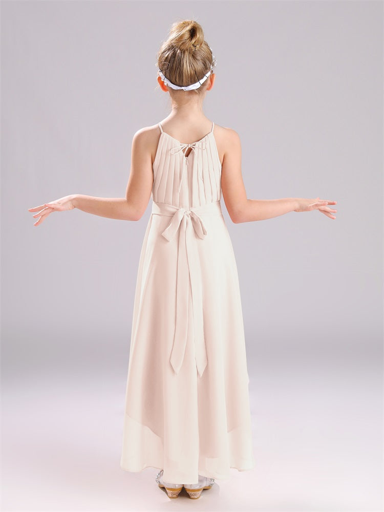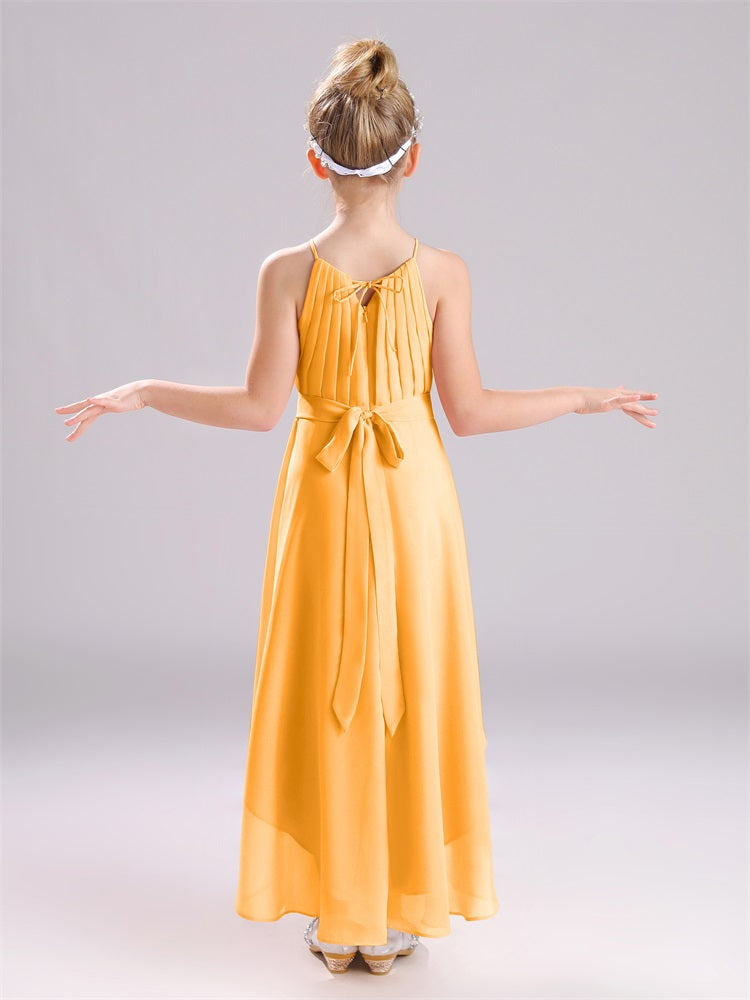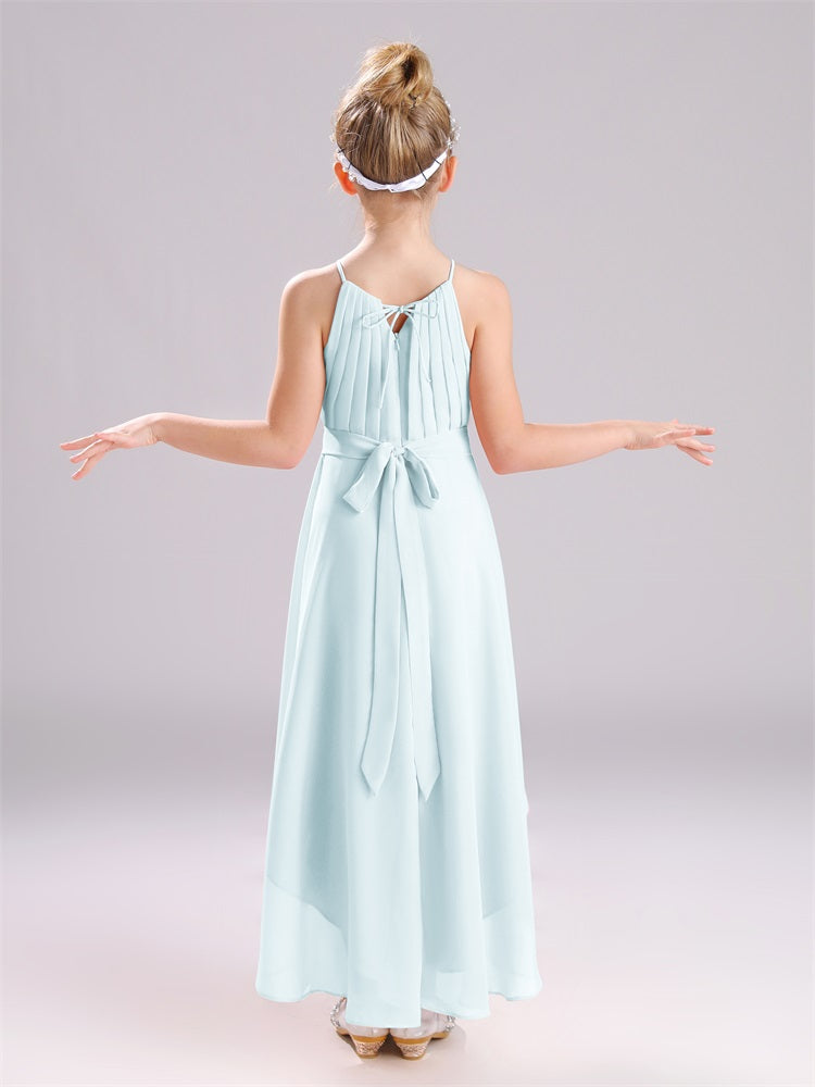 Dieses ärmellose, lange Chiffonkleid mit Neckholder und Plisseefalten wurde speziell für junge Brautjungfern angefertigt und strahlt Eleganz und Raffinesse aus. Die raffinierten Falten und der luftige Chiffonstoff sorgen für eine schmeichelhafte Silhouette und machen es perfekt für jeden Anlass. Ihre jungen Brautjungfern werden sich den ganzen Tag über wohlfühlen und elegant aussehen.
