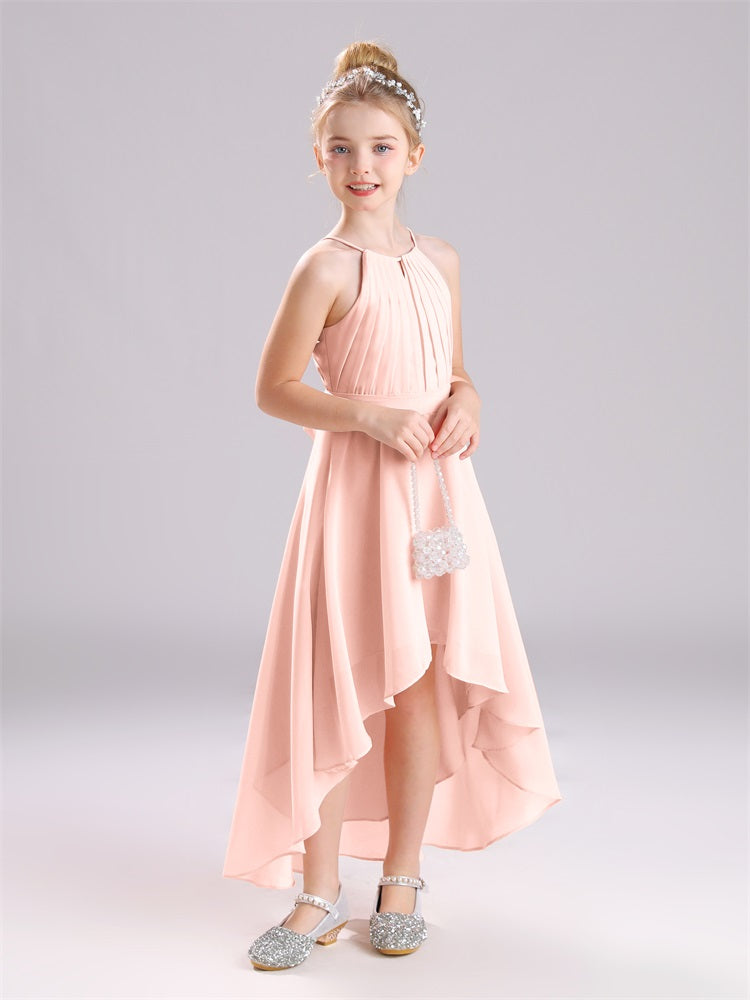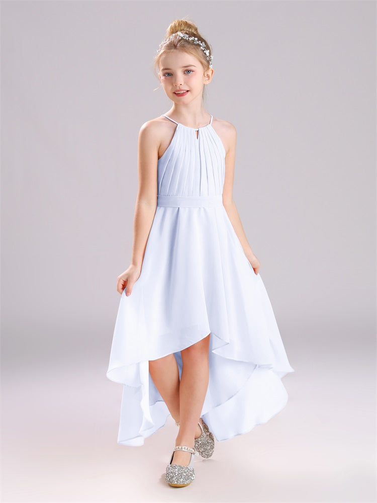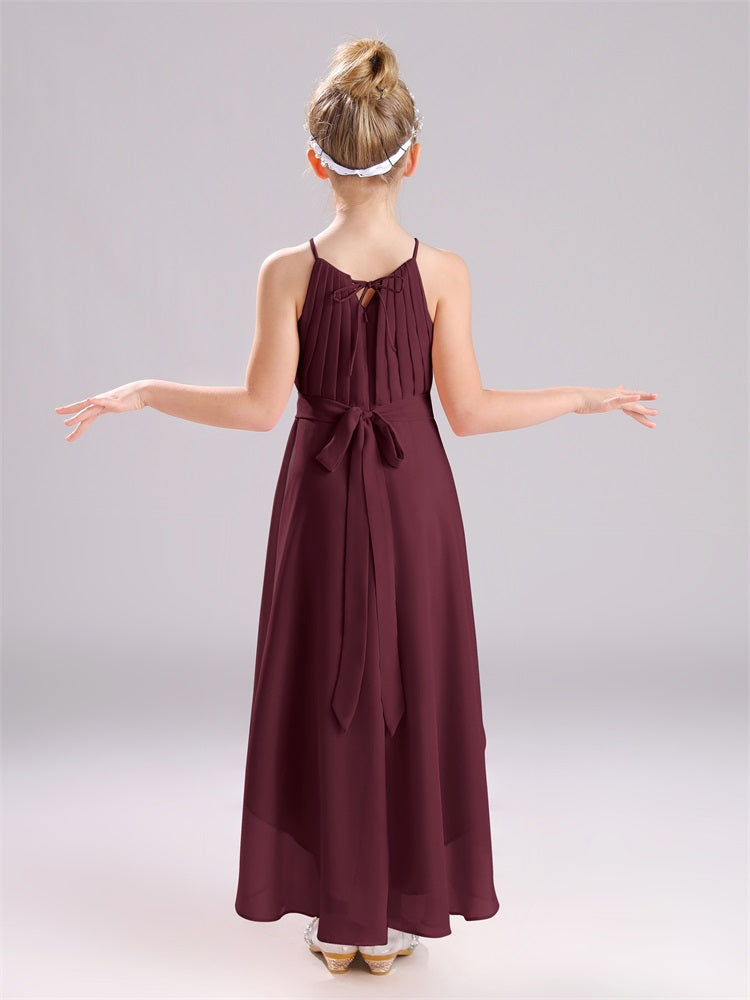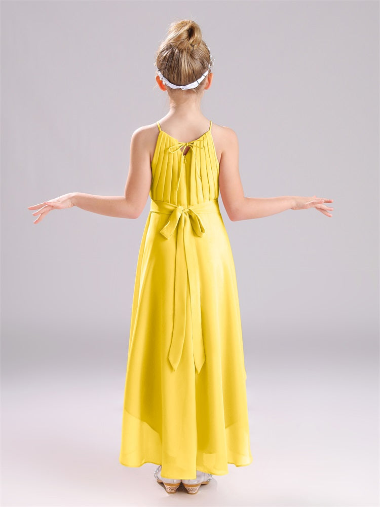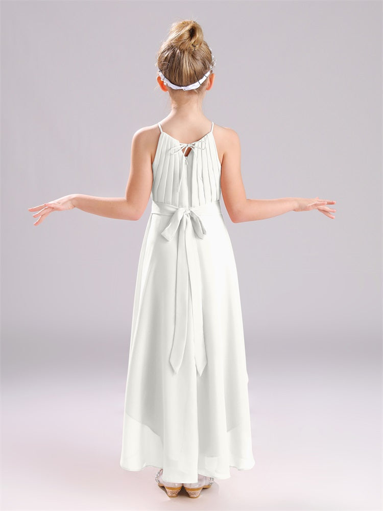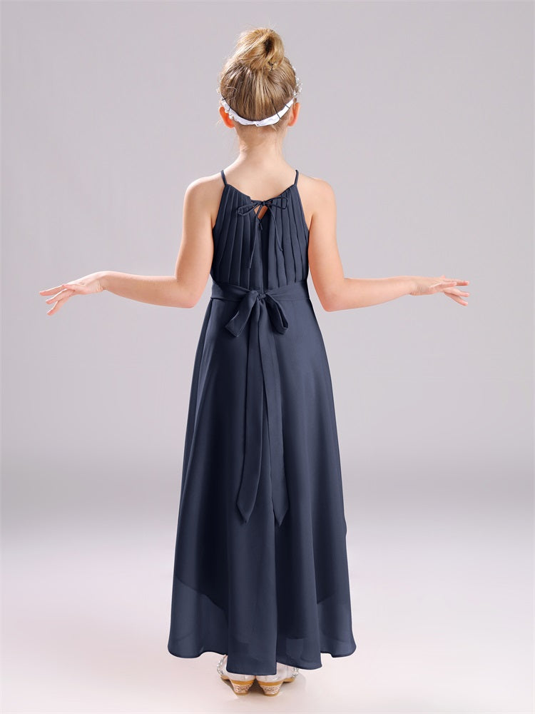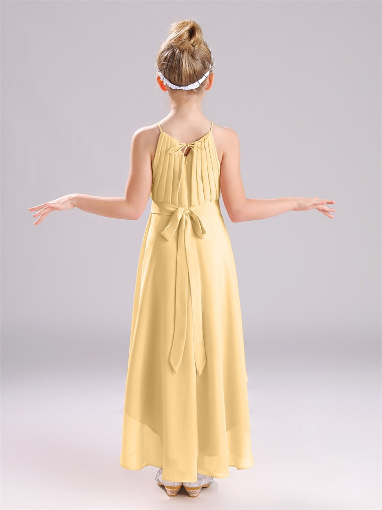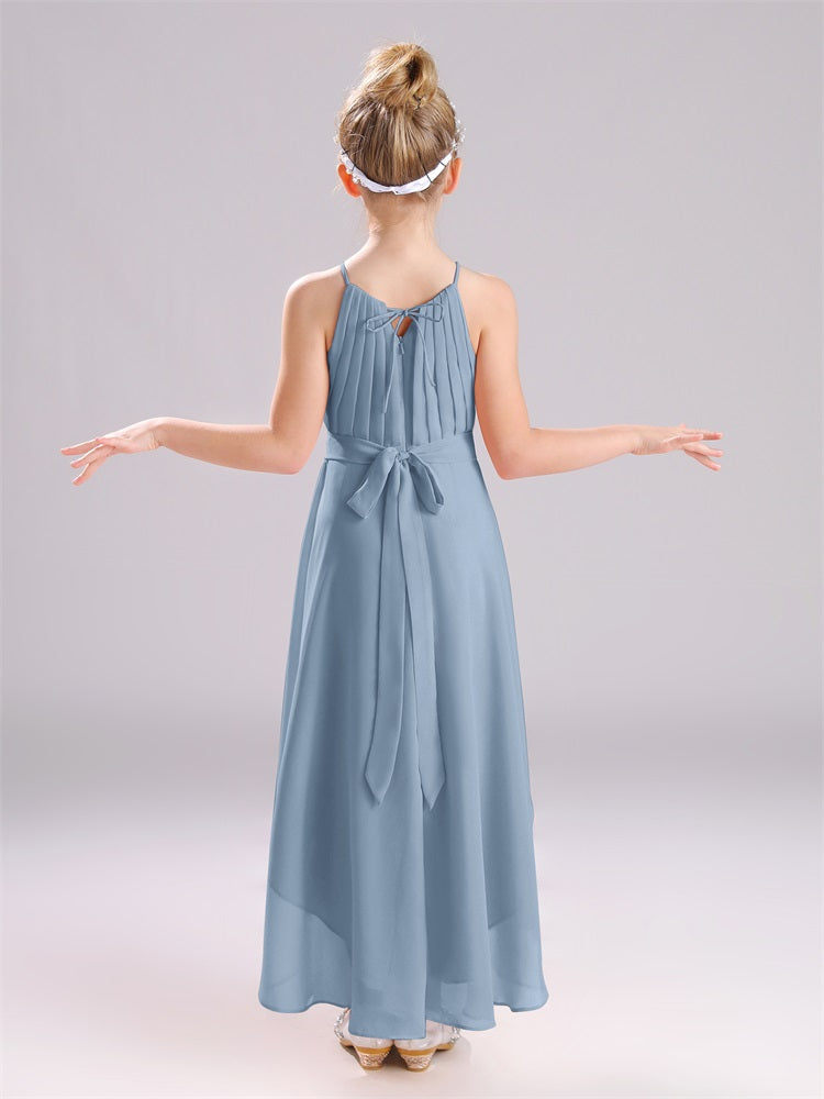 Dieses ärmellose, lange Chiffonkleid mit Neckholder und Plisseefalten wurde speziell für junge Brautjungfern angefertigt und strahlt Eleganz und Raffinesse aus. Die raffinierten Falten und der luftige Chiffonstoff sorgen für eine schmeichelhafte Silhouette und machen es perfekt für jeden Anlass. Ihre jungen Brautjungfern werden sich den ganzen Tag über wohlfühlen und elegant aussehen.