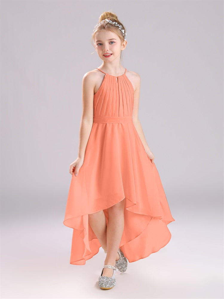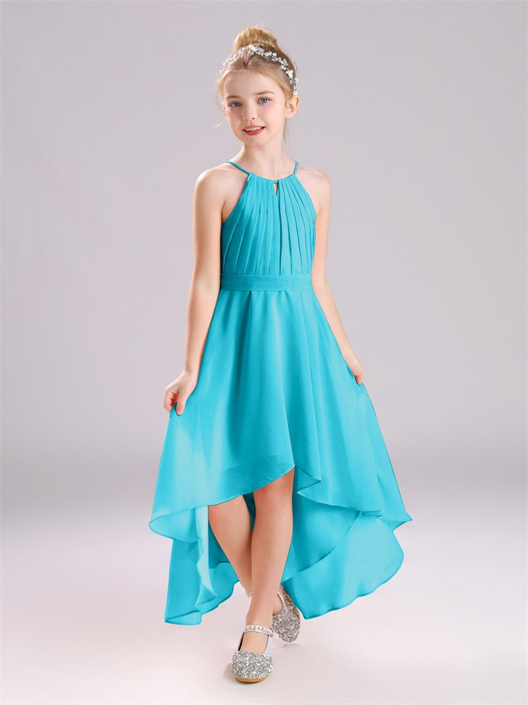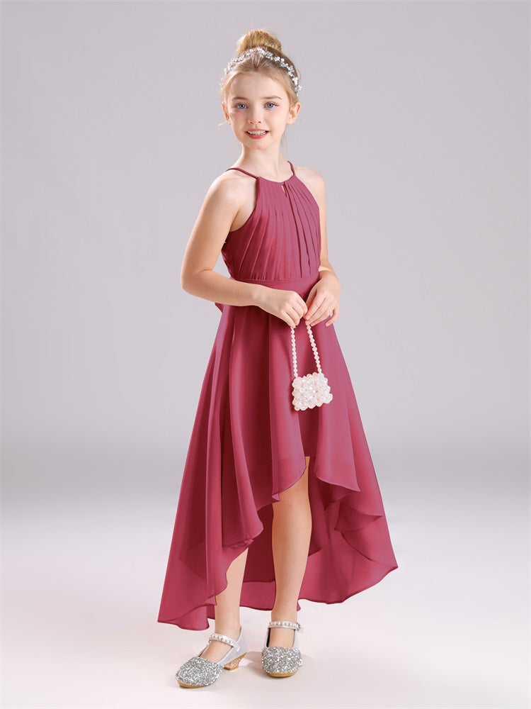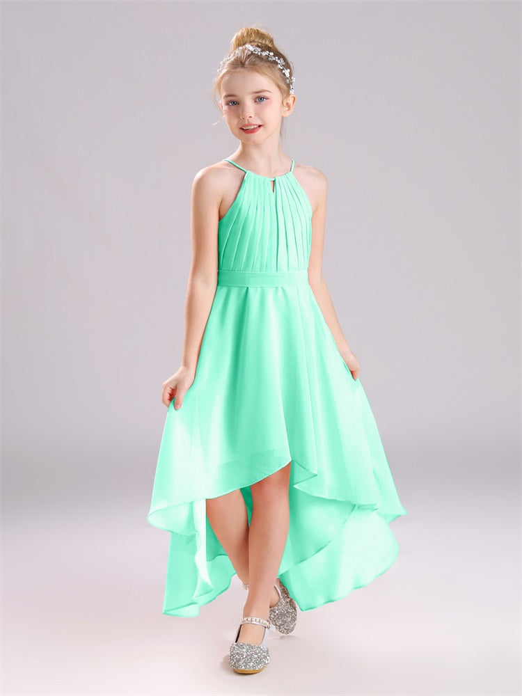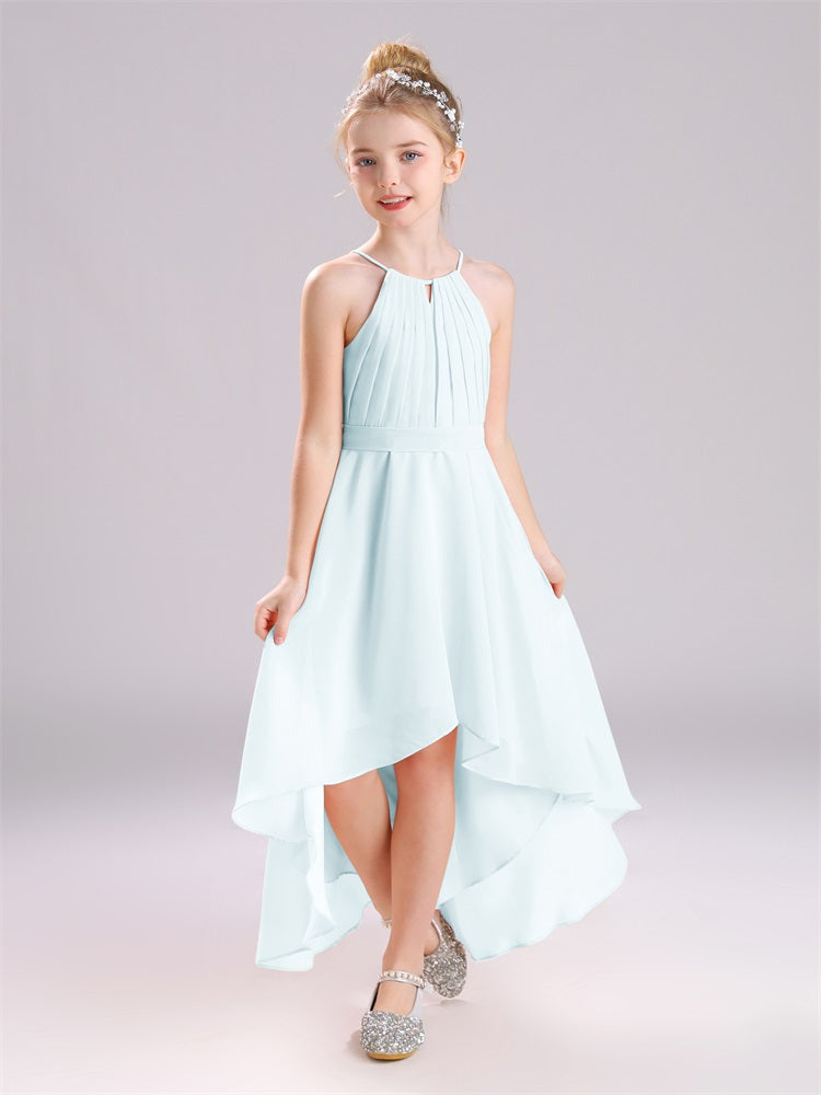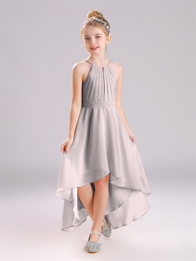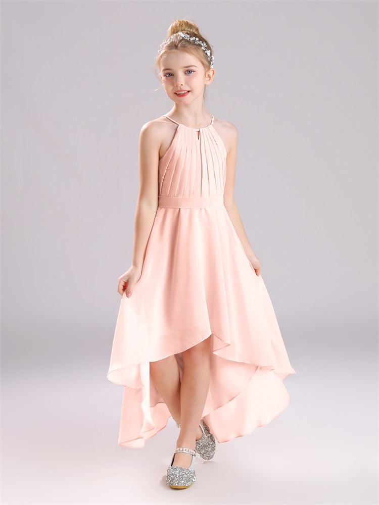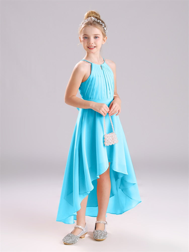 Dieses ärmellose, lange Chiffonkleid mit Neckholder und Plisseefalten wurde speziell für junge Brautjungfern angefertigt und strahlt Eleganz und Raffinesse aus. Die raffinierten Falten und der luftige Chiffonstoff sorgen für eine schmeichelhafte Silhouette und machen es perfekt für jeden Anlass. Ihre jungen Brautjungfern werden sich den ganzen Tag über wohlfühlen und elegant aussehen.
