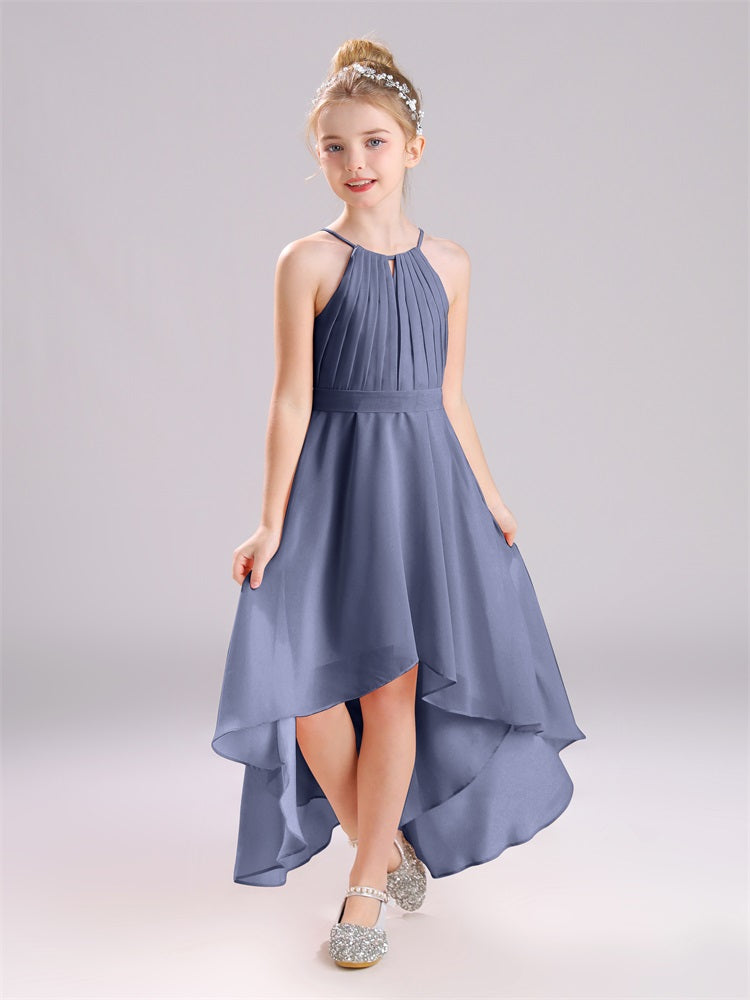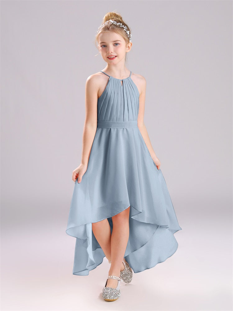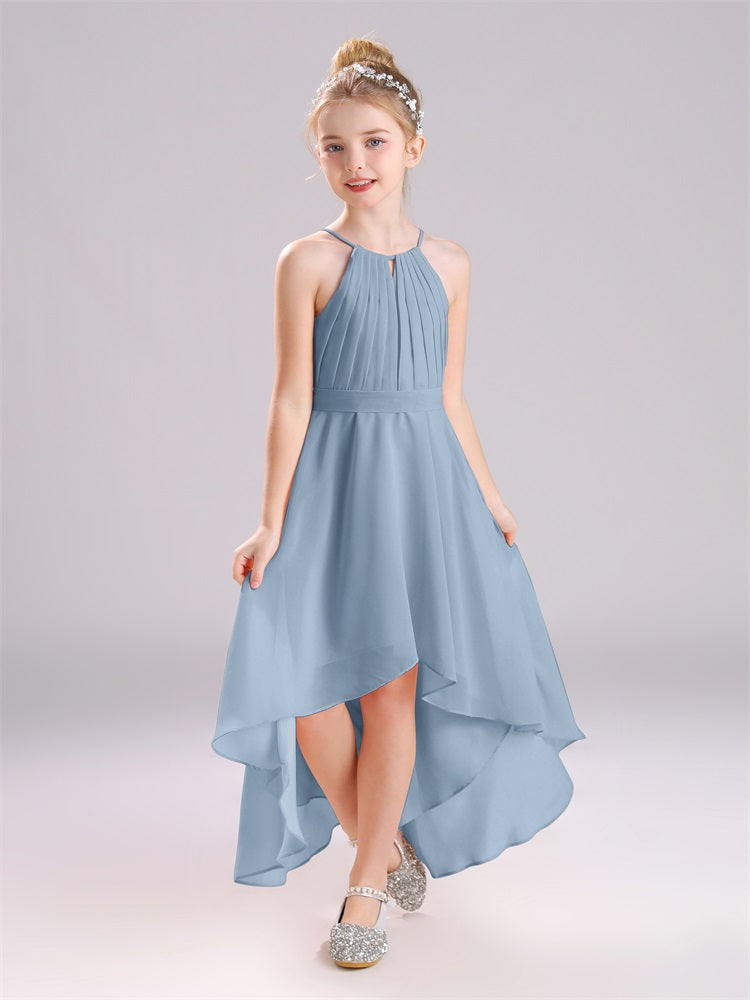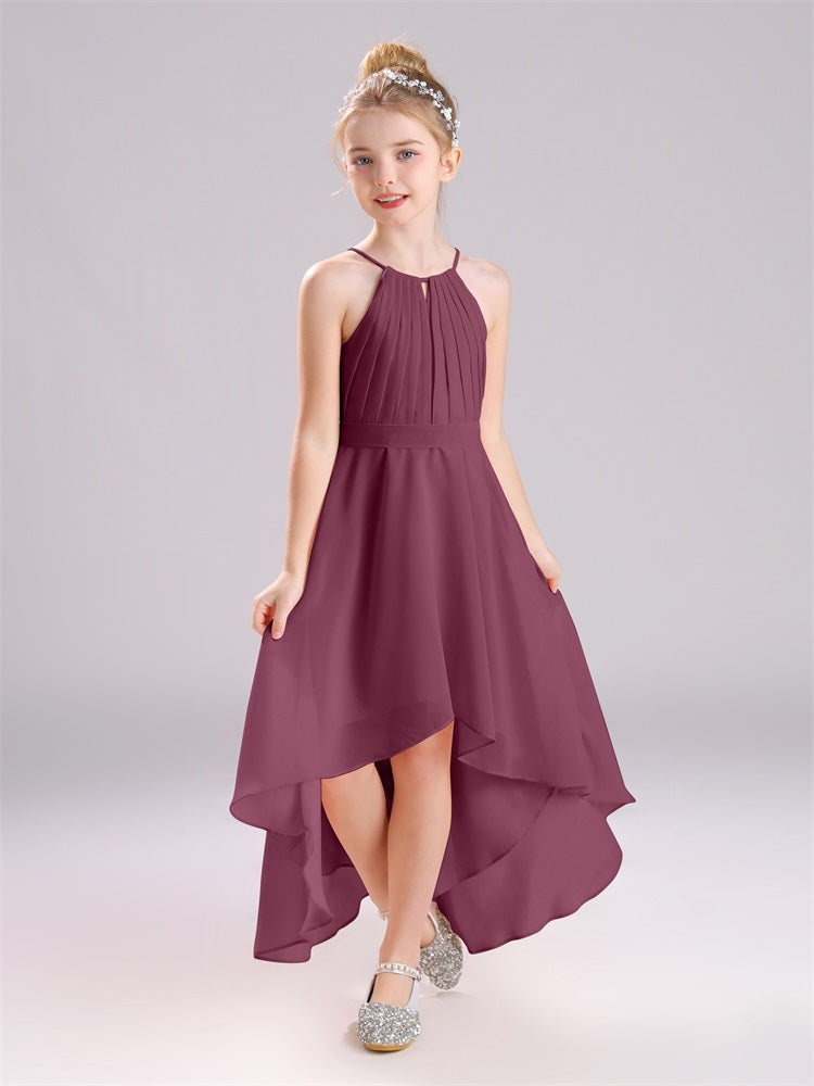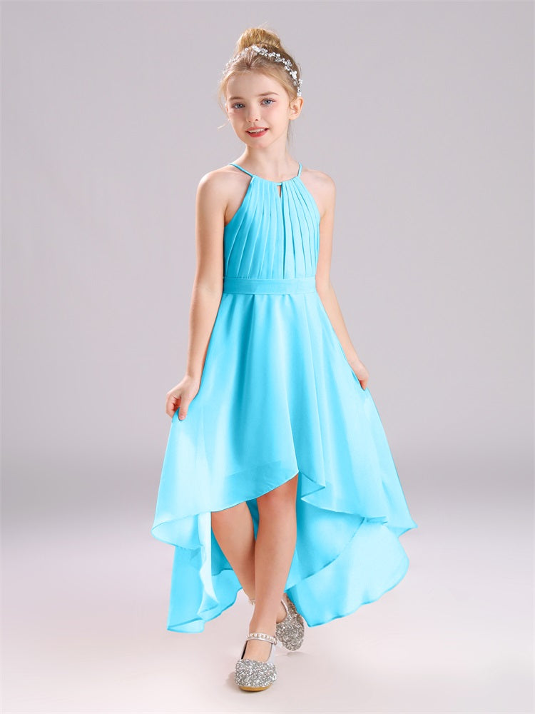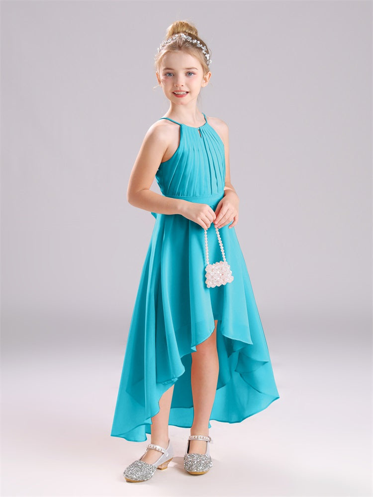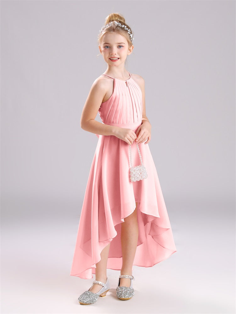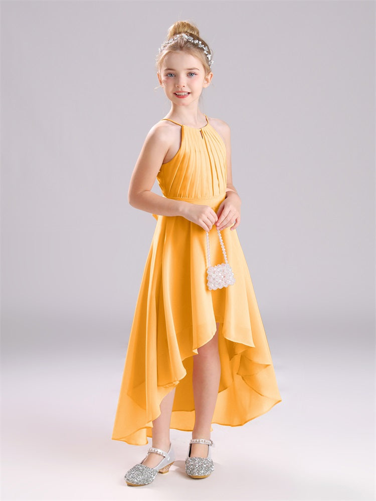 Dieses ärmellose, lange Chiffonkleid mit Neckholder und Plisseefalten wurde speziell für junge Brautjungfern angefertigt und strahlt Eleganz und Raffinesse aus. Die raffinierten Falten und der luftige Chiffonstoff sorgen für eine schmeichelhafte Silhouette und machen es perfekt für jeden Anlass. Ihre jungen Brautjungfern werden sich den ganzen Tag über wohlfühlen und elegant aussehen.