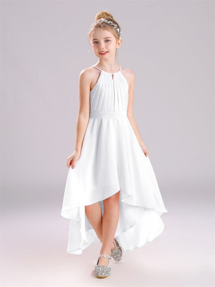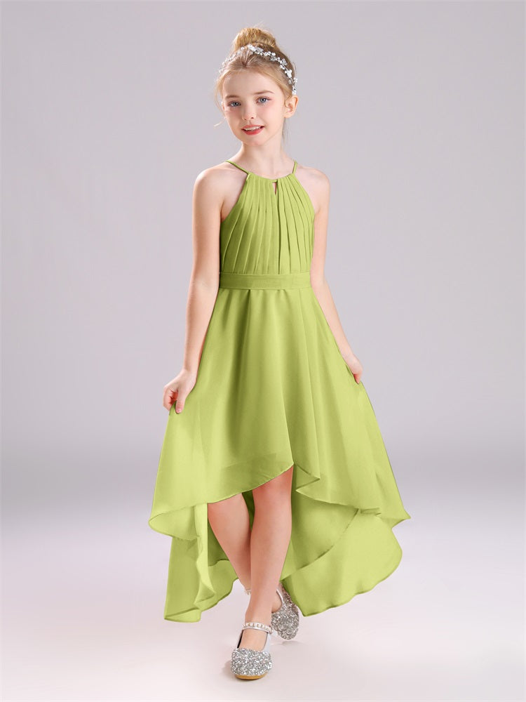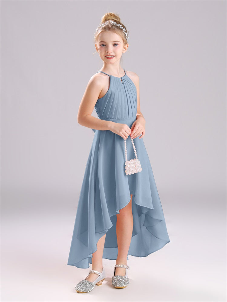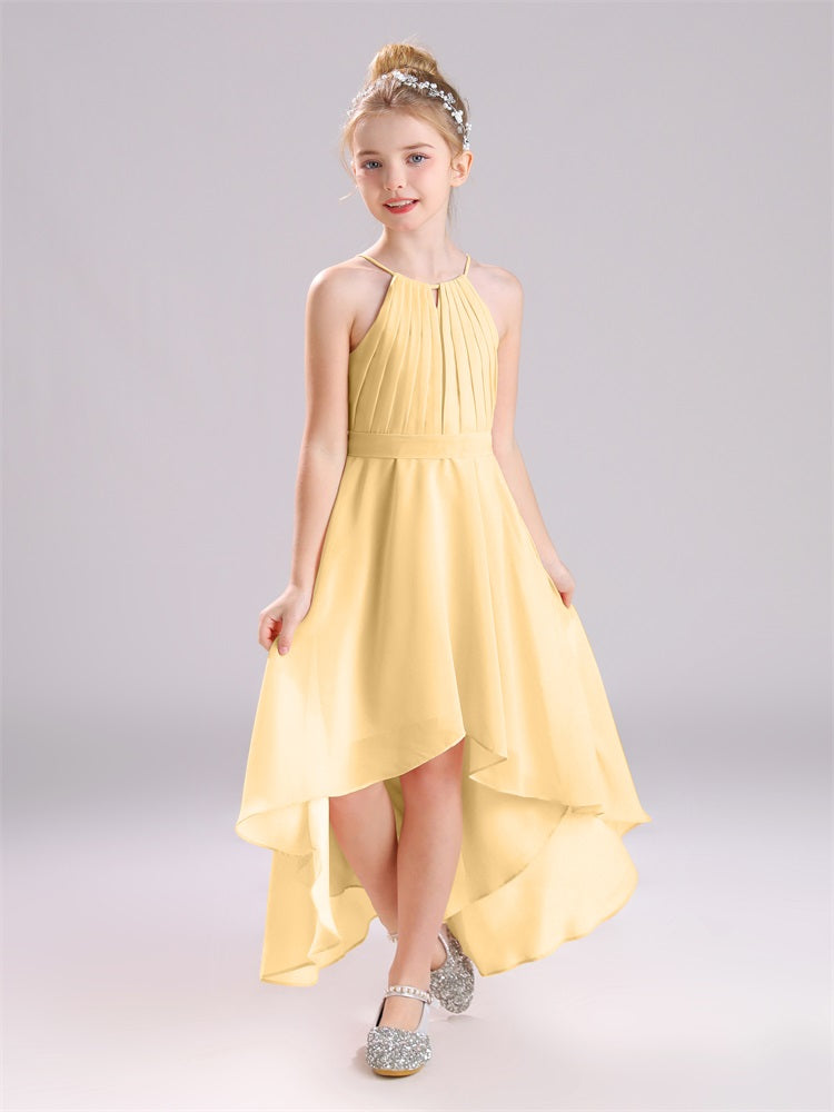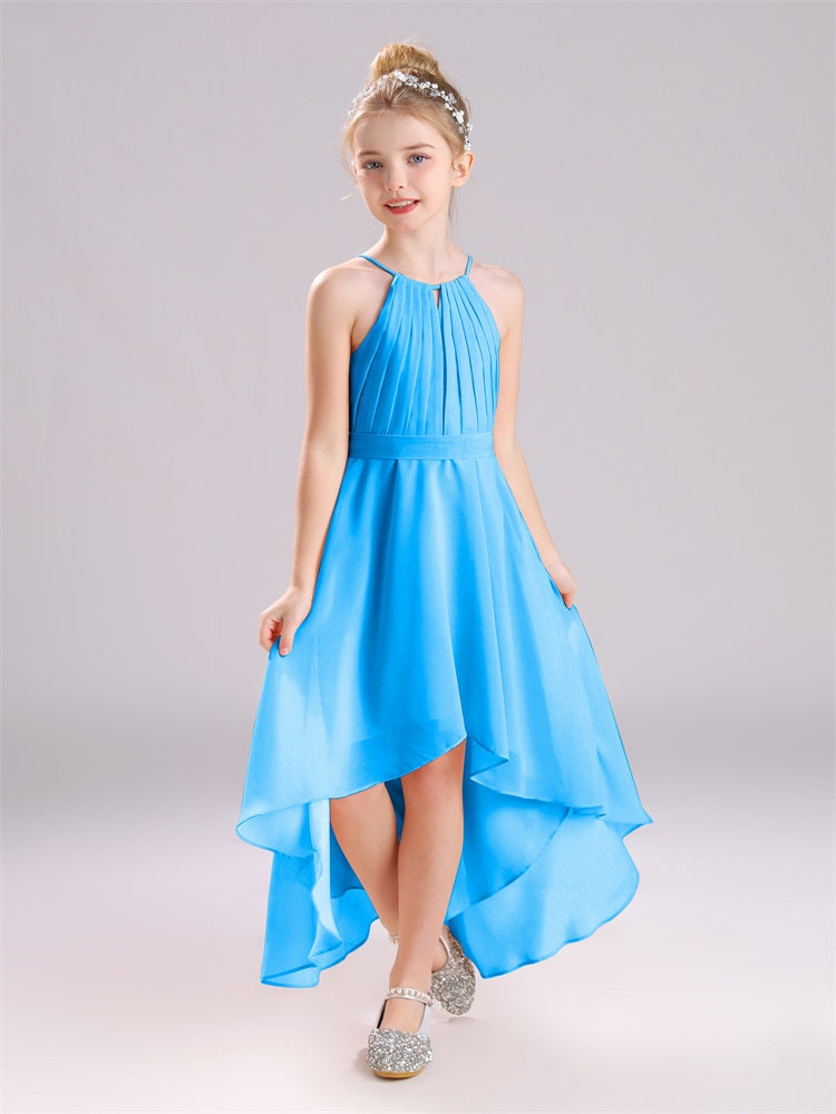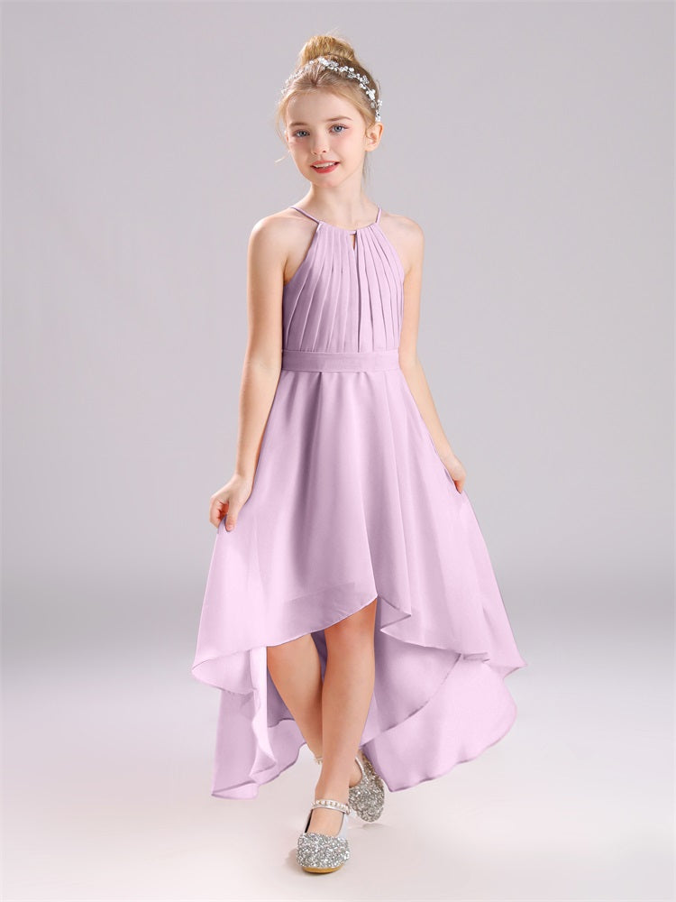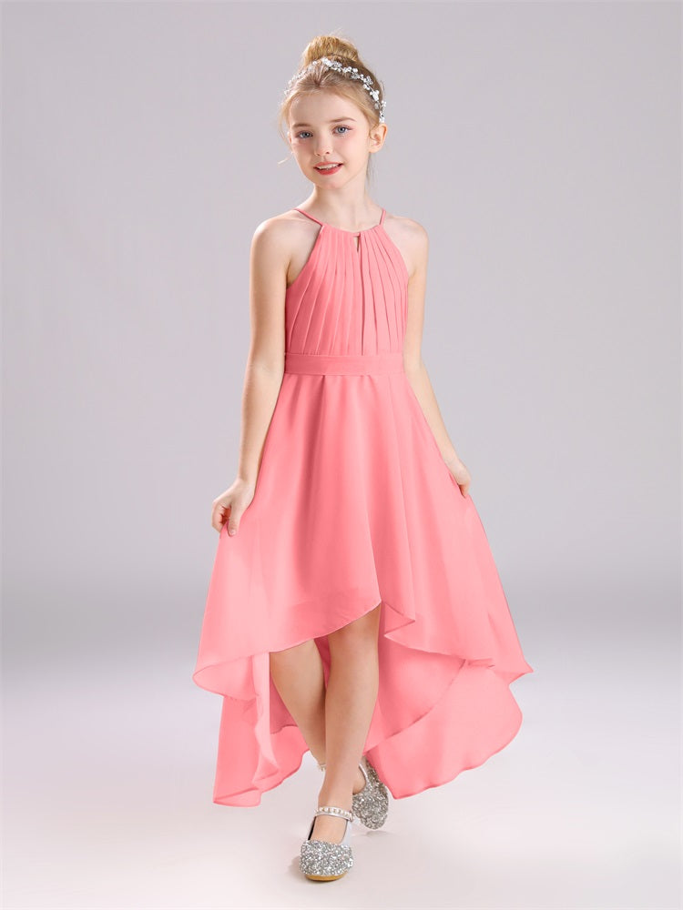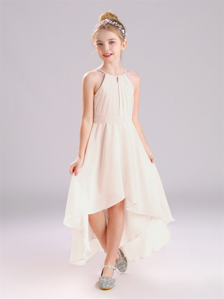 Dieses ärmellose, lange Chiffonkleid mit Neckholder und Plisseefalten wurde speziell für junge Brautjungfern angefertigt und strahlt Eleganz und Raffinesse aus. Die raffinierten Falten und der luftige Chiffonstoff sorgen für eine schmeichelhafte Silhouette und machen es perfekt für jeden Anlass. Ihre jungen Brautjungfern werden sich den ganzen Tag über wohlfühlen und elegant aussehen.