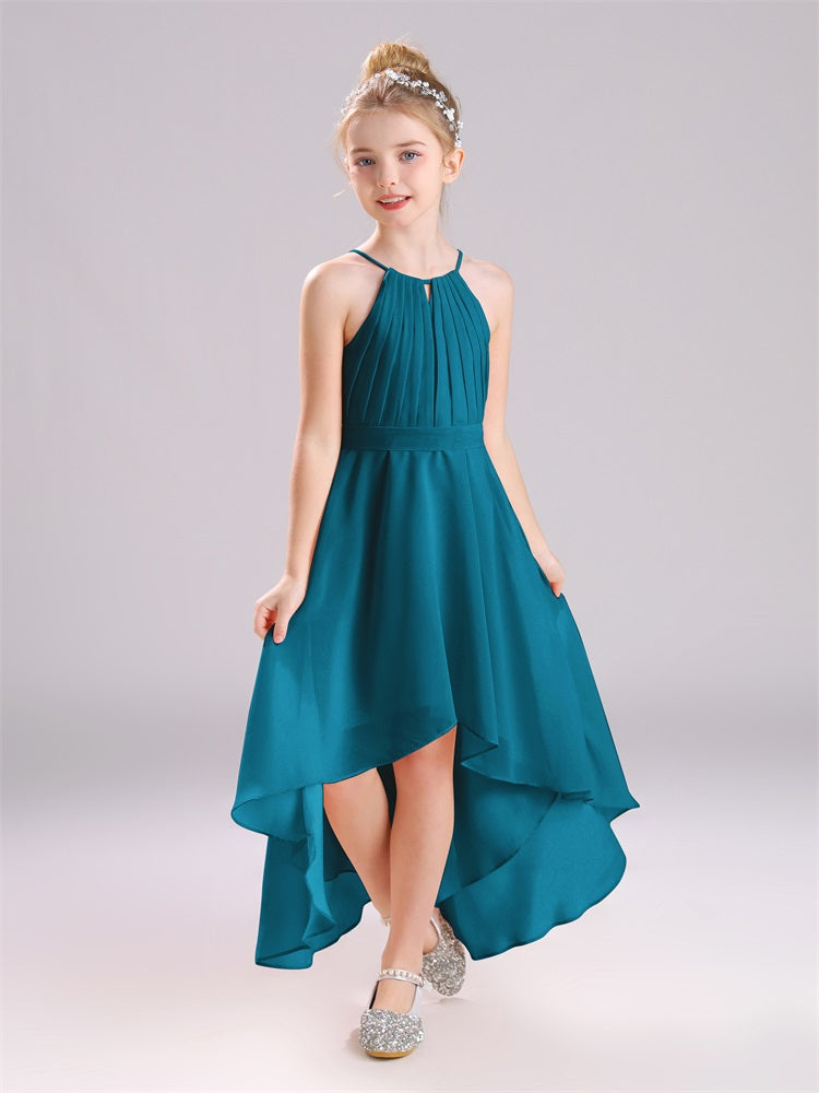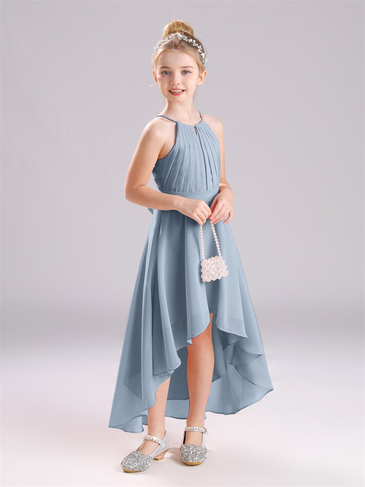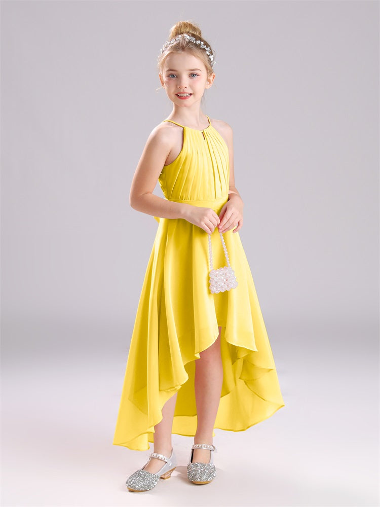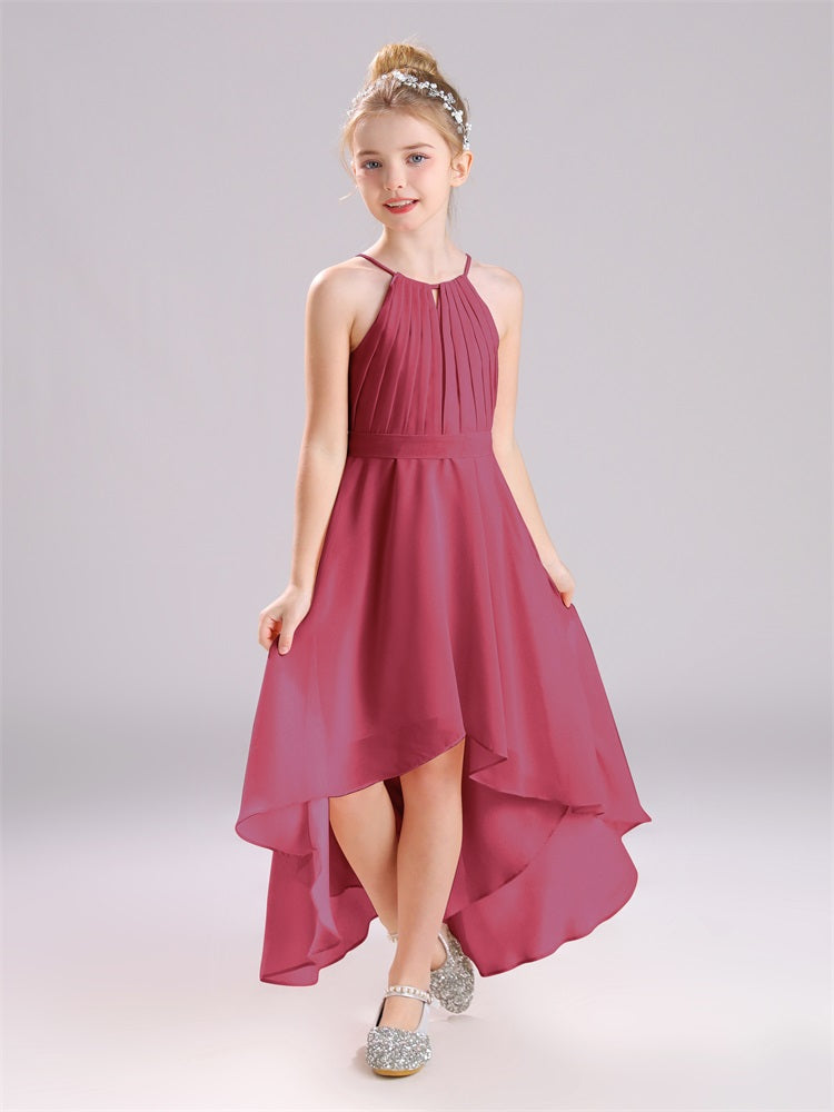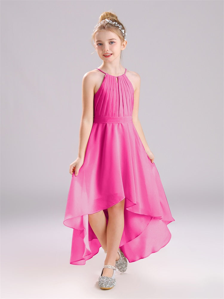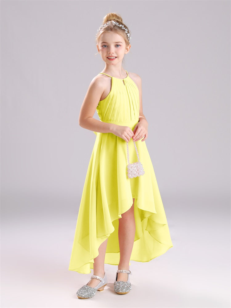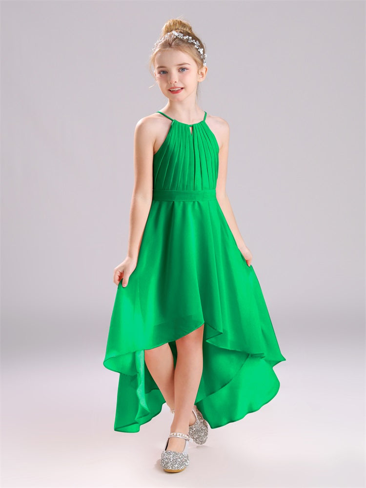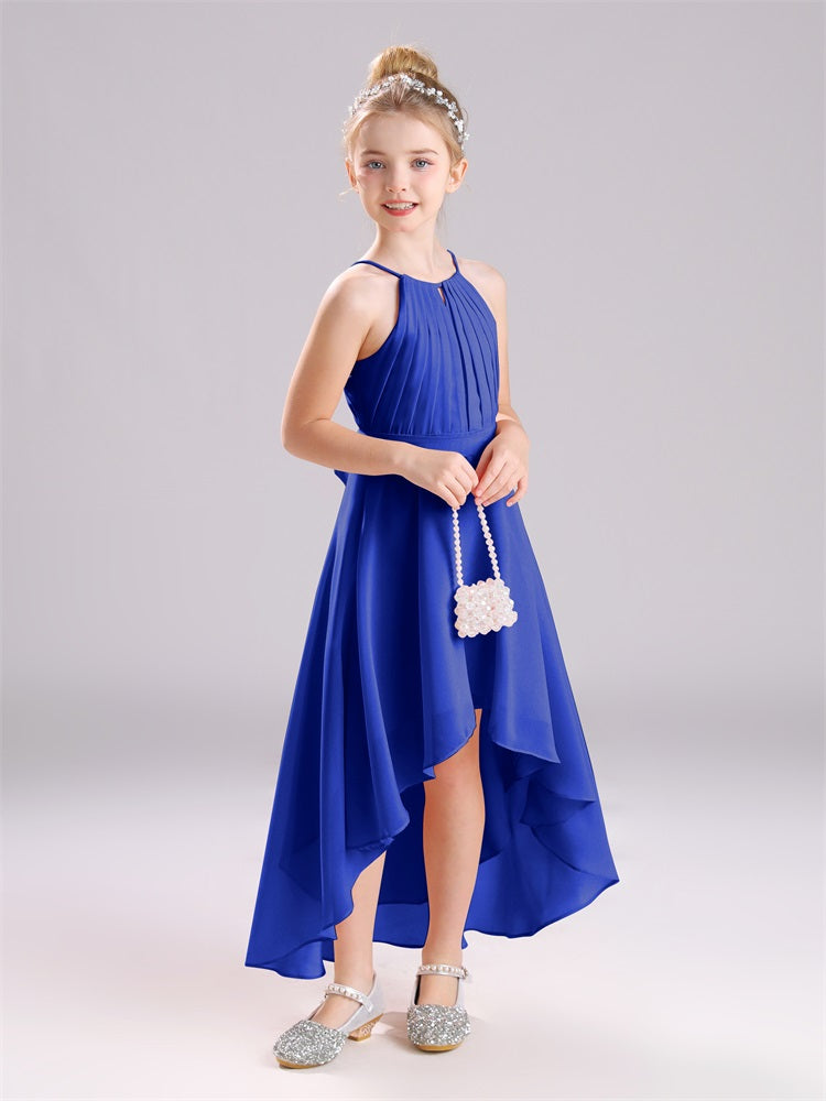 Dieses ärmellose, lange Chiffonkleid mit Neckholder und Plisseefalten wurde speziell für junge Brautjungfern angefertigt und strahlt Eleganz und Raffinesse aus. Die raffinierten Falten und der luftige Chiffonstoff sorgen für eine schmeichelhafte Silhouette und machen es perfekt für jeden Anlass. Ihre jungen Brautjungfern werden sich den ganzen Tag über wohlfühlen und elegant aussehen.