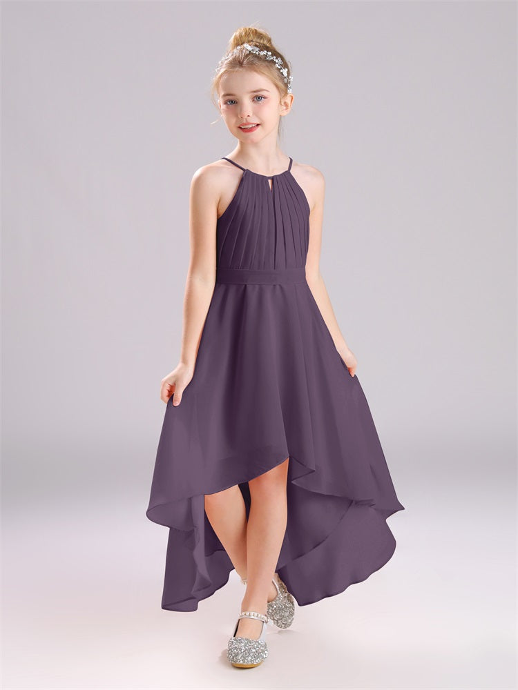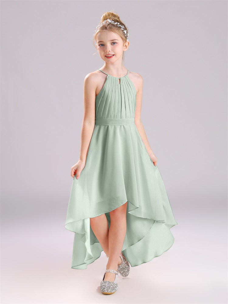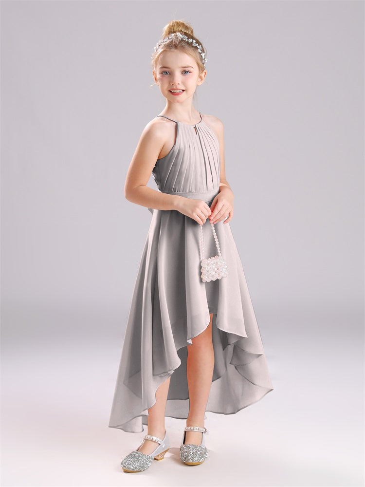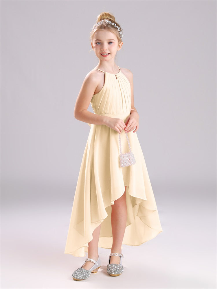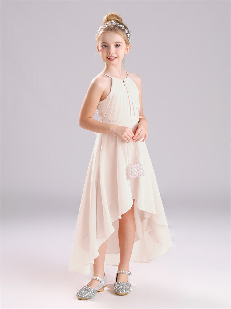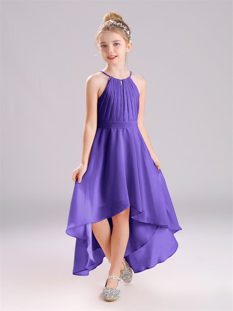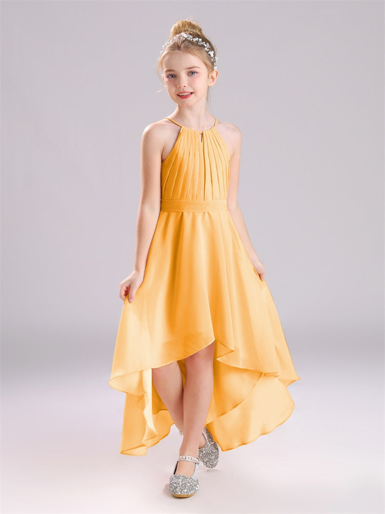 Dieses ärmellose, lange Chiffonkleid mit Neckholder und Plisseefalten wurde speziell für junge Brautjungfern angefertigt und strahlt Eleganz und Raffinesse aus. Die raffinierten Falten und der luftige Chiffonstoff sorgen für eine schmeichelhafte Silhouette und machen es perfekt für jeden Anlass. Ihre jungen Brautjungfern werden sich den ganzen Tag über wohlfühlen und elegant aussehen.