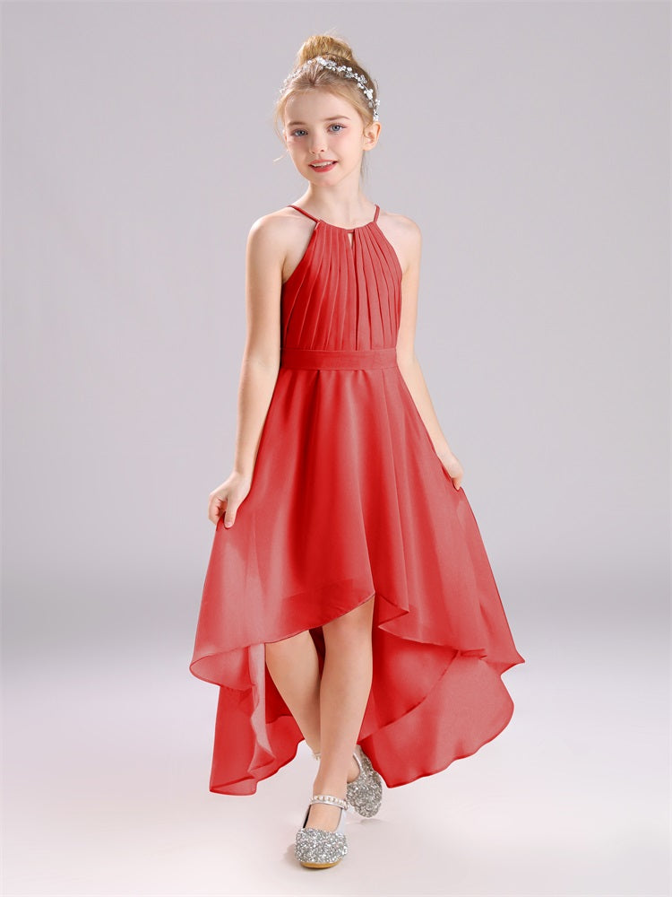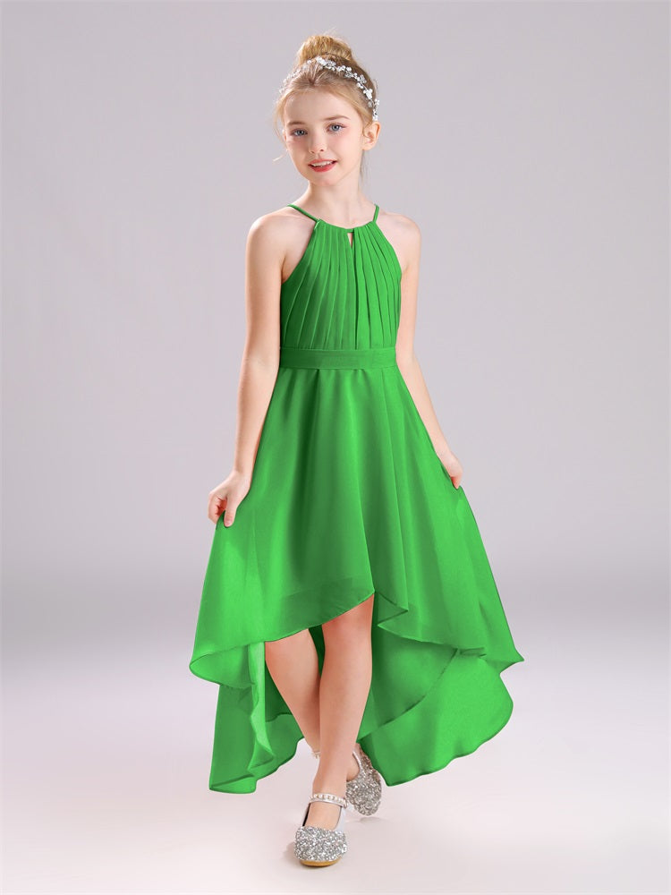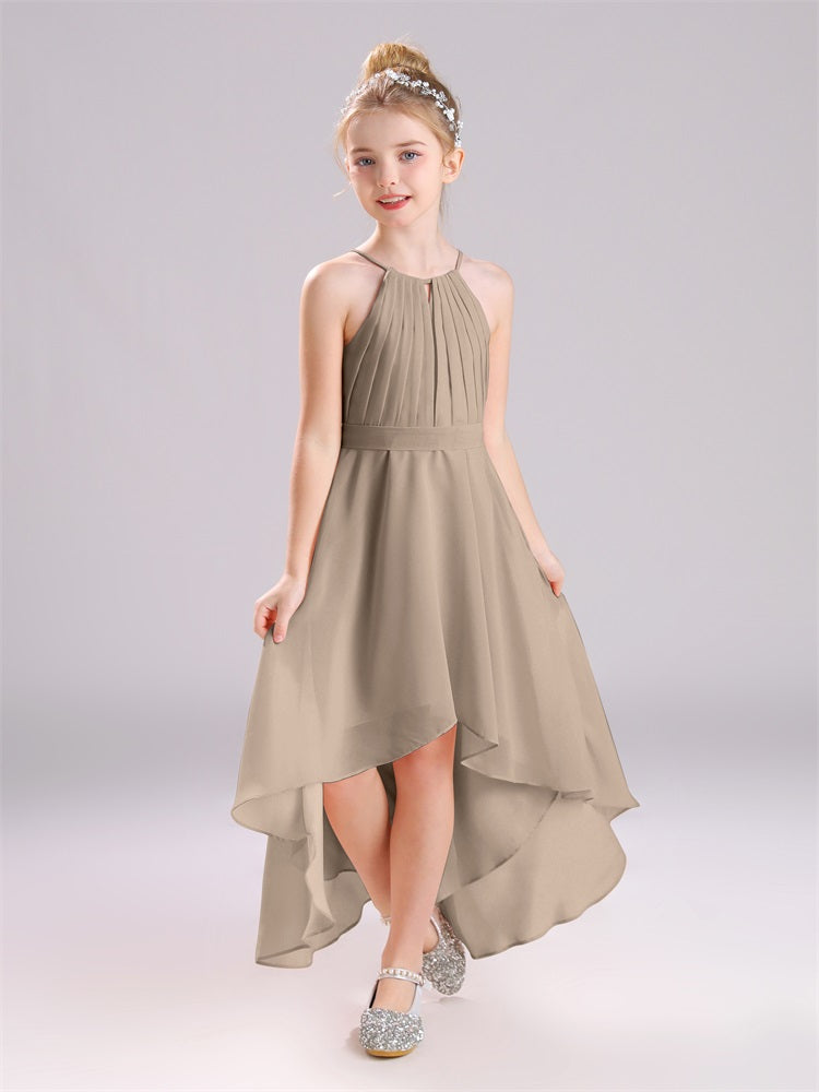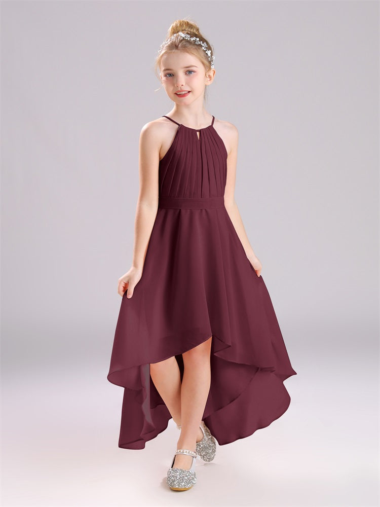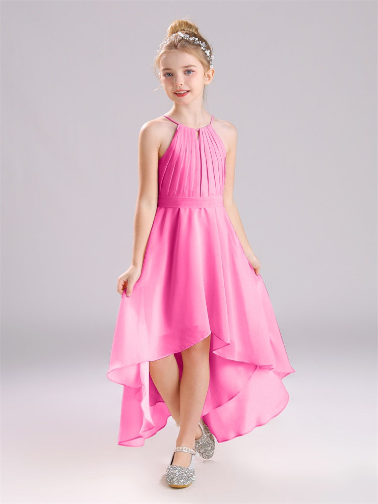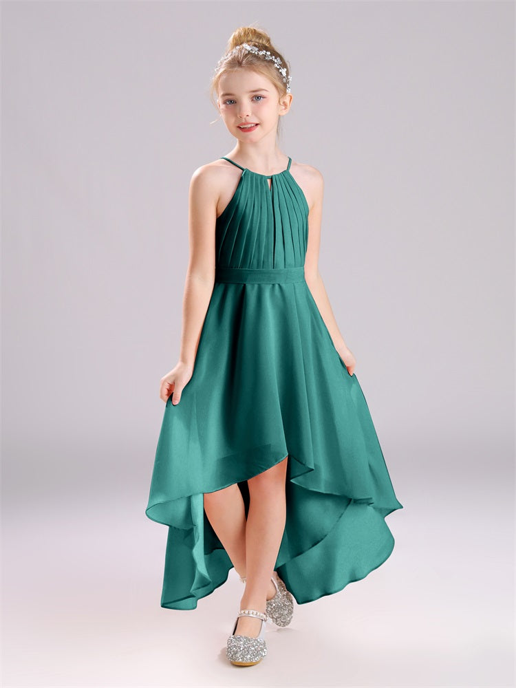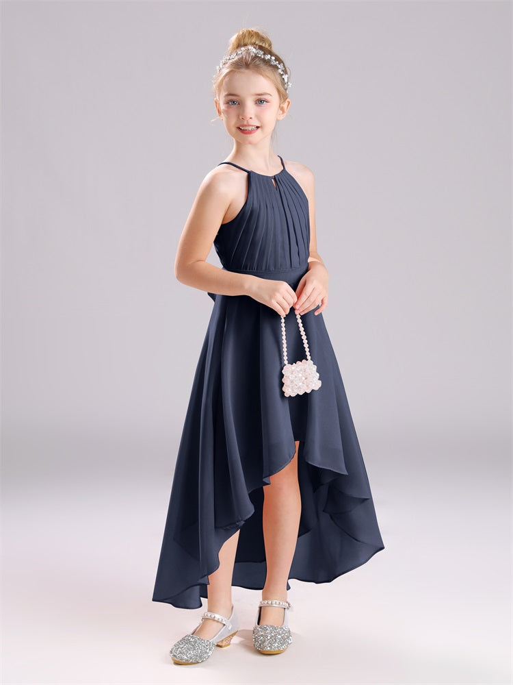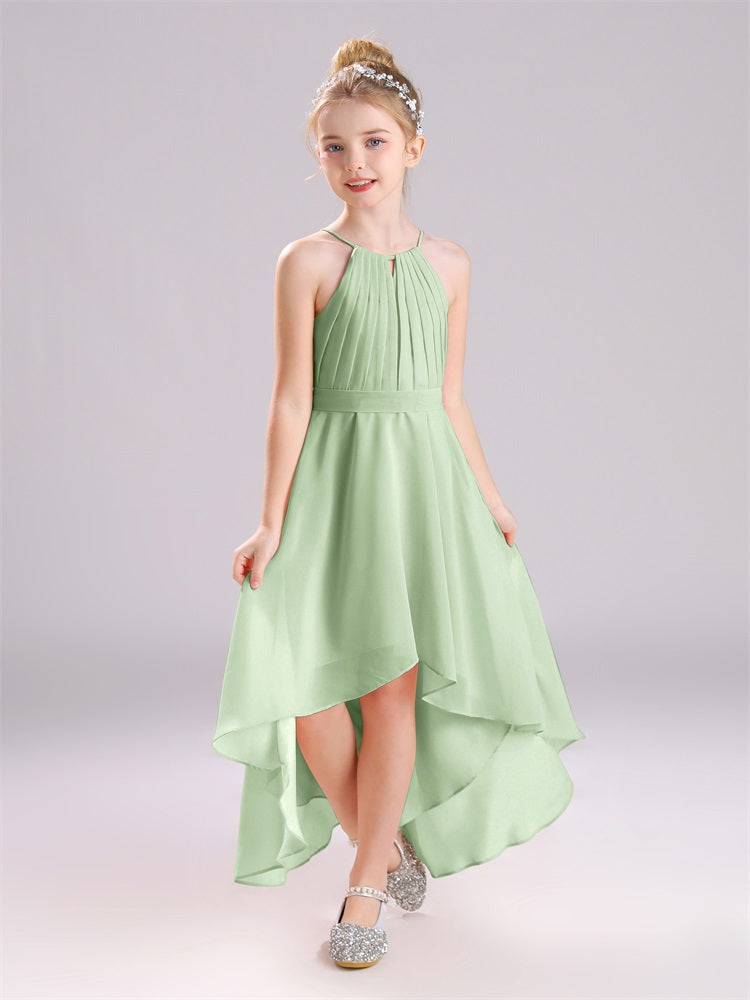 Dieses ärmellose, lange Chiffonkleid mit Neckholder und Plisseefalten wurde speziell für junge Brautjungfern angefertigt und strahlt Eleganz und Raffinesse aus. Die raffinierten Falten und der luftige Chiffonstoff sorgen für eine schmeichelhafte Silhouette und machen es perfekt für jeden Anlass. Ihre jungen Brautjungfern werden sich den ganzen Tag über wohlfühlen und elegant aussehen.