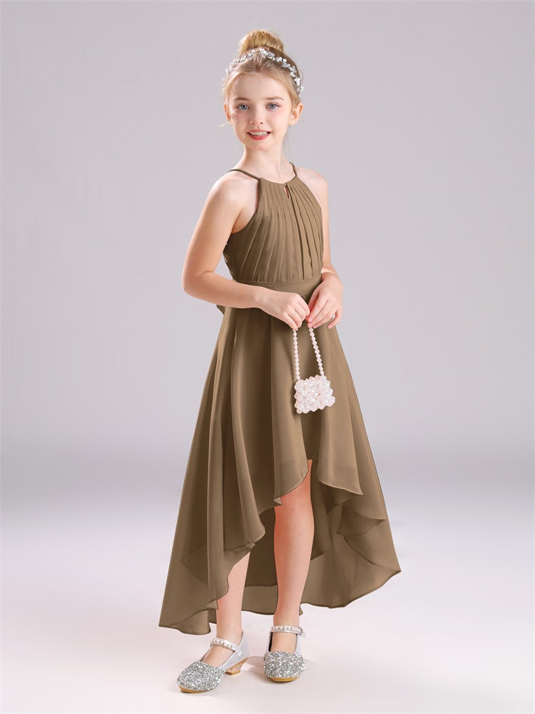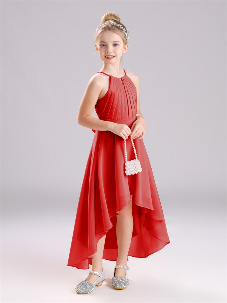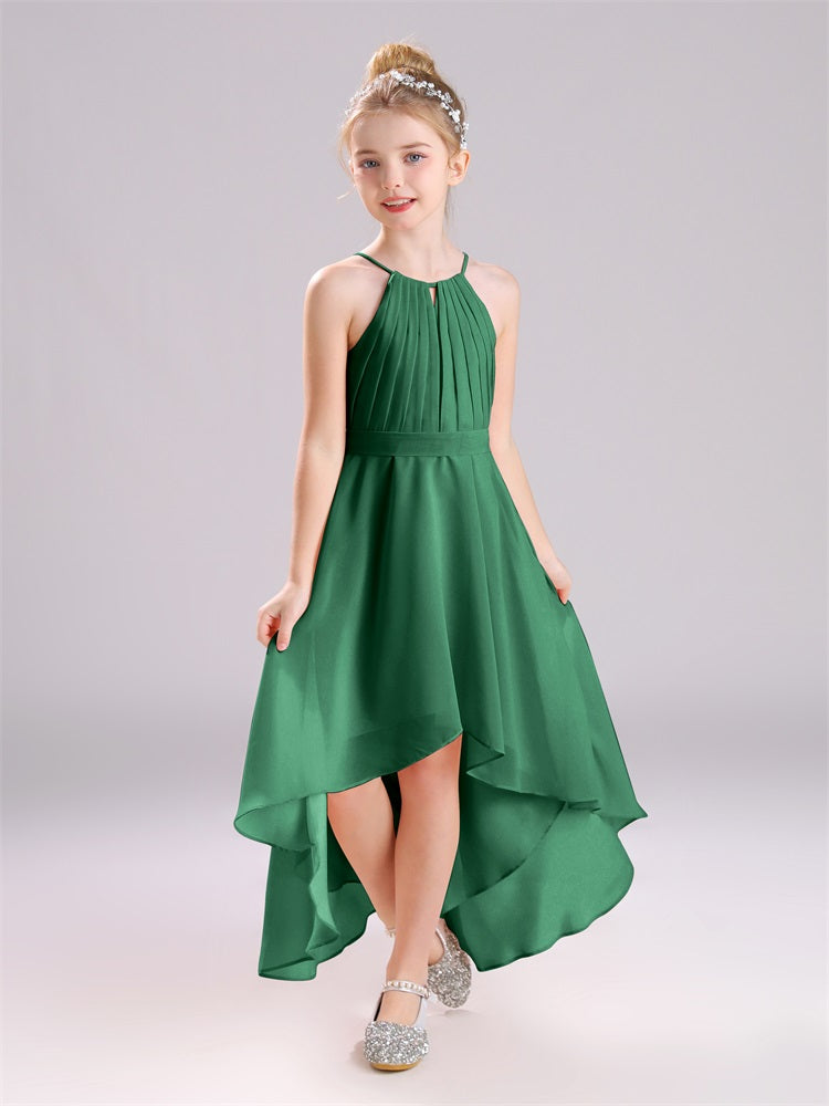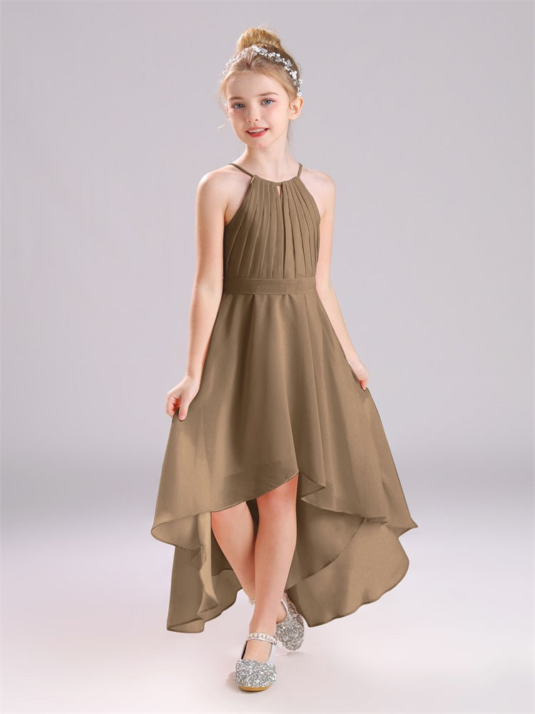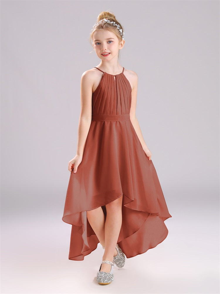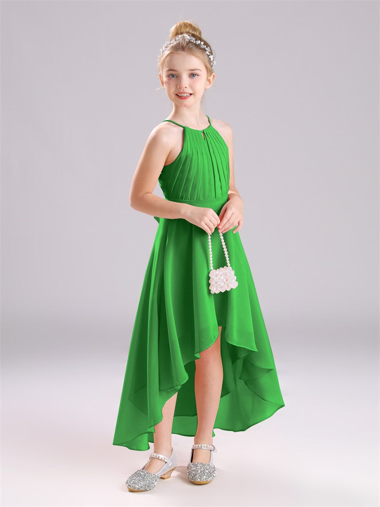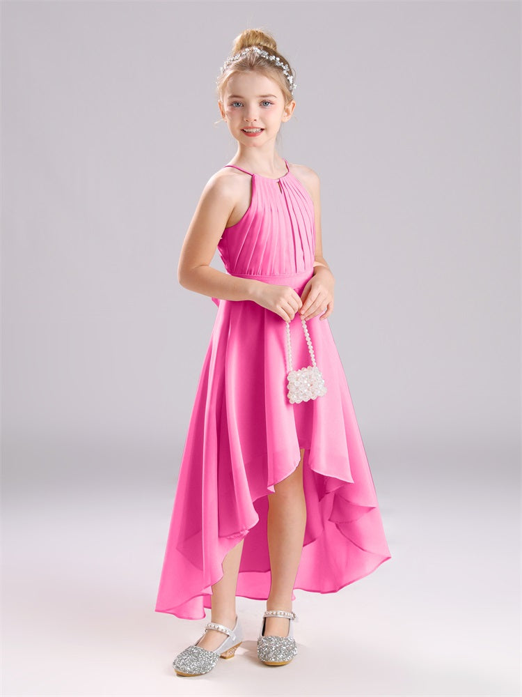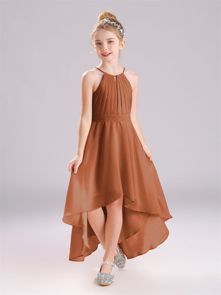 Dieses ärmellose, lange Chiffonkleid mit Neckholder und Plisseefalten wurde speziell für junge Brautjungfern angefertigt und strahlt Eleganz und Raffinesse aus. Die raffinierten Falten und der luftige Chiffonstoff sorgen für eine schmeichelhafte Silhouette und machen es perfekt für jeden Anlass. Ihre jungen Brautjungfern werden sich den ganzen Tag über wohlfühlen und elegant aussehen.