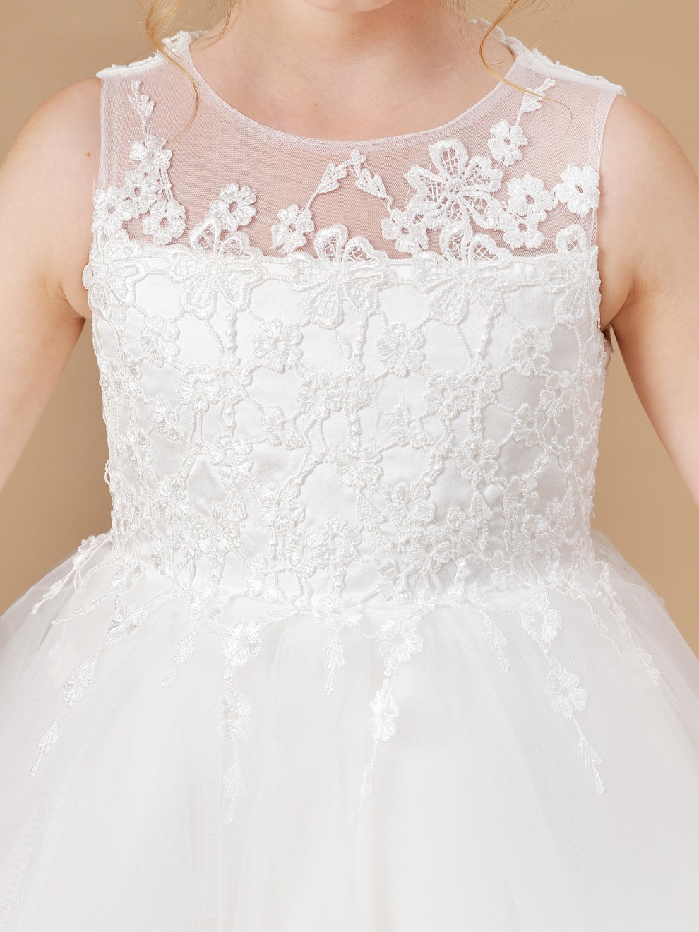 Hübsches ärmelloses Spitzenapplikationen langes Blumenmädchenkleid