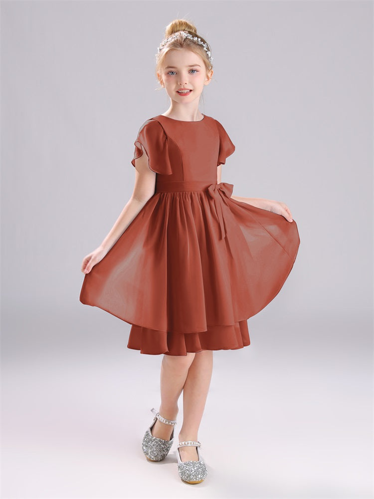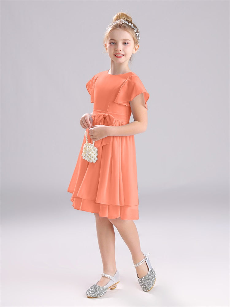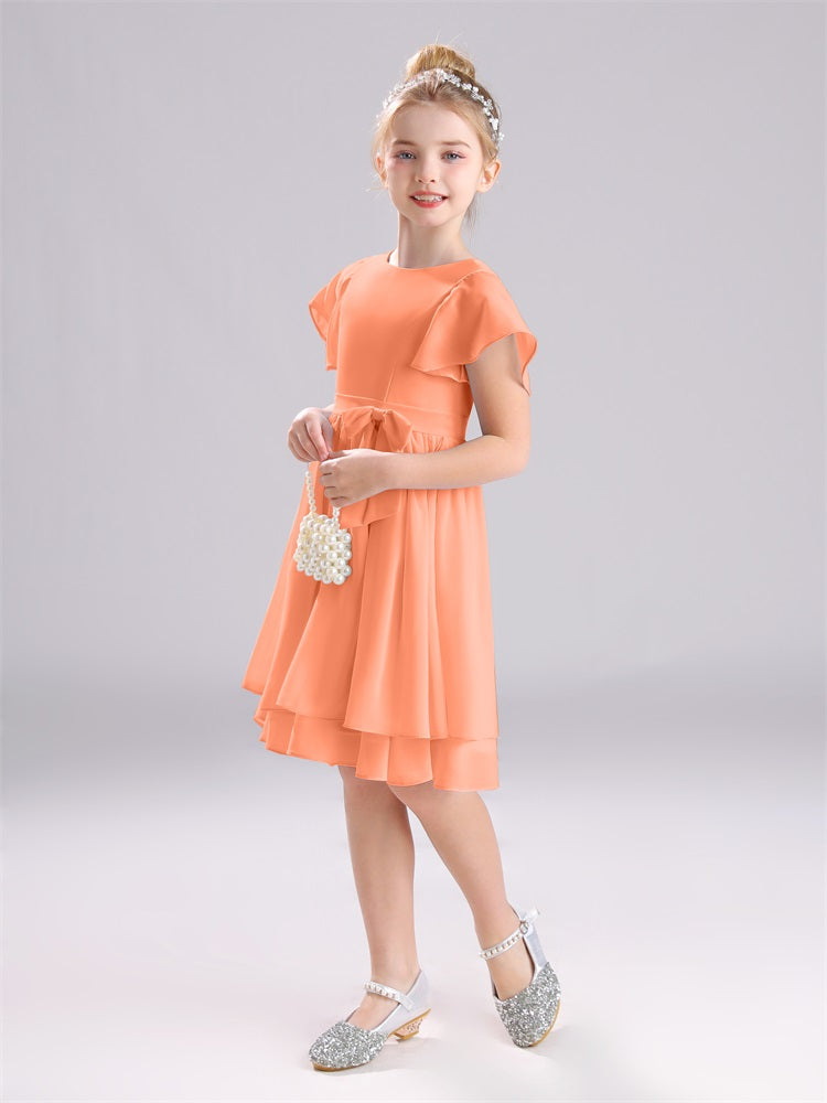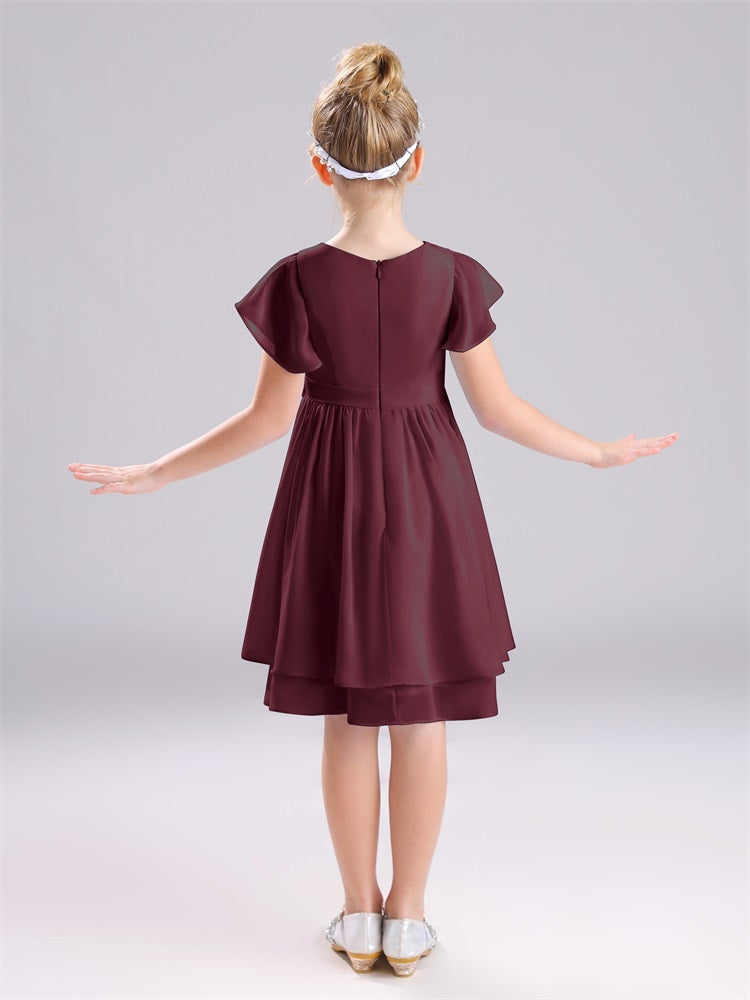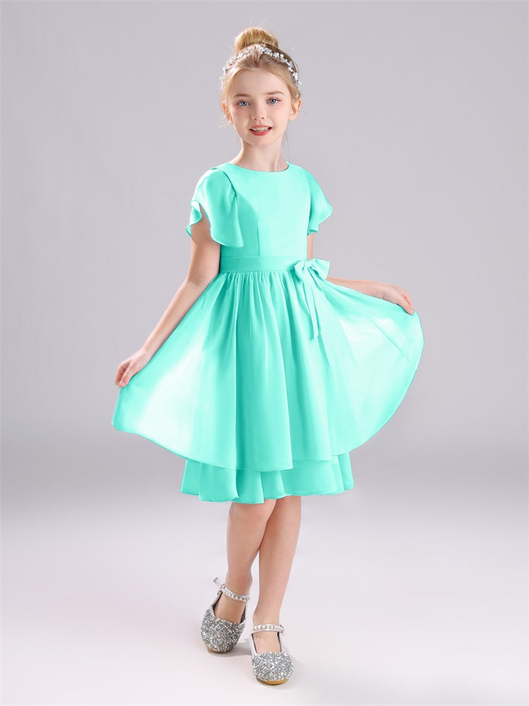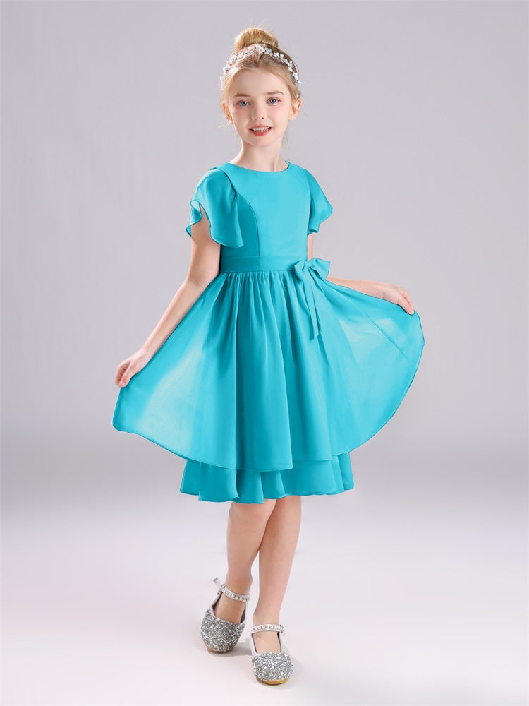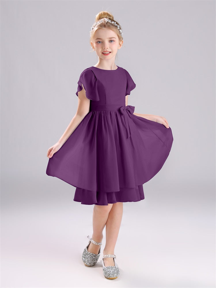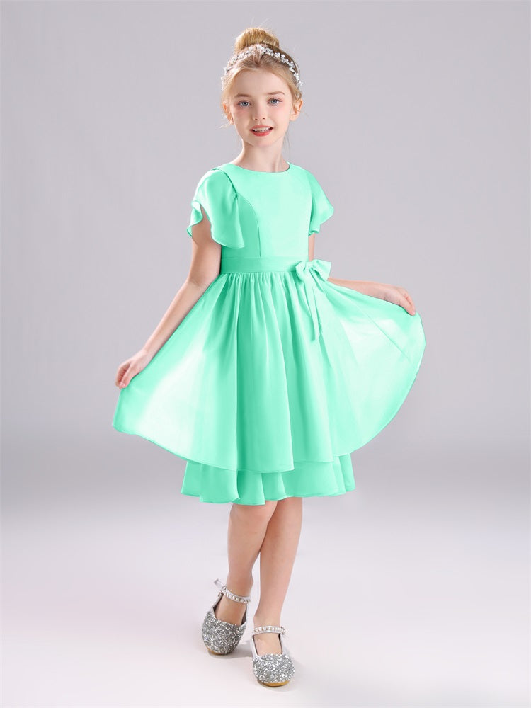 Mit unseren knielangen Chiffon-Brautjungfernkleidern in Juwelen-A-Linie mit Ärmeln werten Sie jede Brautparty auf. Das raffinierte A-Linien-Design, das zarte Chiffonmaterial und der elegante Juwelenausschnitt sorgen für einen zeitlosen und schmeichelhaften Look für jede Junior-Brautjungfer. Perfekt für jede Hochzeit oder einen besonderen Anlass.