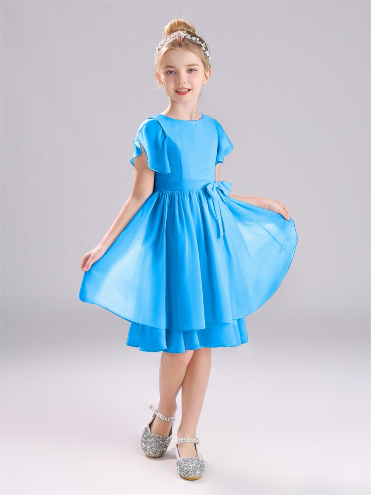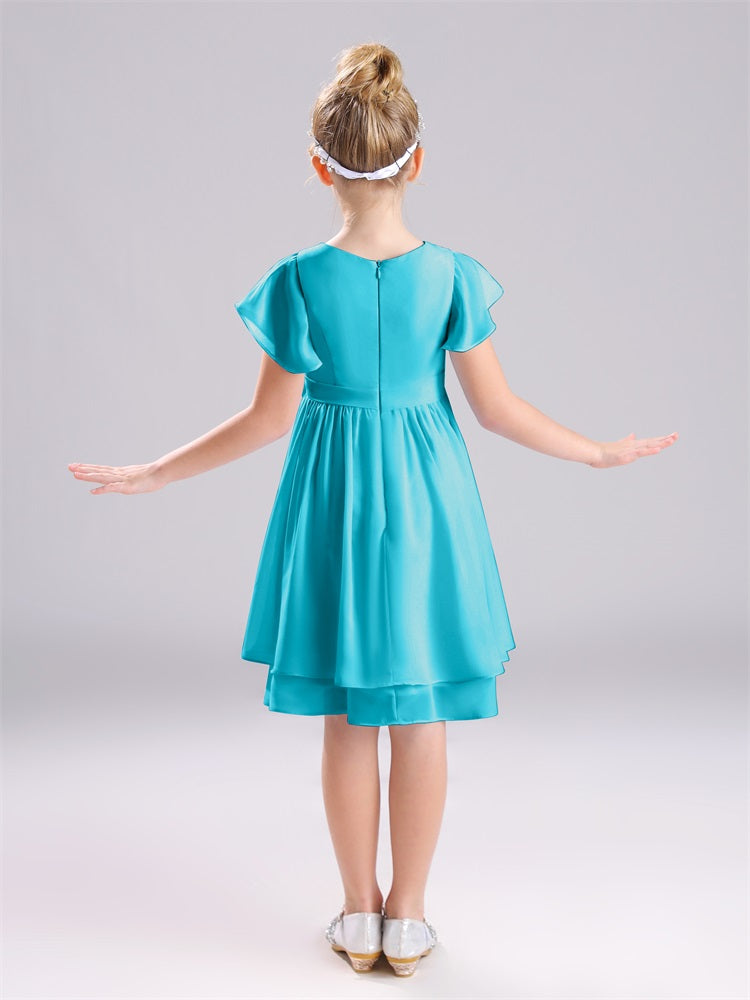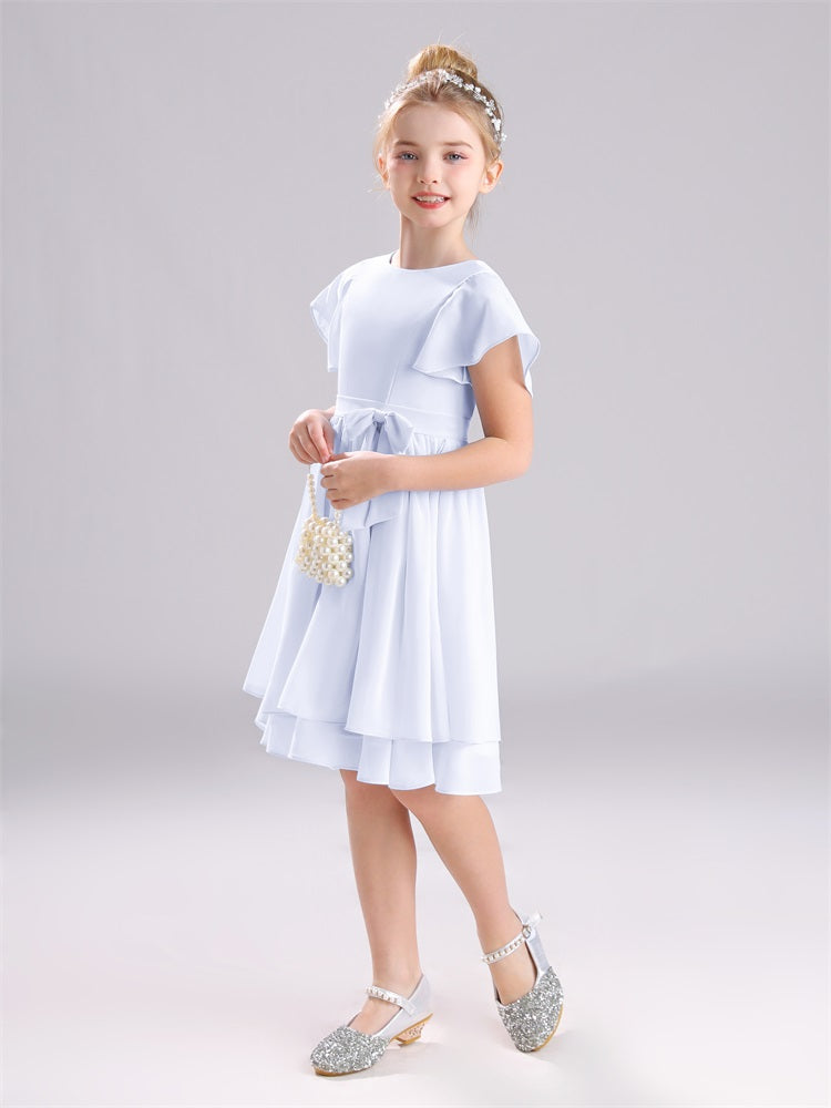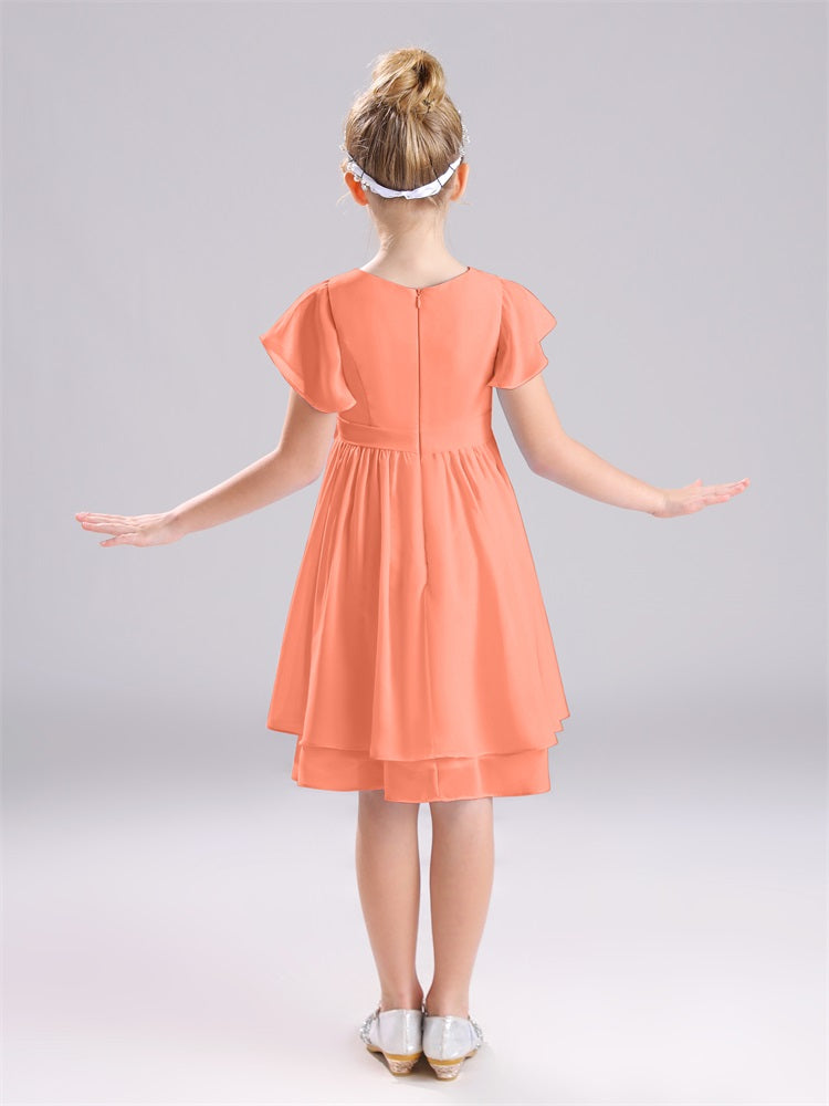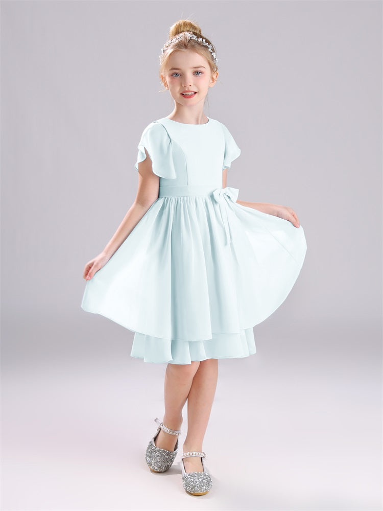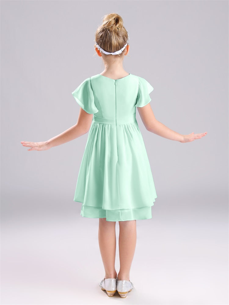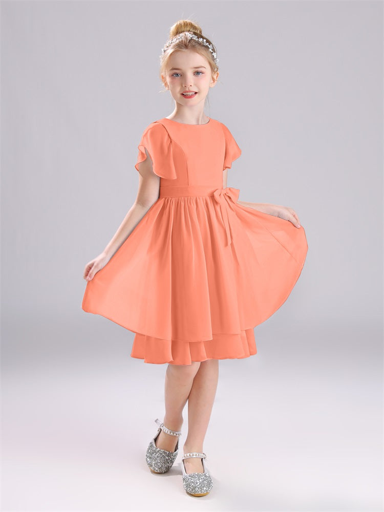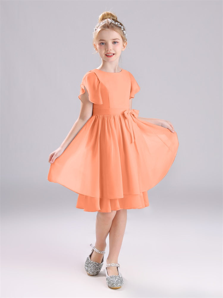 Mit unseren knielangen Chiffon-Brautjungfernkleidern in Juwelen-A-Linie mit Ärmeln werten Sie jede Brautparty auf. Das raffinierte A-Linien-Design, das zarte Chiffonmaterial und der elegante Juwelenausschnitt sorgen für einen zeitlosen und schmeichelhaften Look für jede Junior-Brautjungfer. Perfekt für jede Hochzeit oder einen besonderen Anlass.