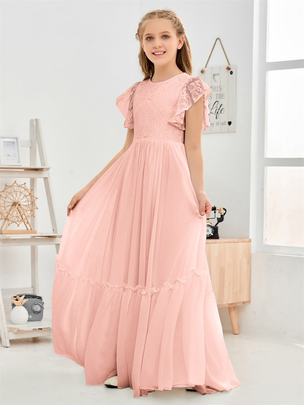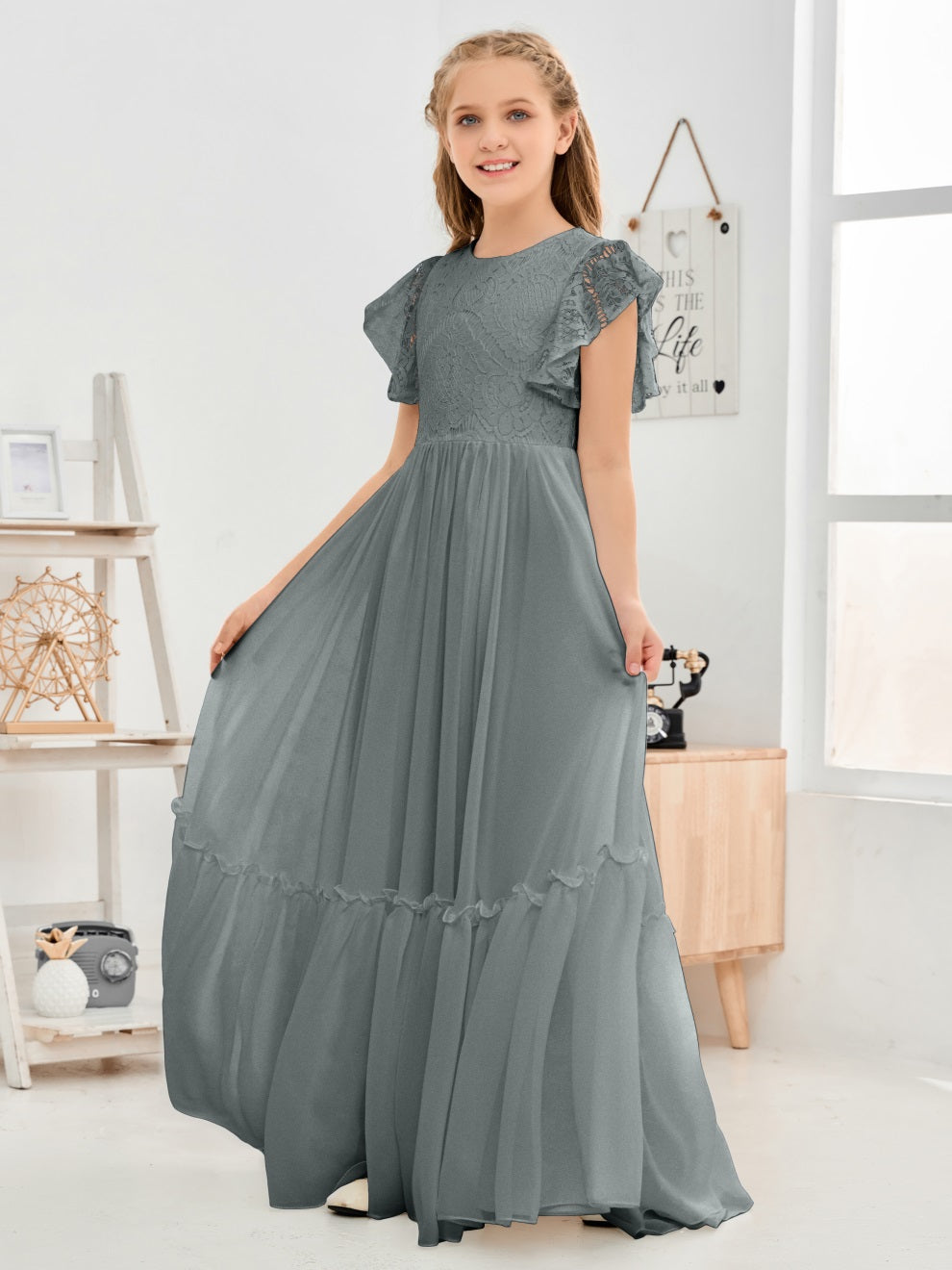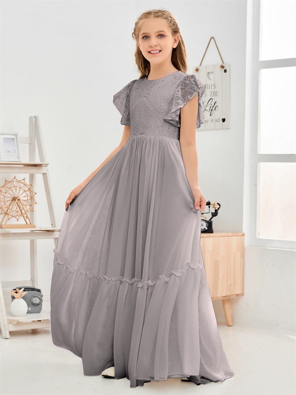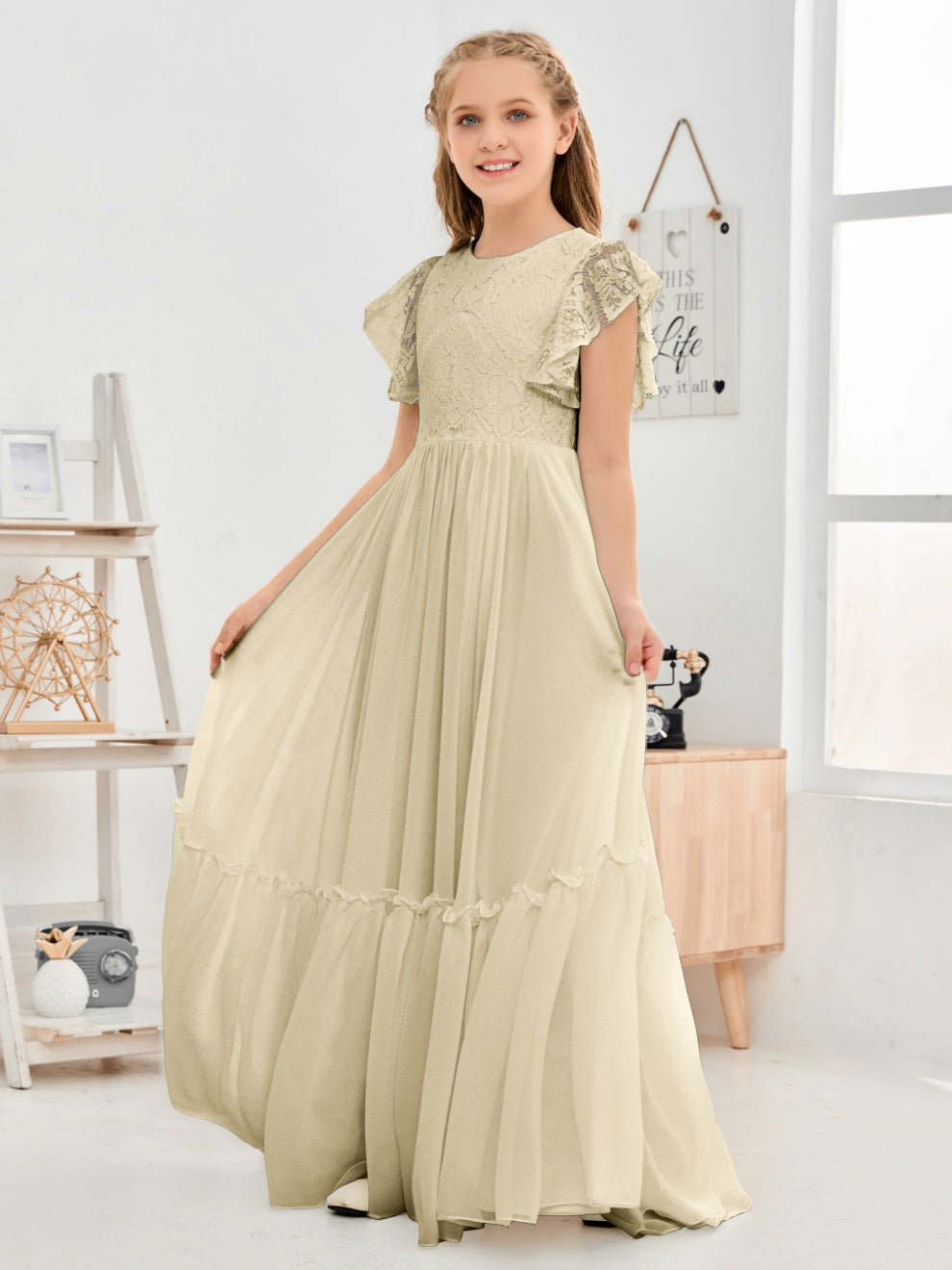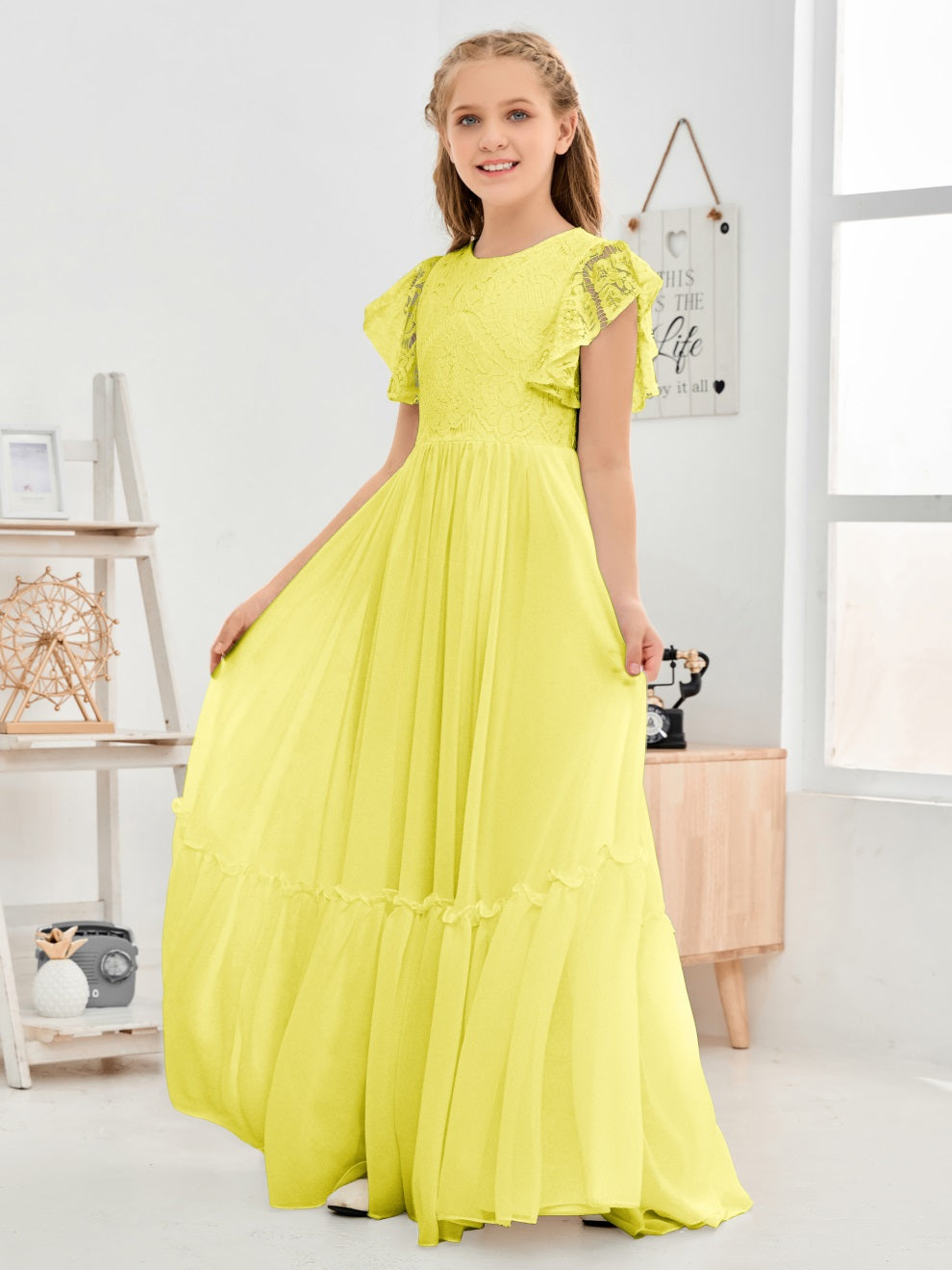 Kappenärmel A Linie Spitze Top Junior Chiffon Brautjungfernkleid