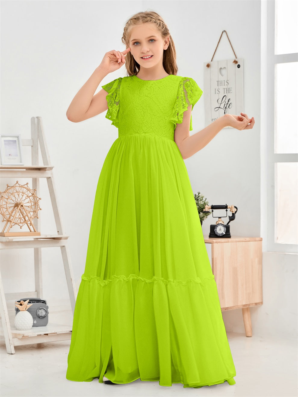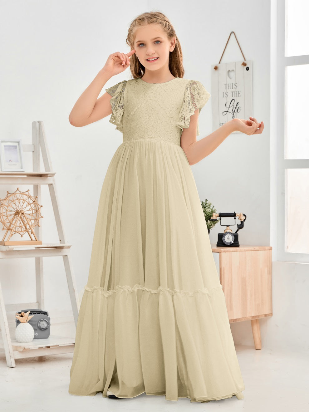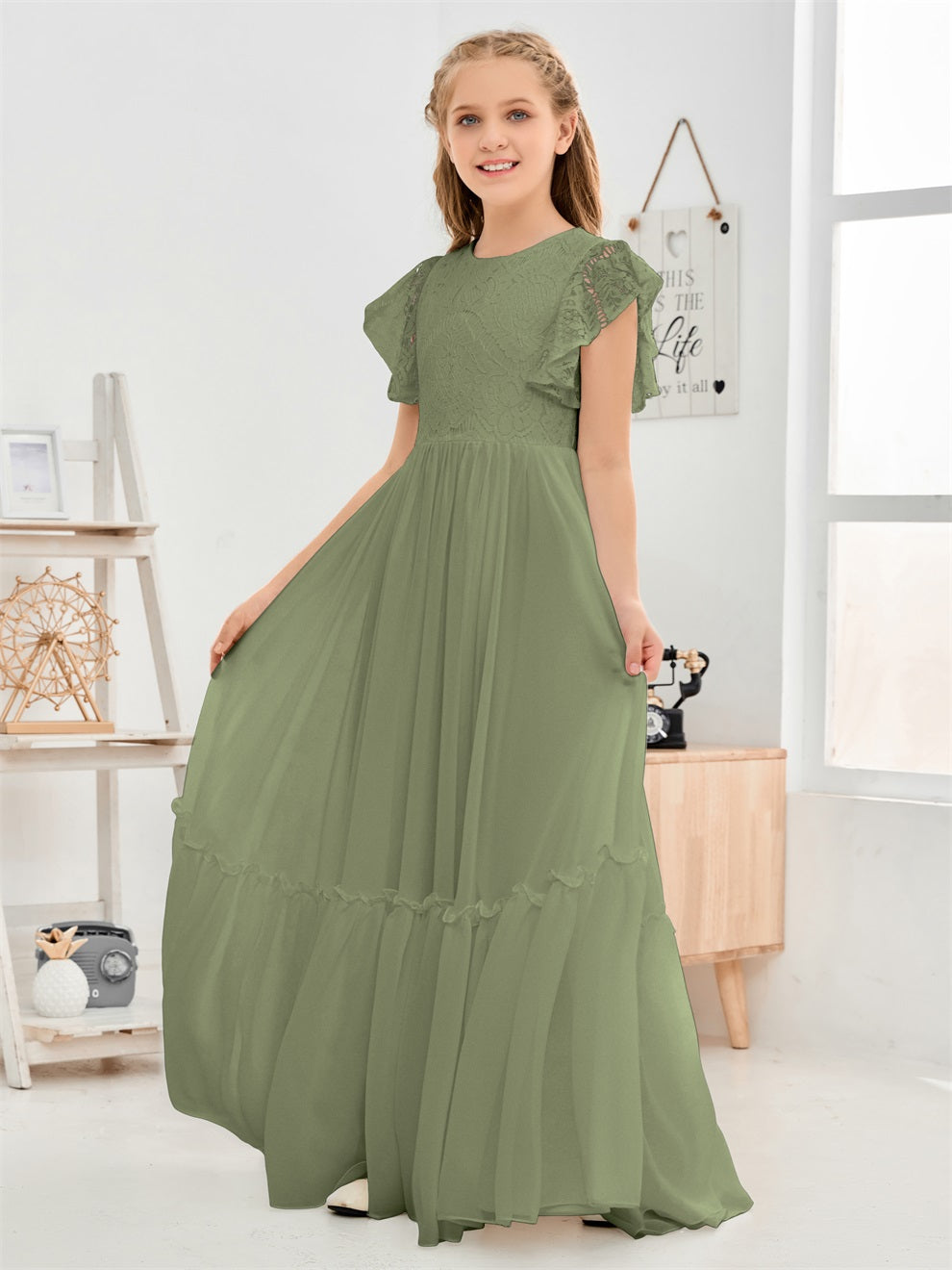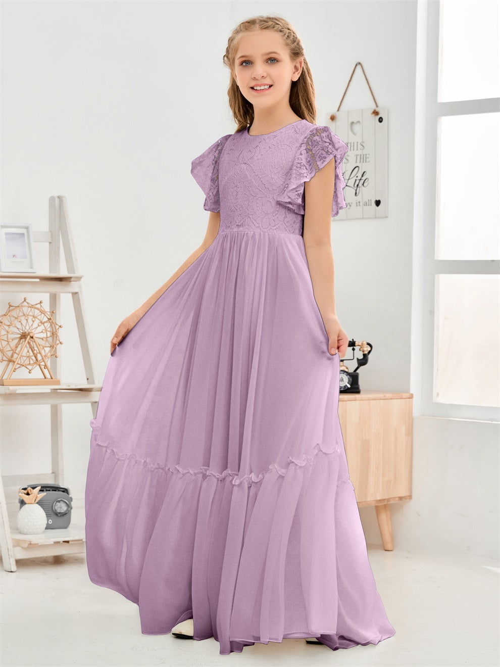 Kappenärmel A Linie Spitze Top Junior Chiffon Brautjungfernkleid