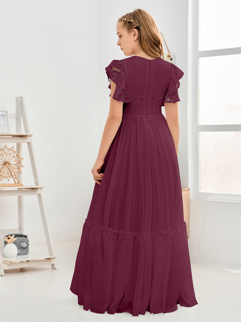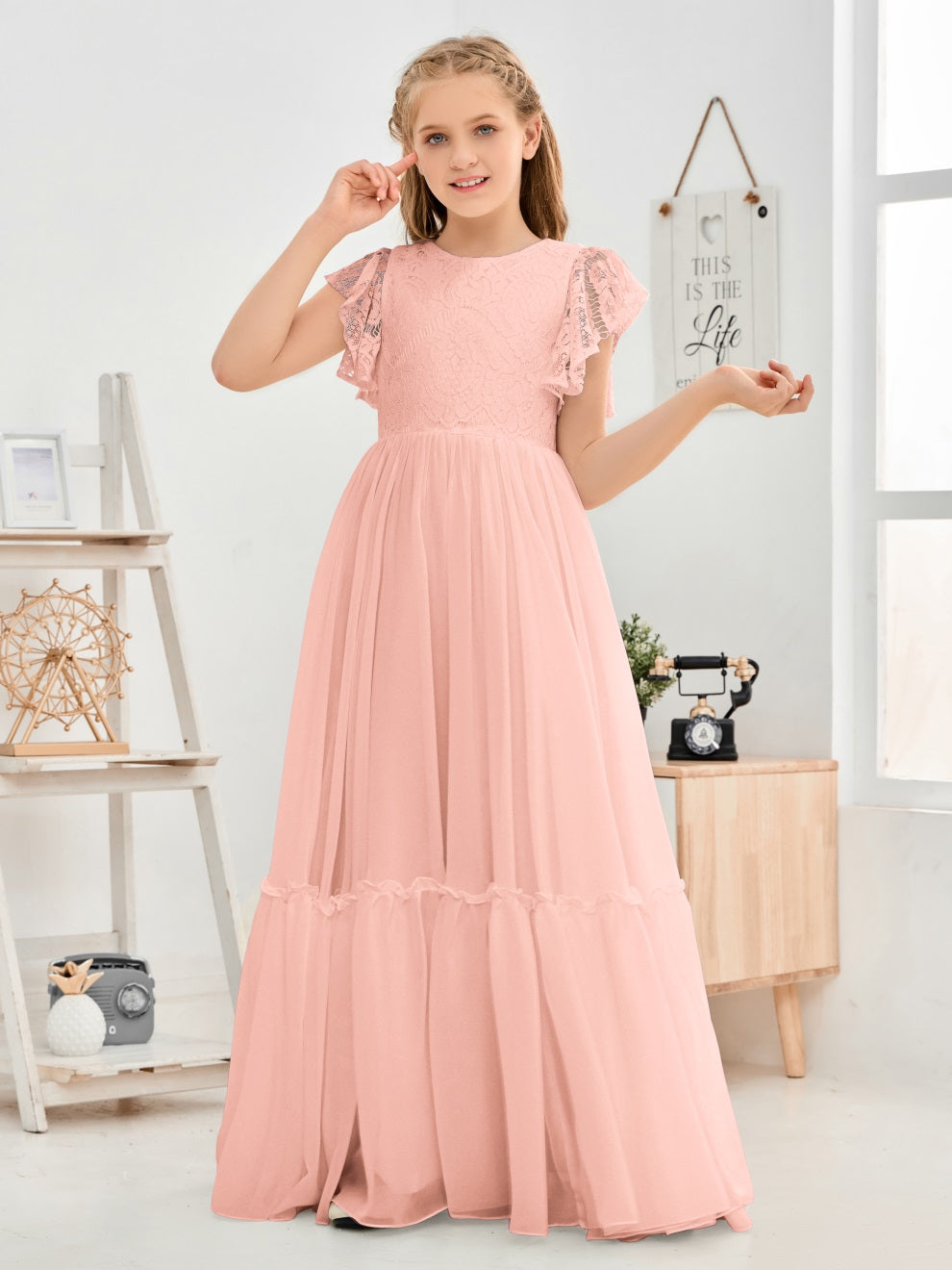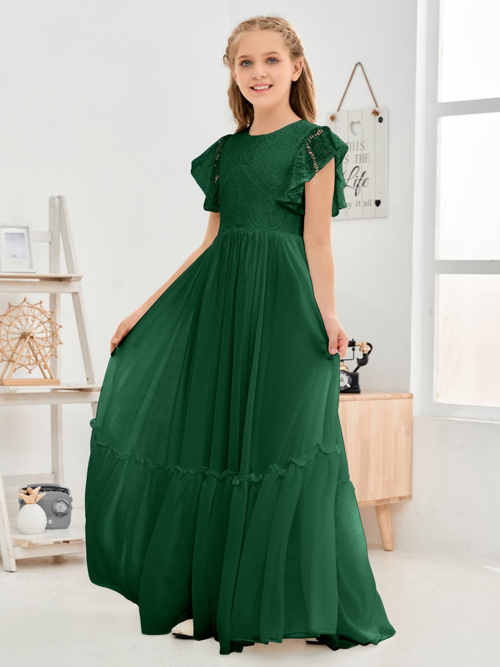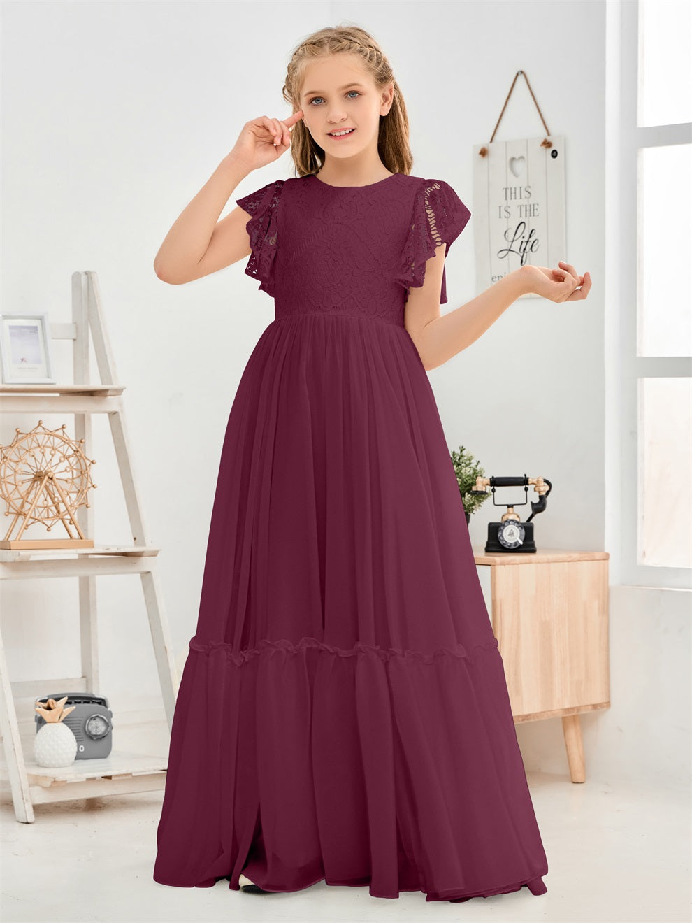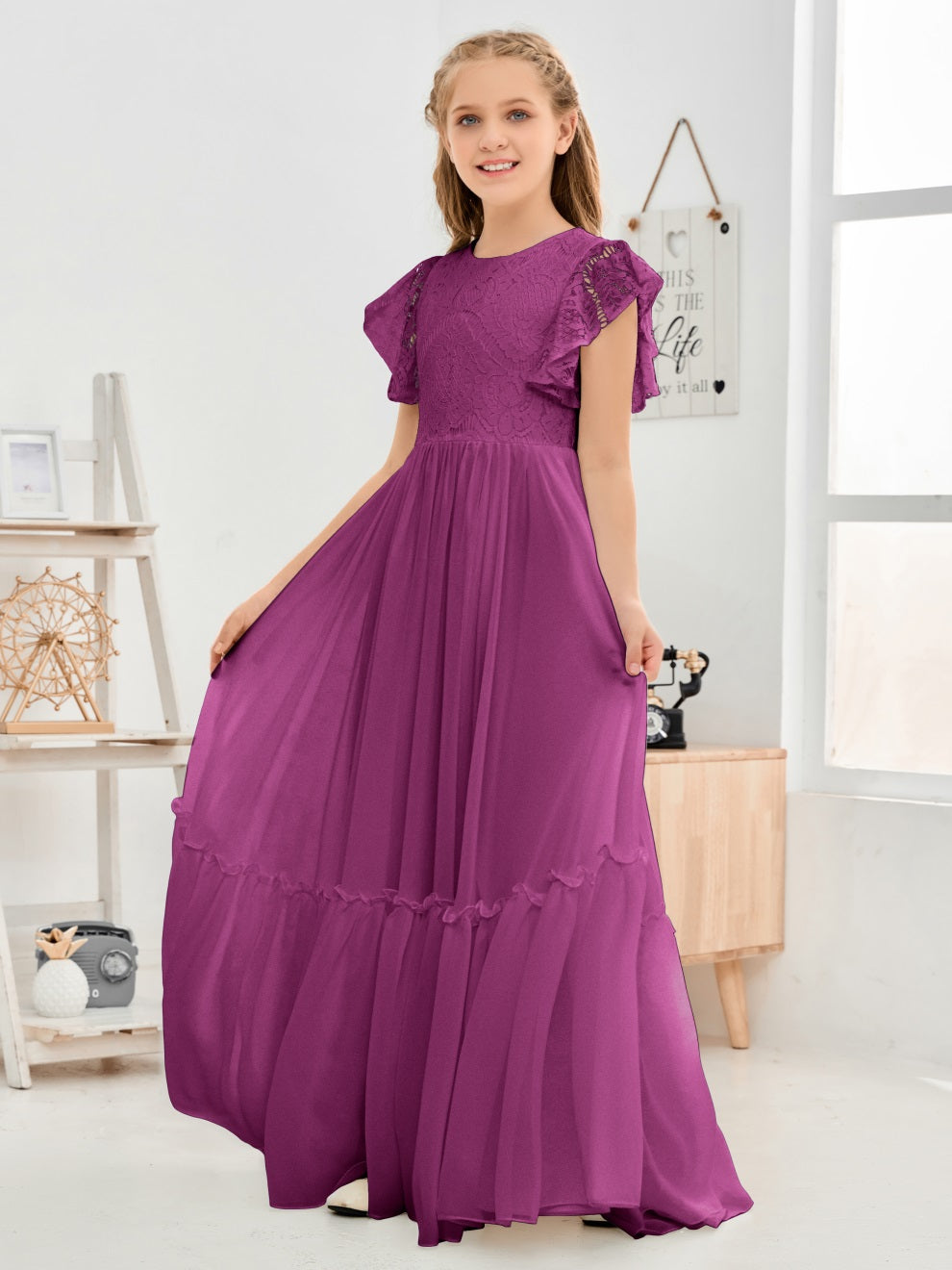 Kappenärmel A Linie Spitze Top Junior Chiffon Brautjungfernkleid