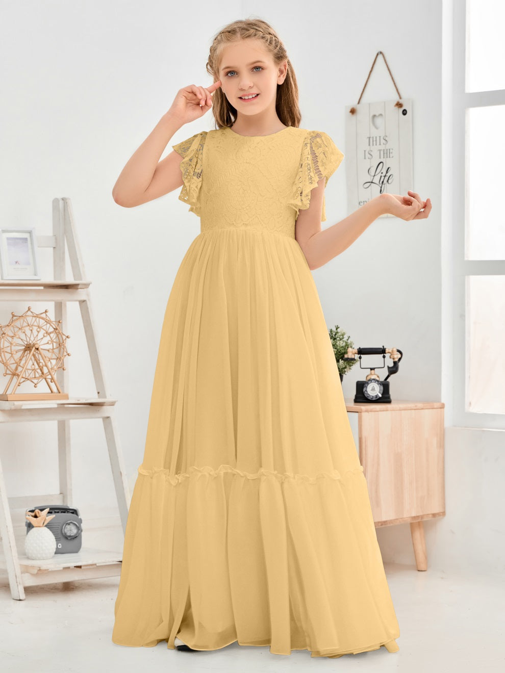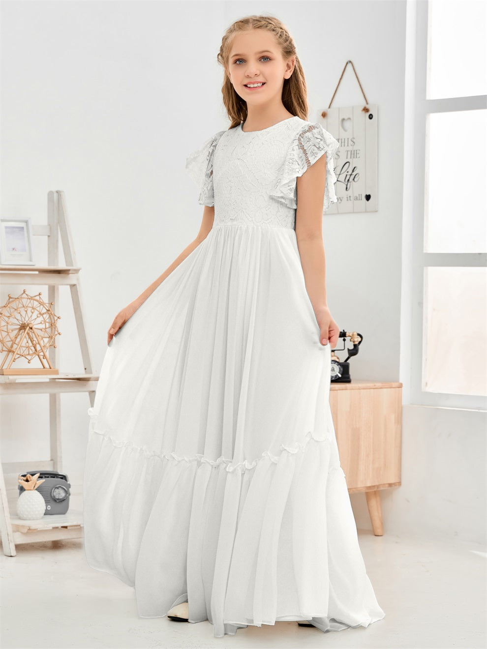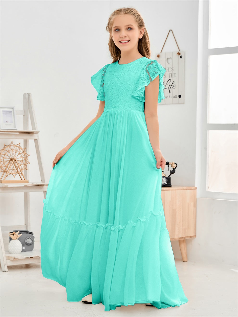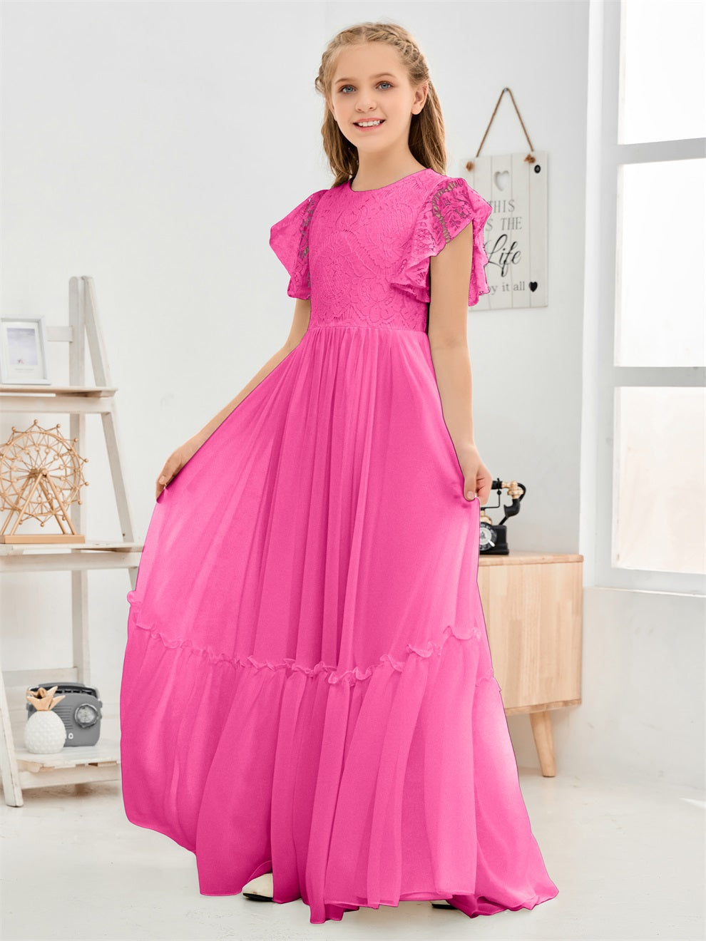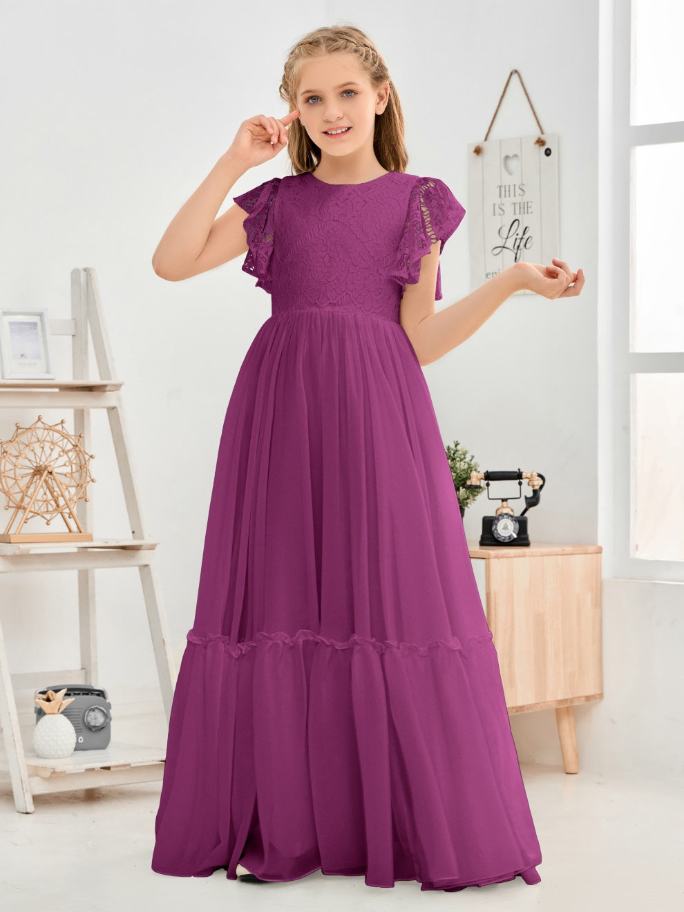 Kappenärmel A Linie Spitze Top Junior Chiffon Brautjungfernkleid