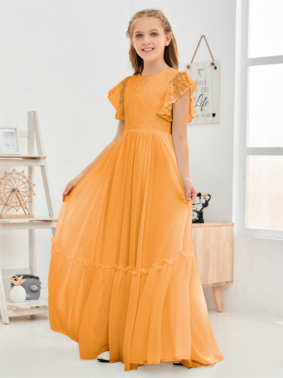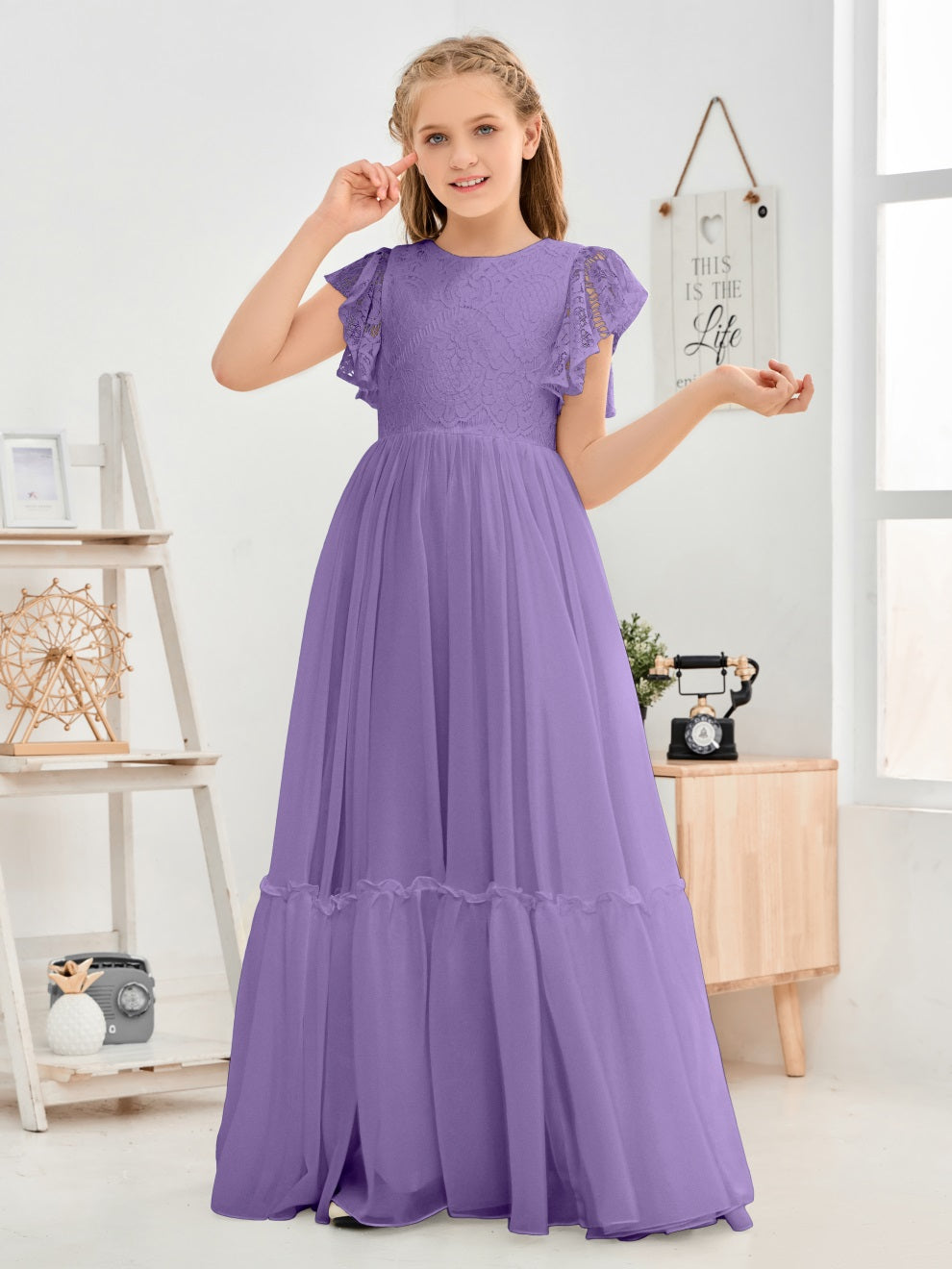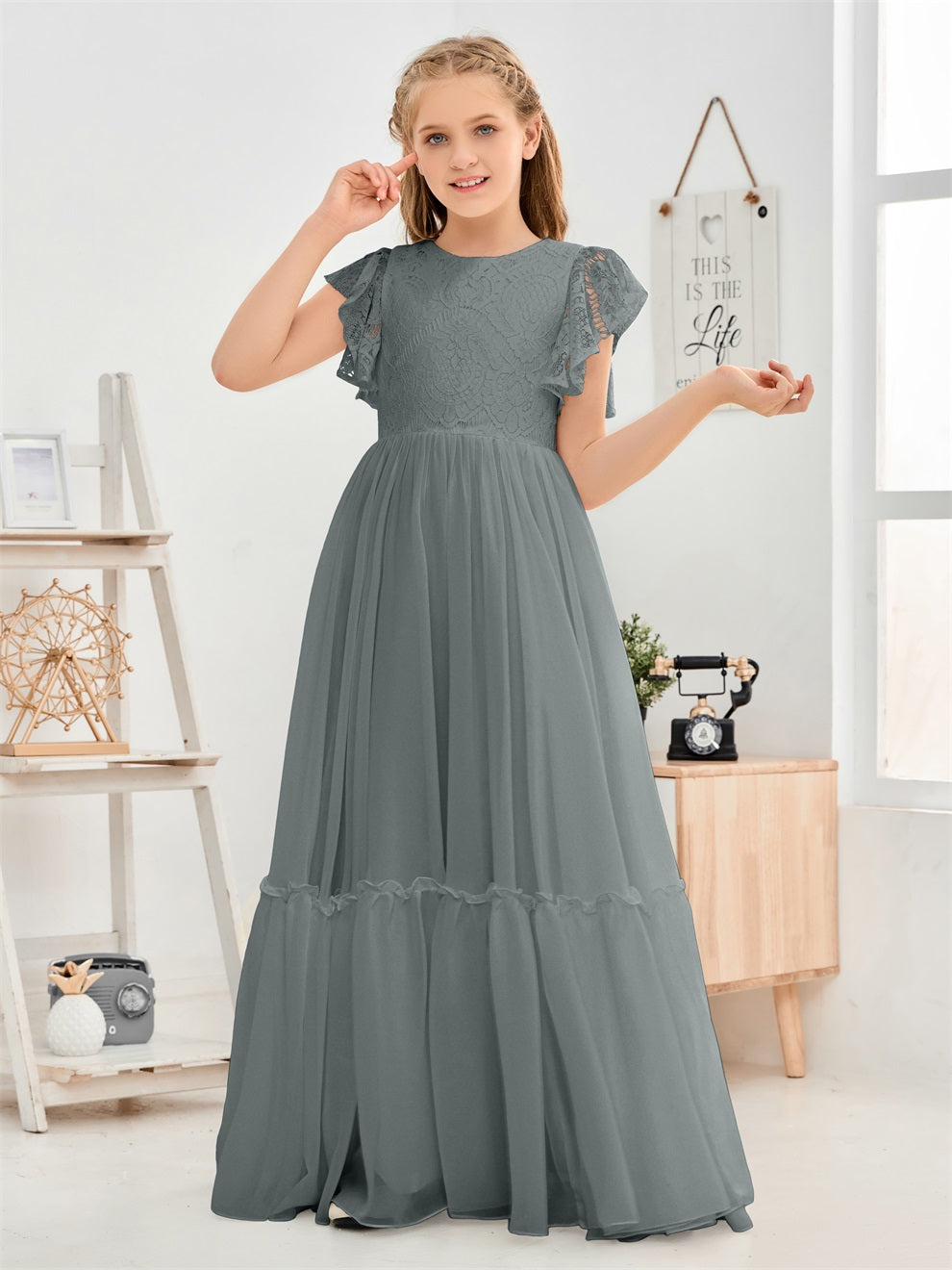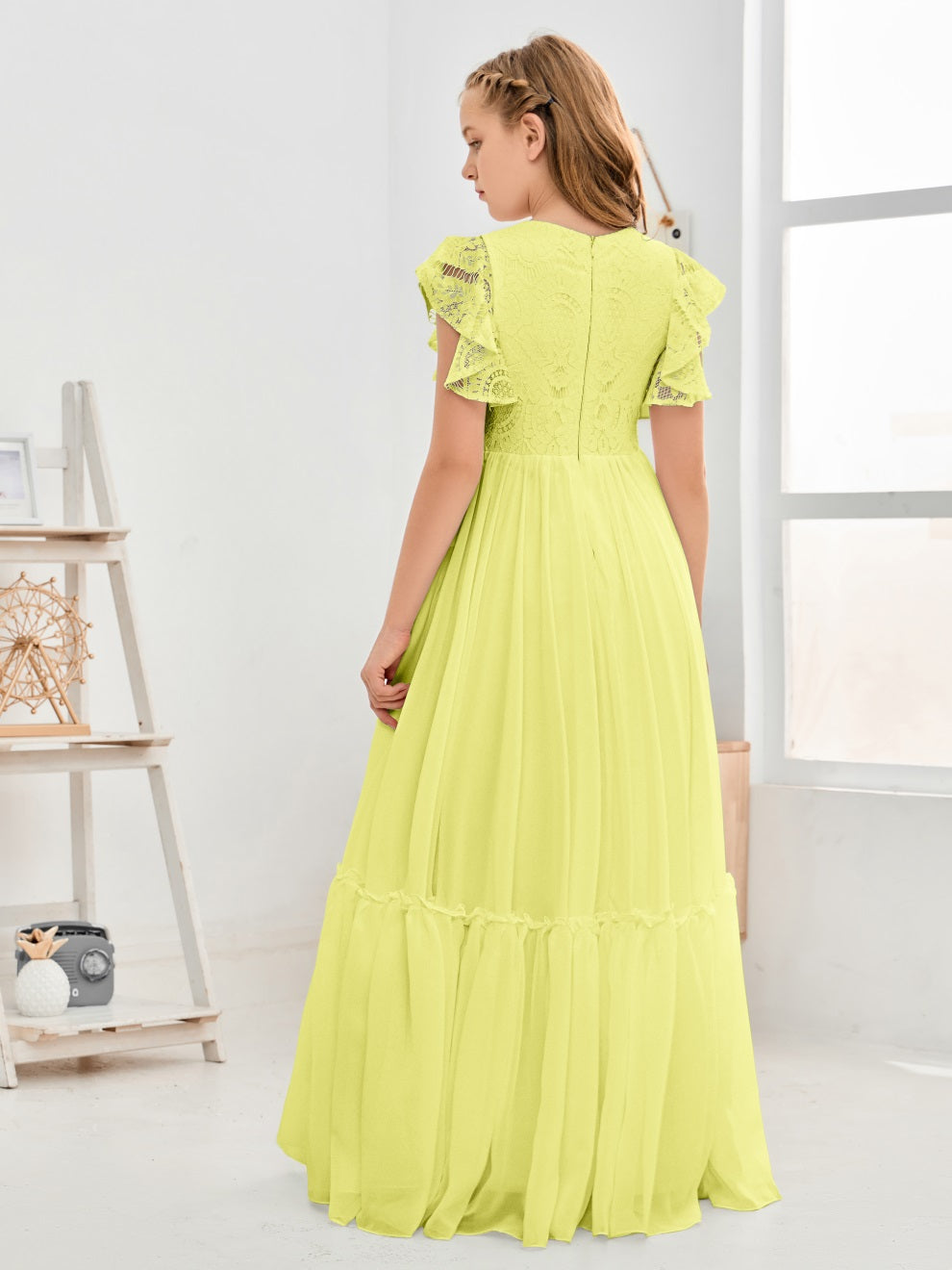 Kappenärmel A Linie Spitze Top Junior Chiffon Brautjungfernkleid