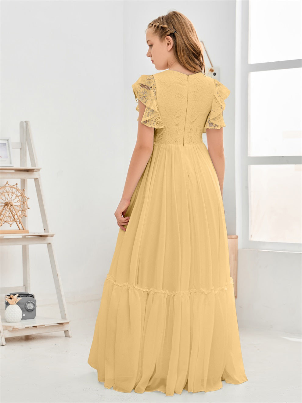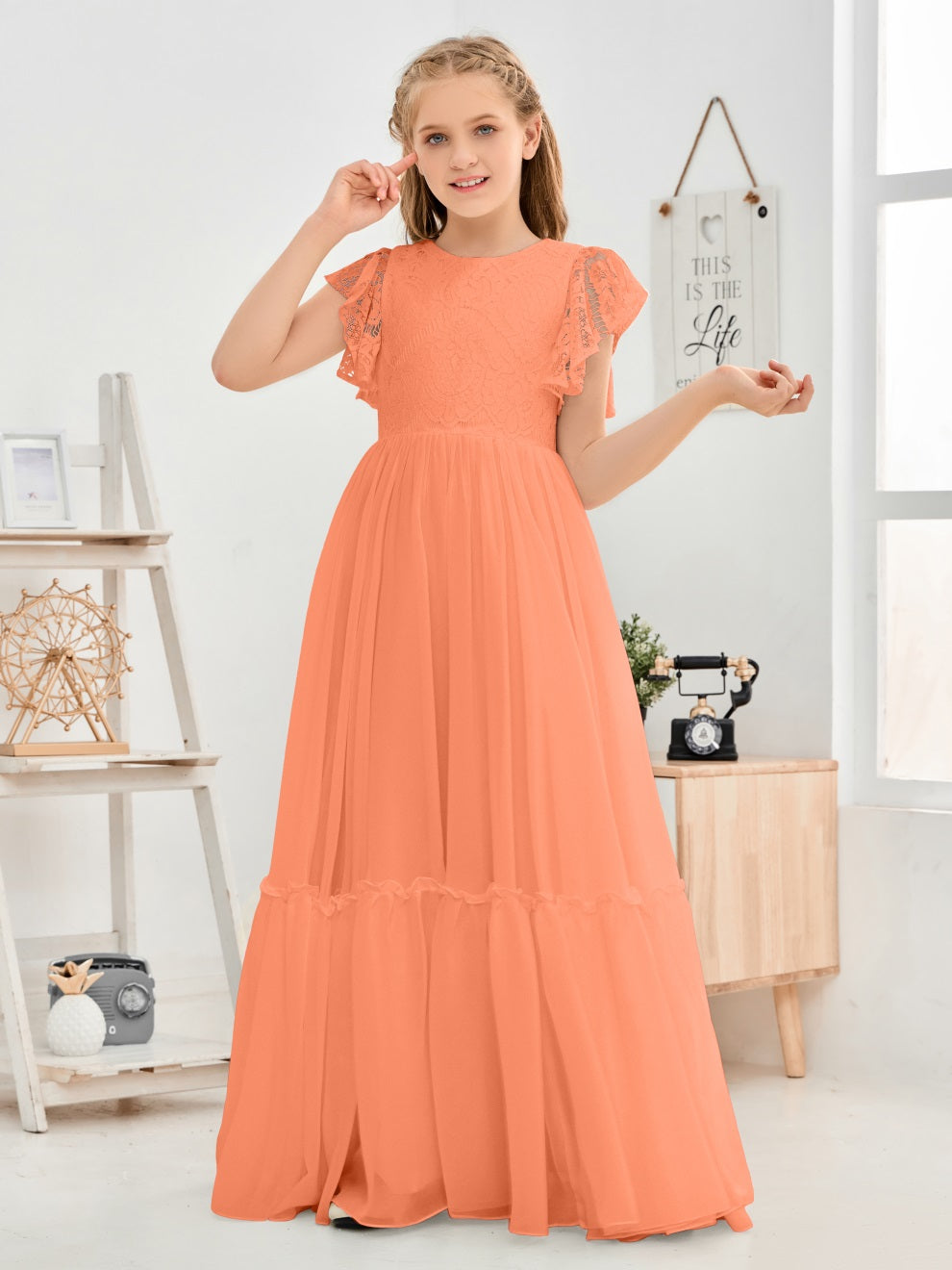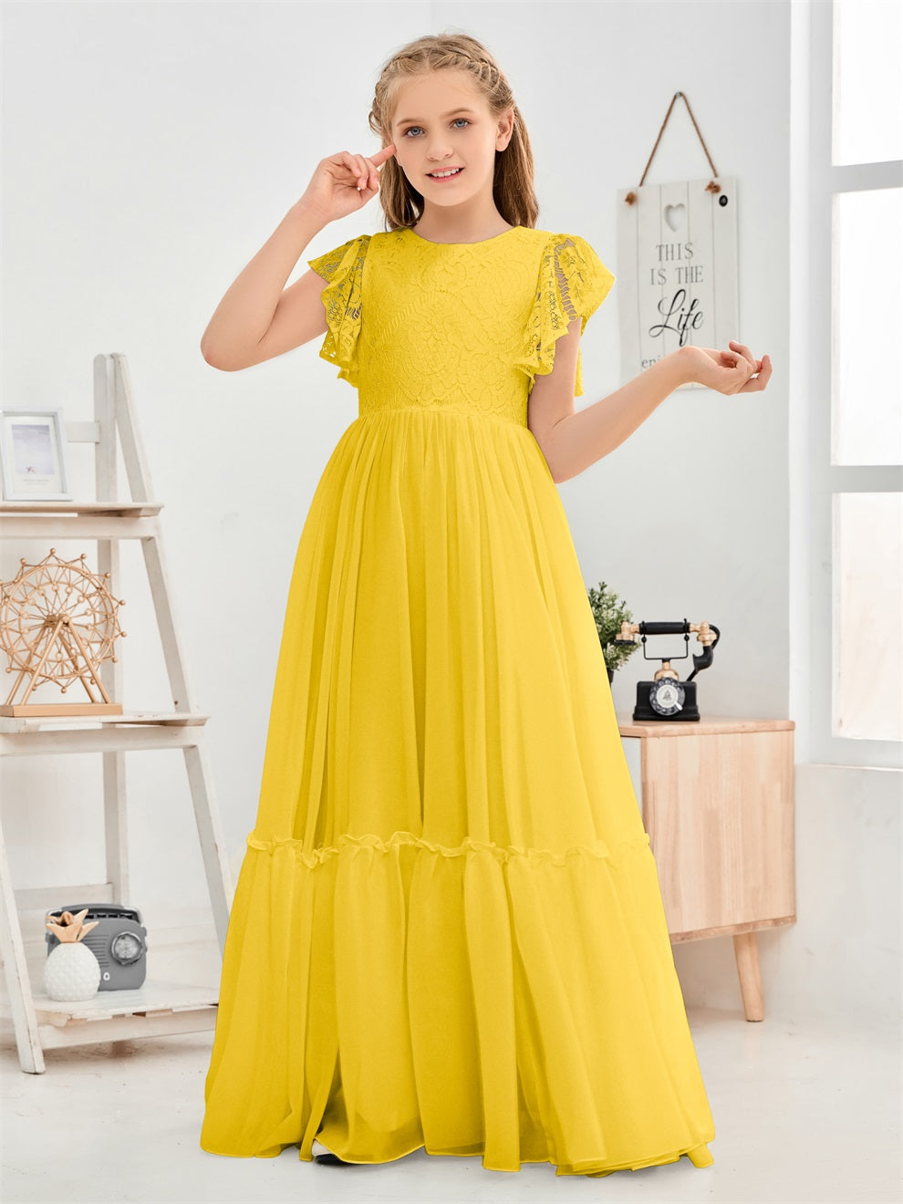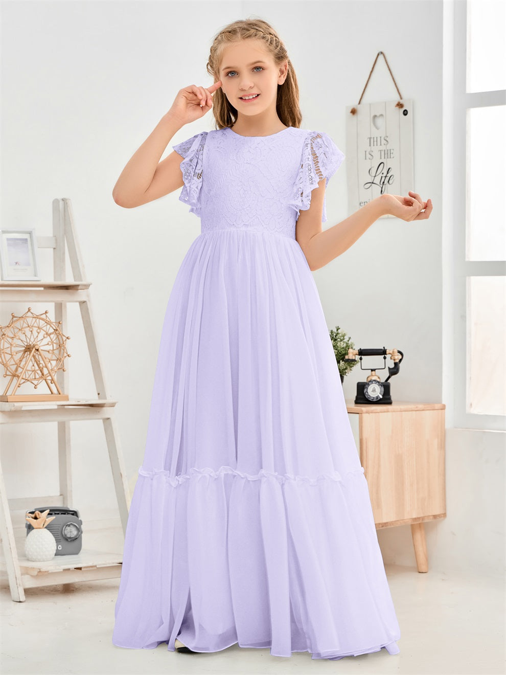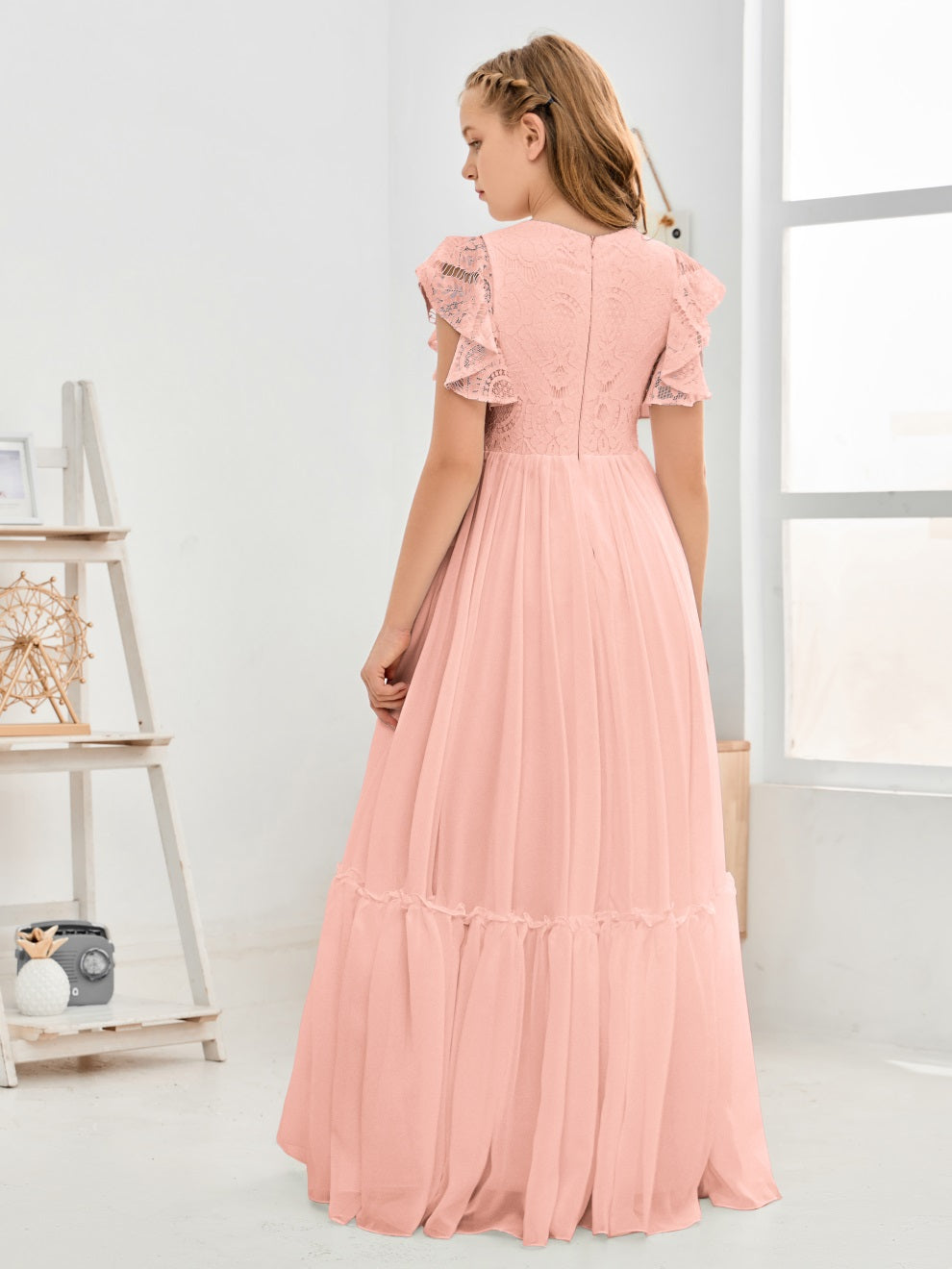 Kappenärmel A Linie Spitze Top Junior Chiffon Brautjungfernkleid