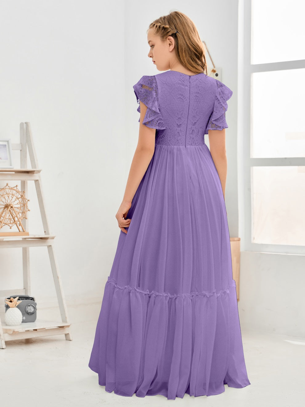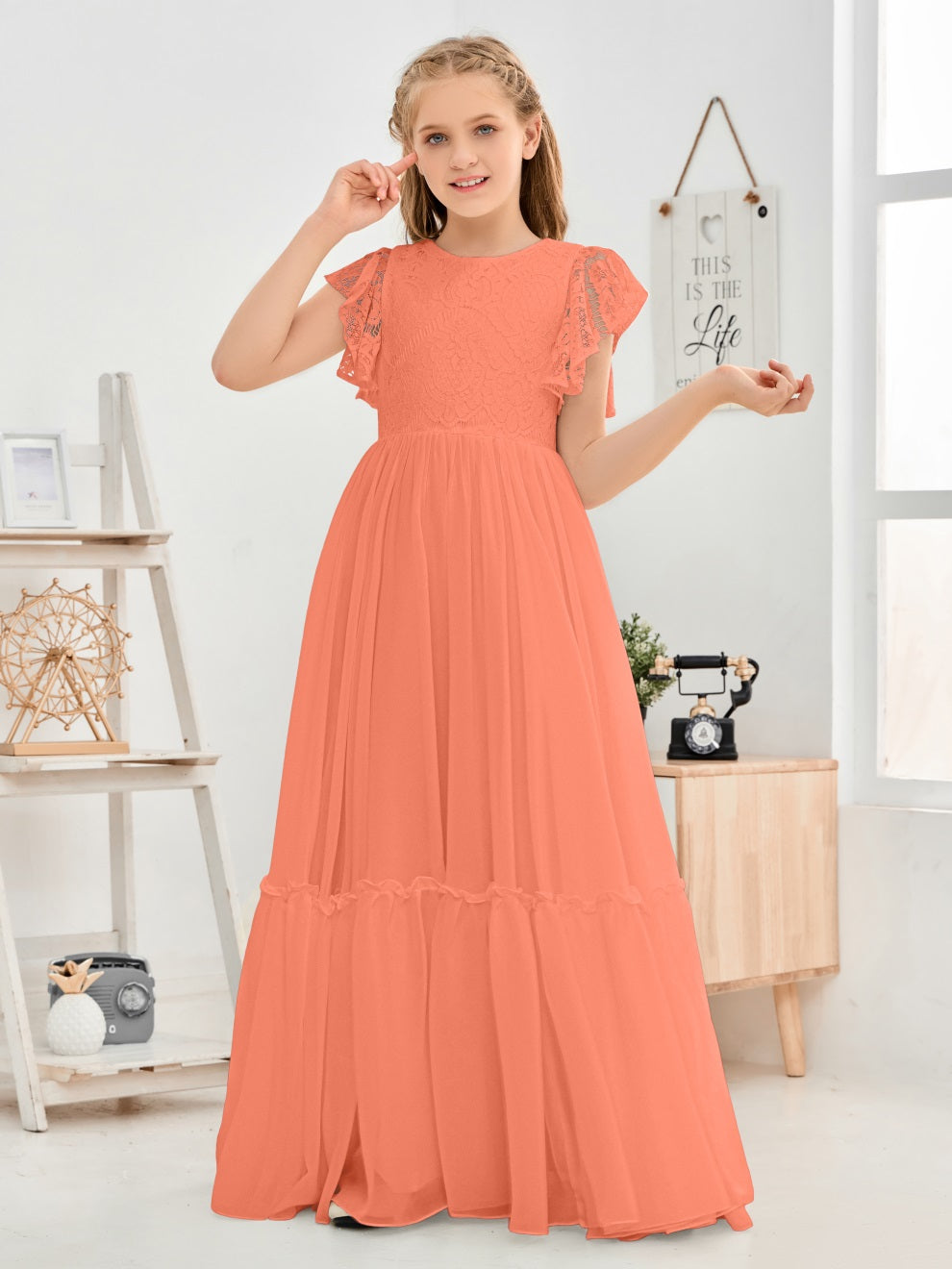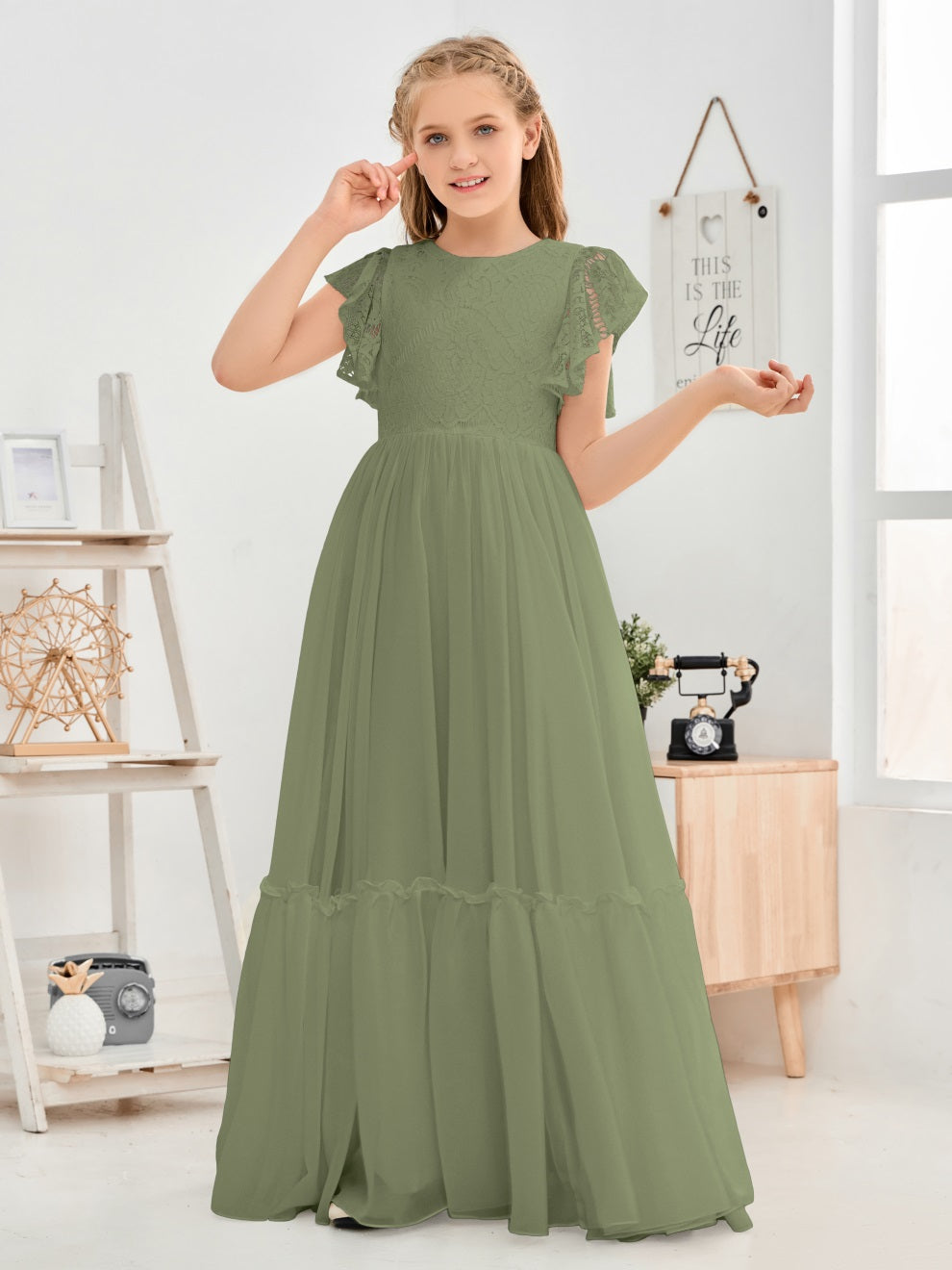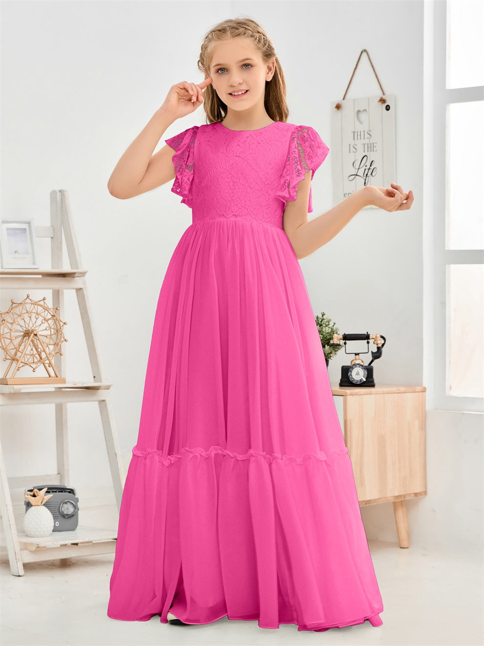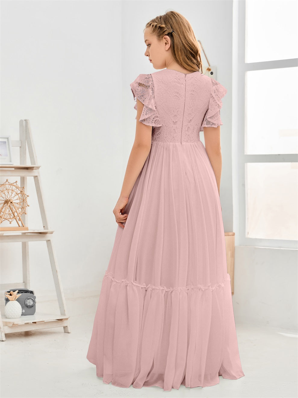 Kappenärmel A Linie Spitze Top Junior Chiffon Brautjungfernkleid