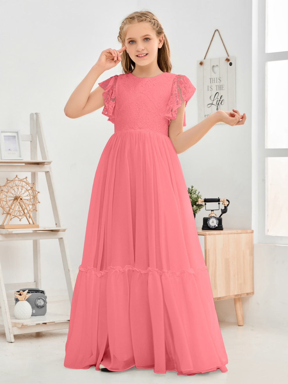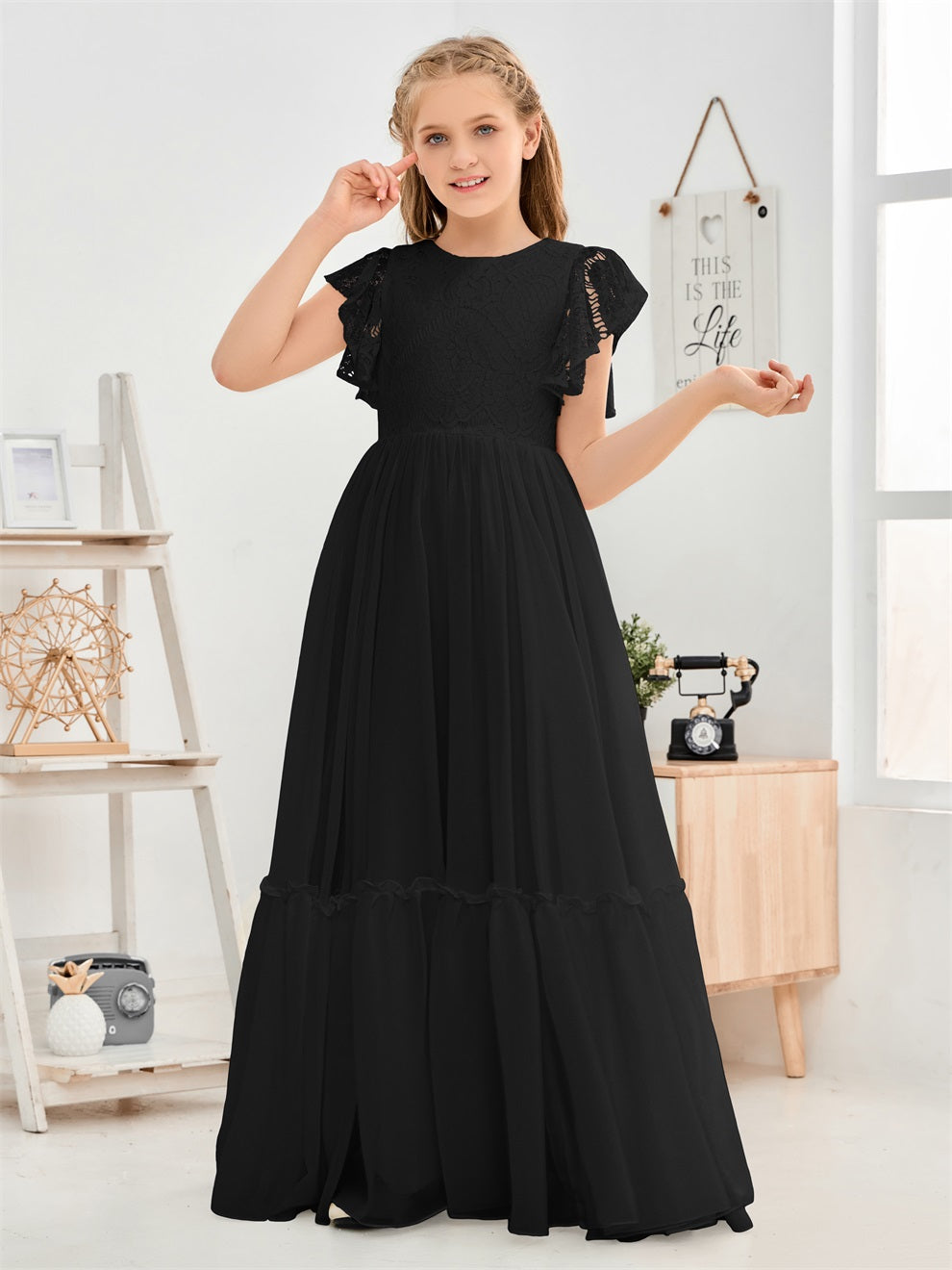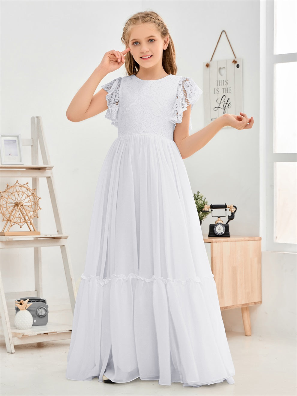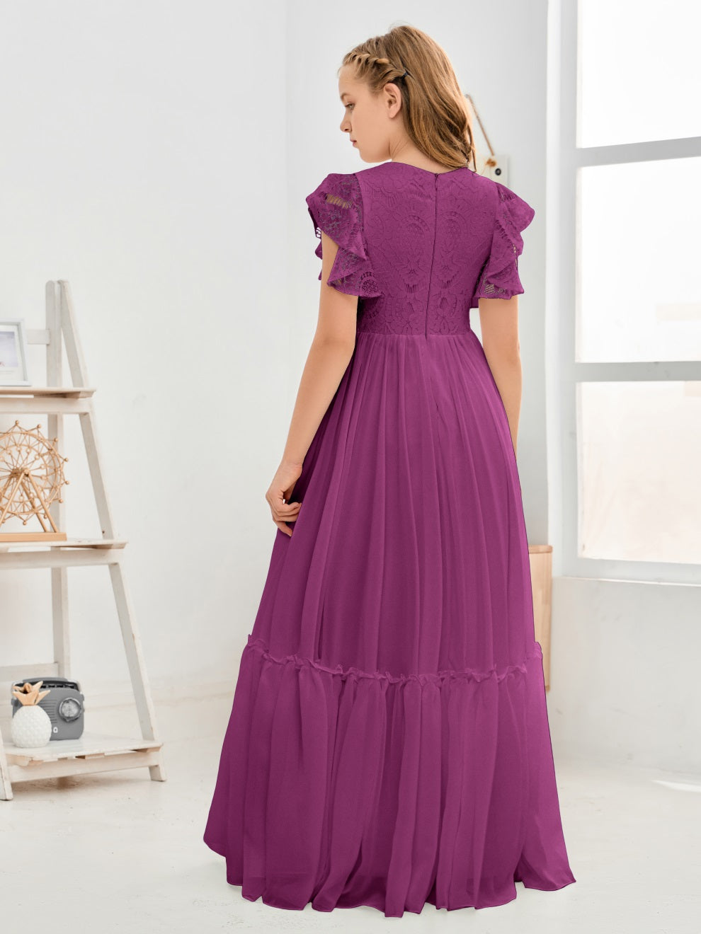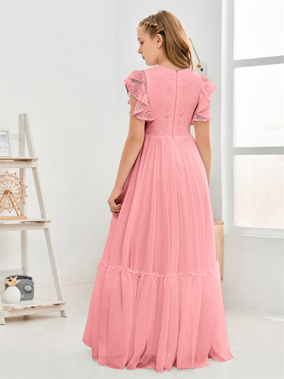 Kappenärmel A Linie Spitze Top Junior Chiffon Brautjungfernkleid