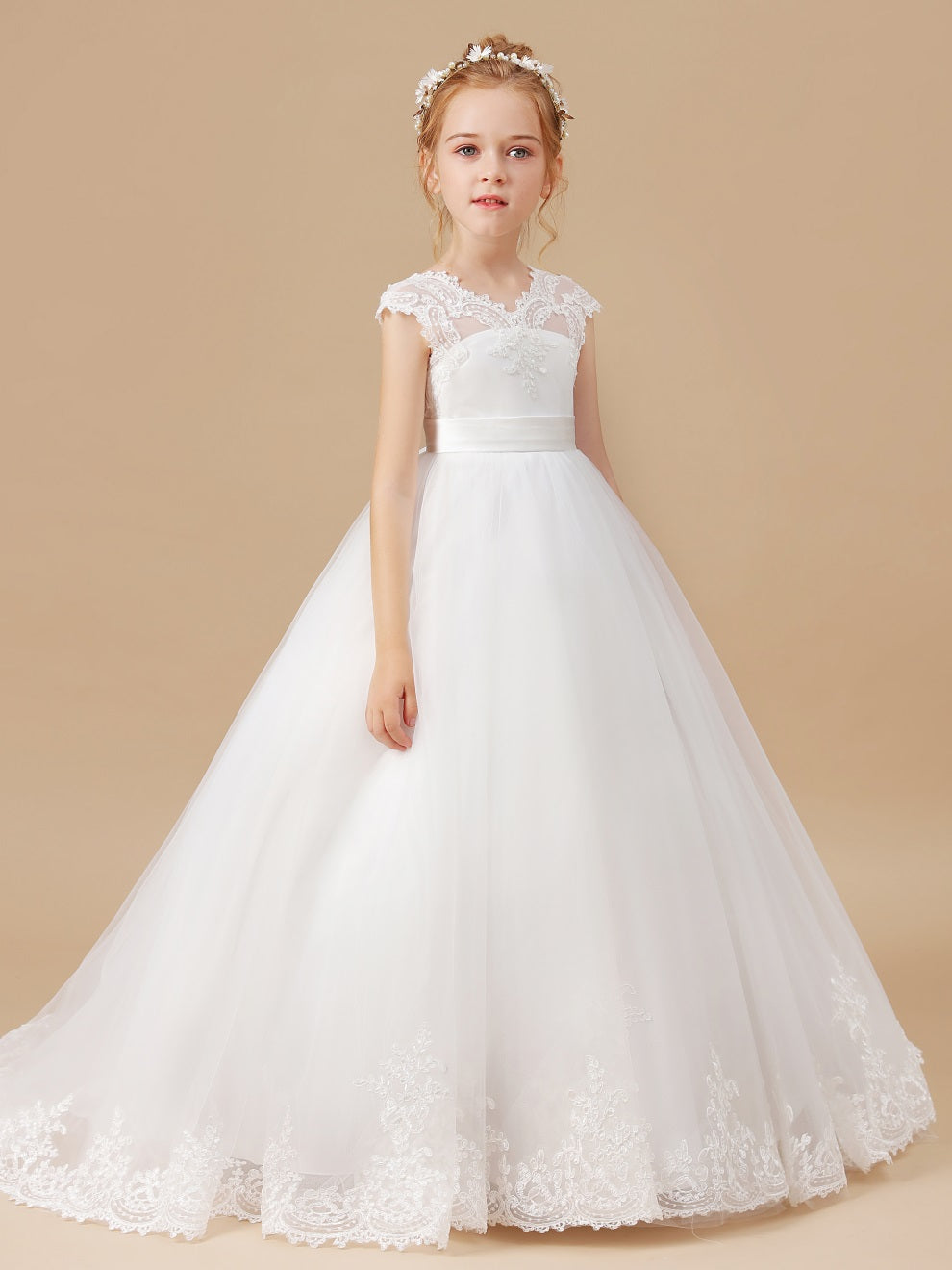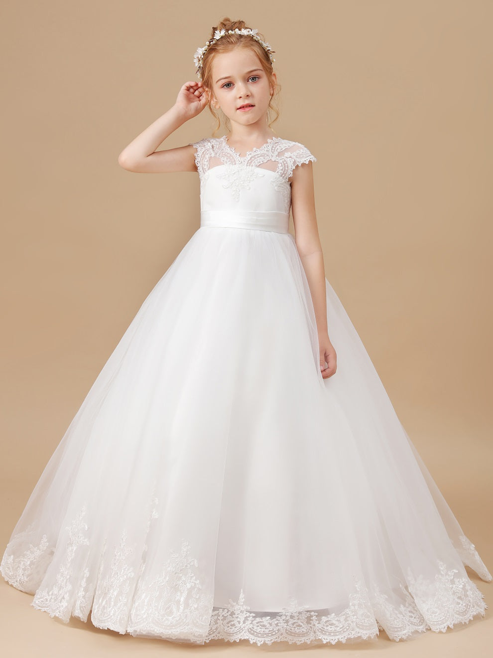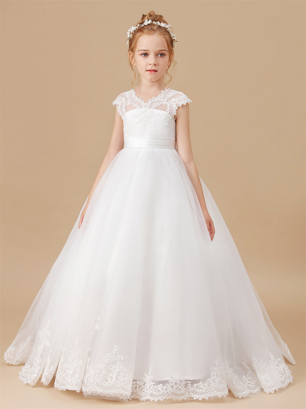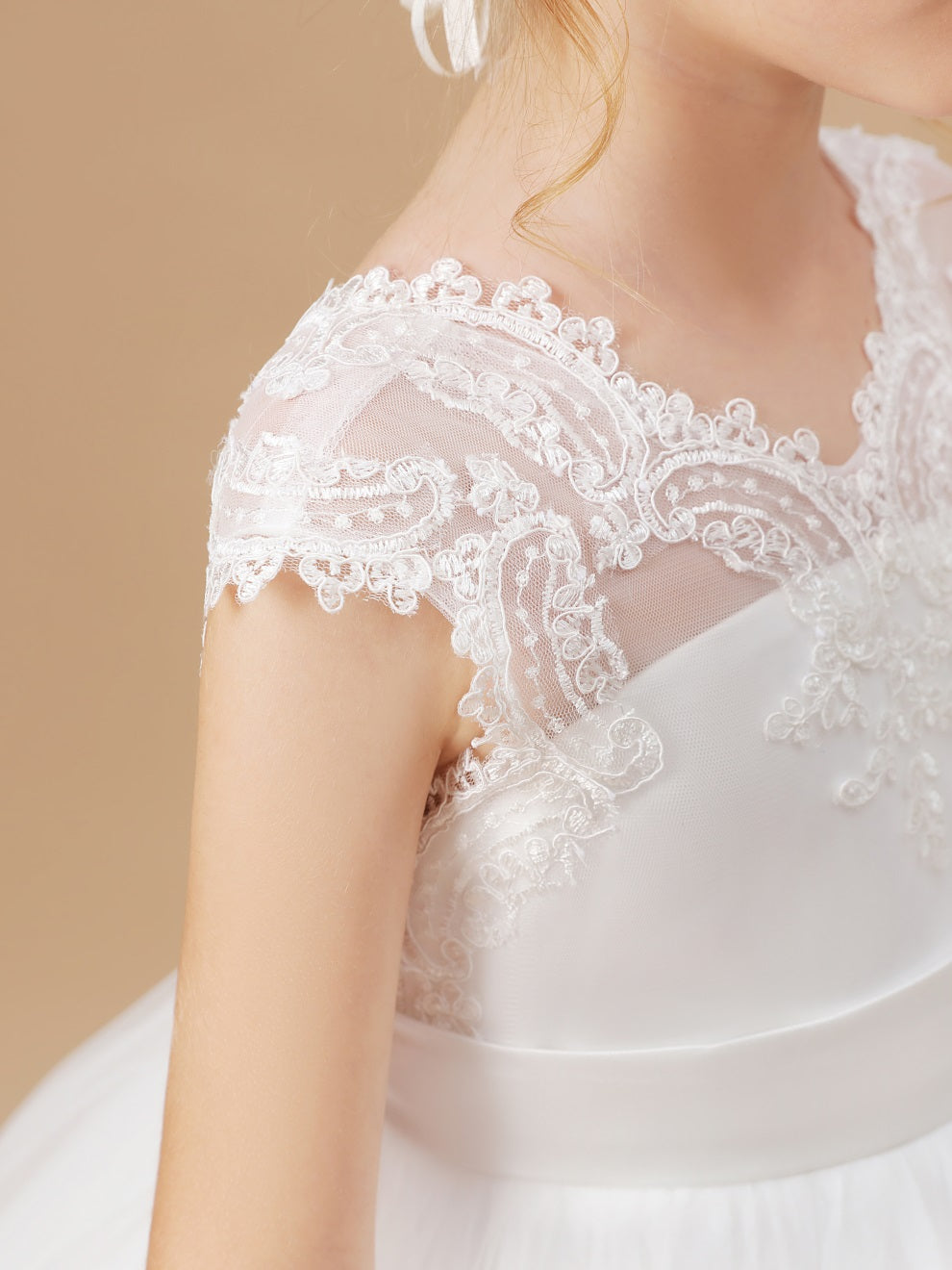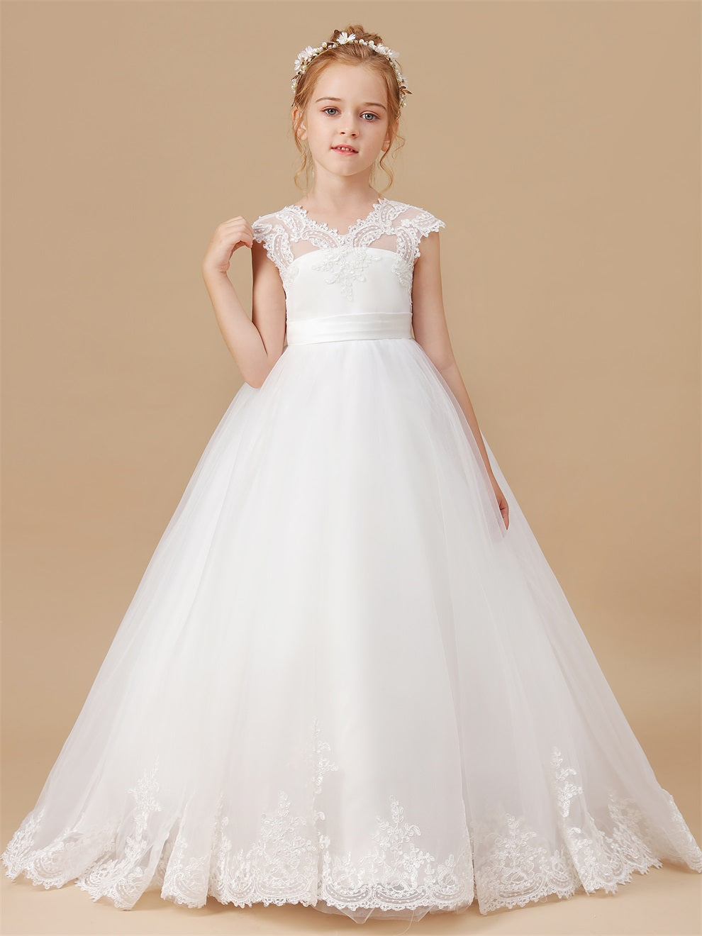 Langes Blumenmädchenkleid mit V-Ausschnitt und Spitzenapplikationen