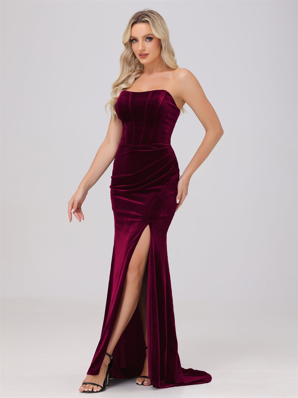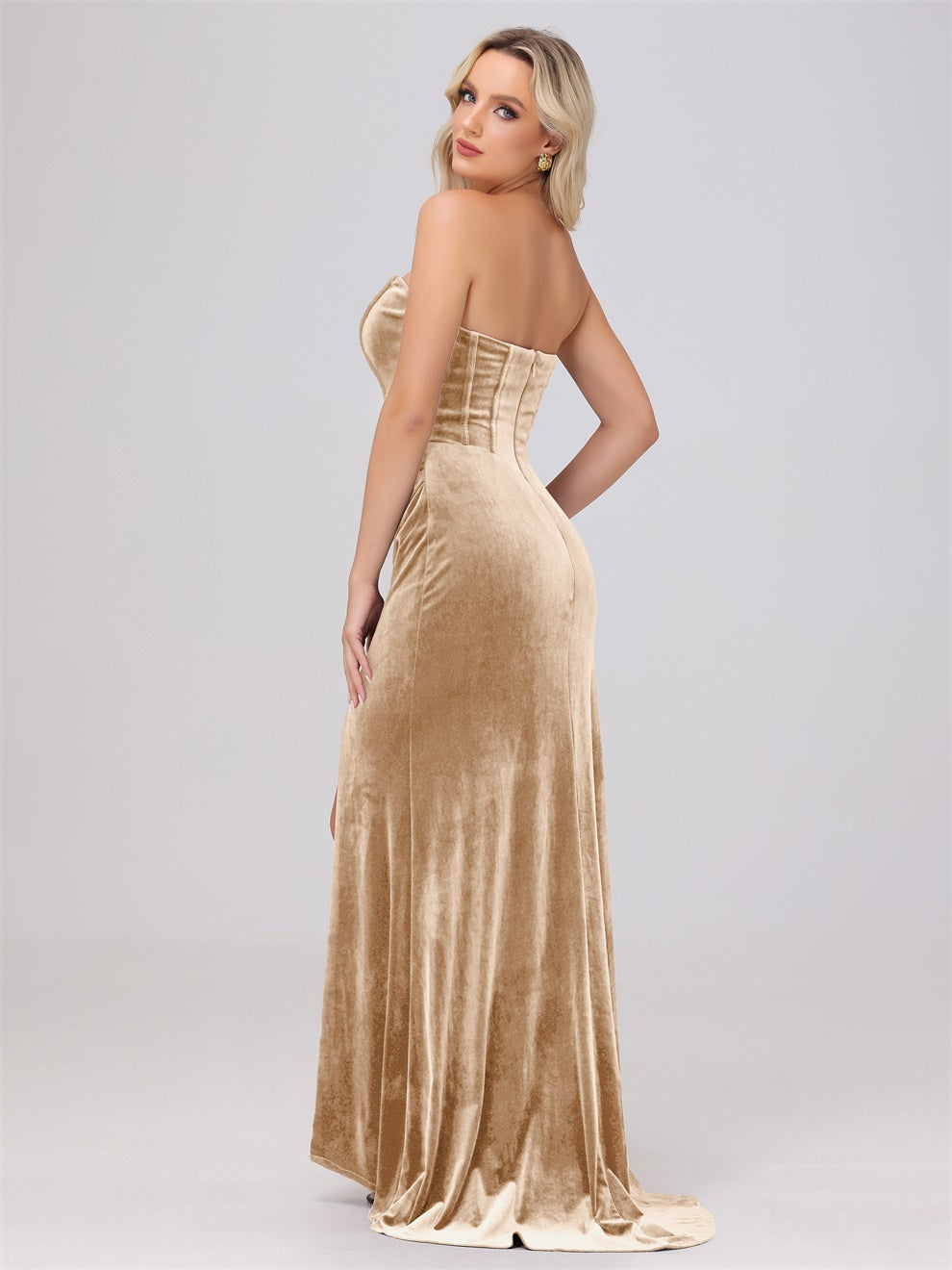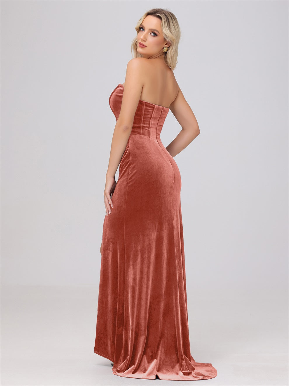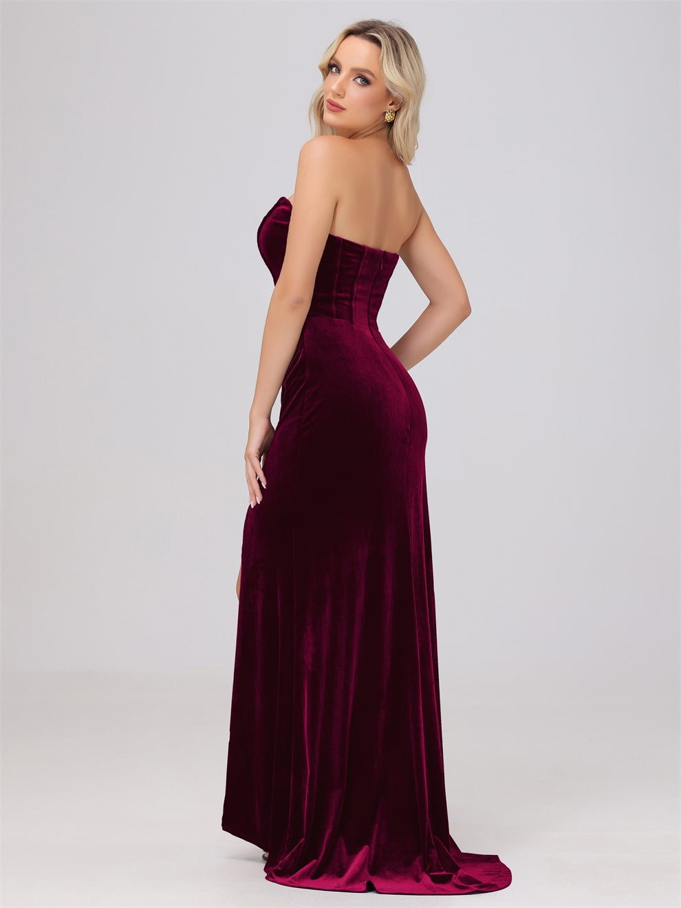 Dieses Brautjungfernkleid aus hochwertigem Samt kann Ihre Figur wunderschön betonen. Der trägerlose Ausschnitt und die schwingende Schleppe verleihen dem Kleid eine elegante Note. Mit dem Mantel ausgestattet, ist das Kleid perfekt für jede Hochzeit oder formelle Veranstaltung.