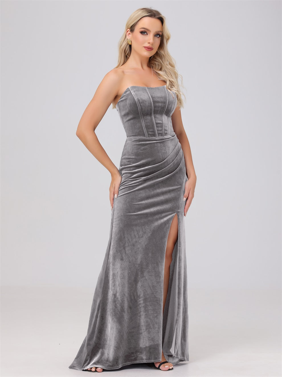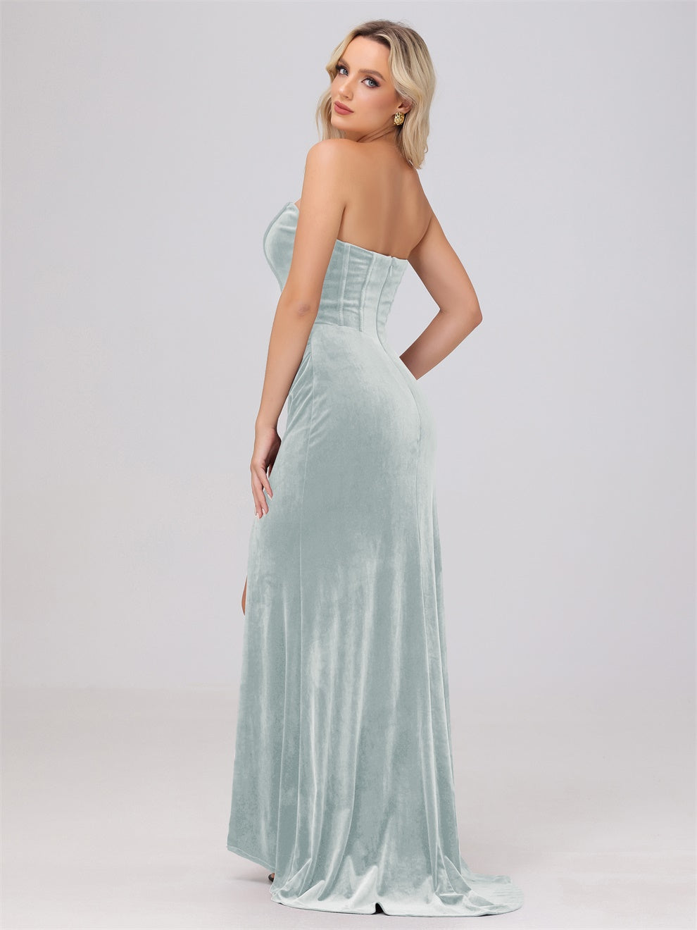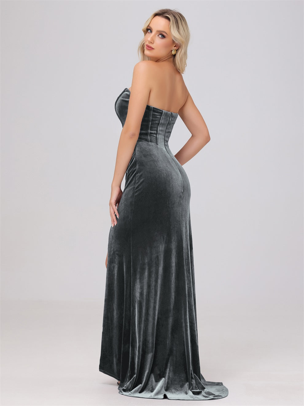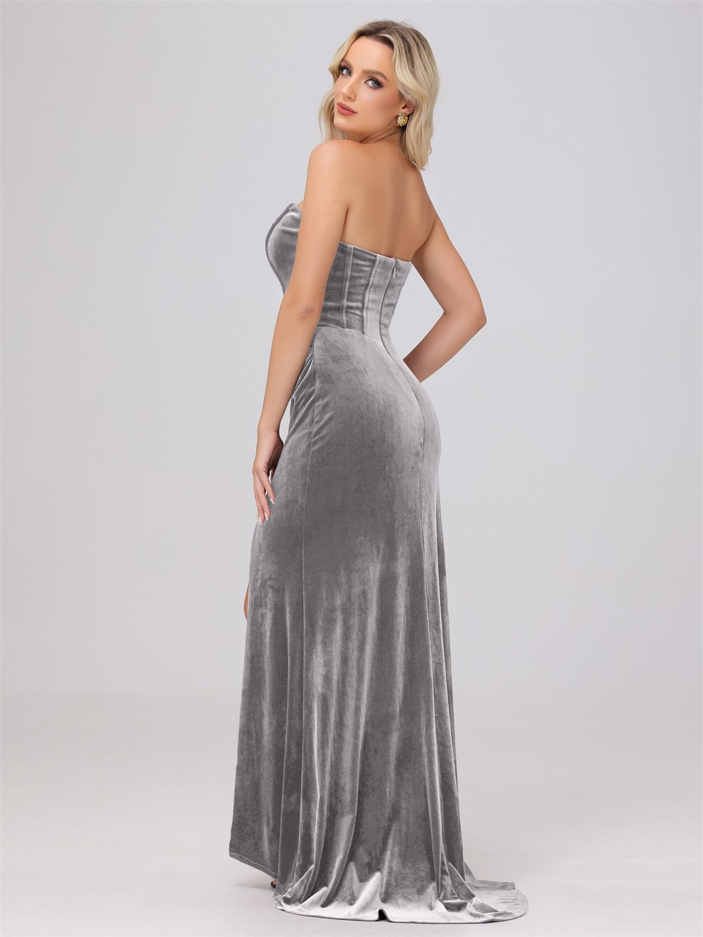 Dieses Brautjungfernkleid aus hochwertigem Samt kann Ihre Figur wunderschön betonen. Der trägerlose Ausschnitt und die schwingende Schleppe verleihen dem Kleid eine elegante Note. Mit dem Mantel ausgestattet, ist das Kleid perfekt für jede Hochzeit oder formelle Veranstaltung.