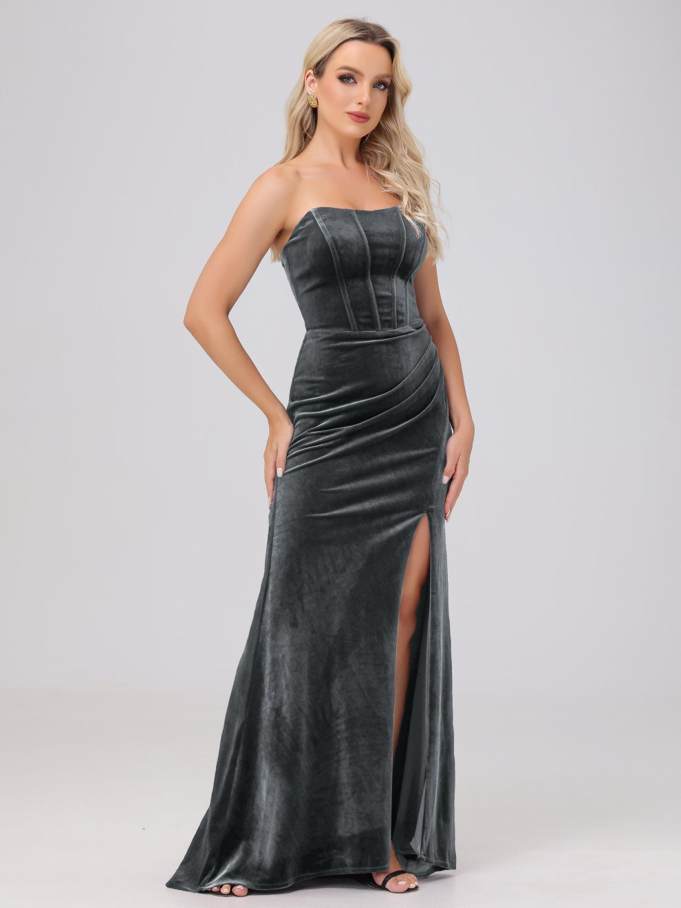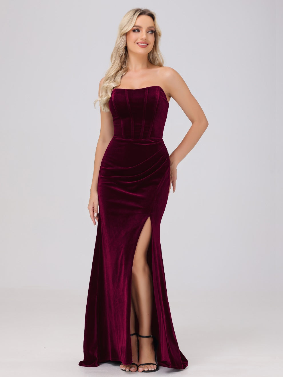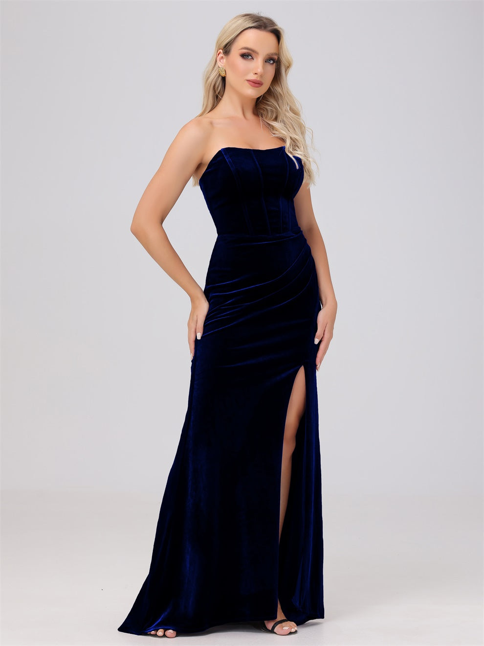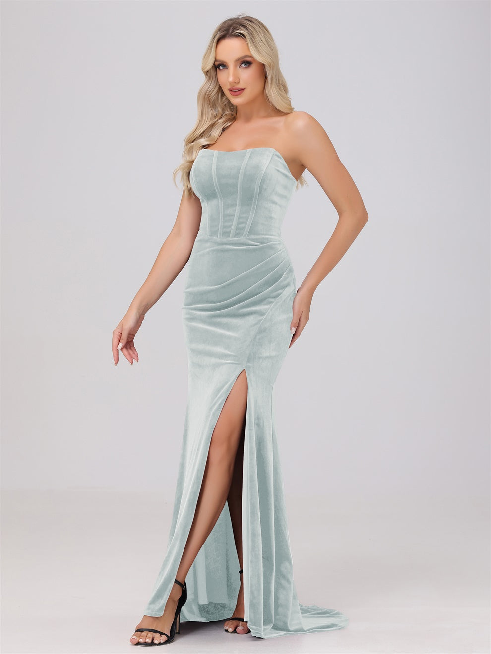 Dieses Brautjungfernkleid aus hochwertigem Samt kann Ihre Figur wunderschön betonen. Der trägerlose Ausschnitt und die schwingende Schleppe verleihen dem Kleid eine elegante Note. Mit dem Mantel ausgestattet, ist das Kleid perfekt für jede Hochzeit oder formelle Veranstaltung.