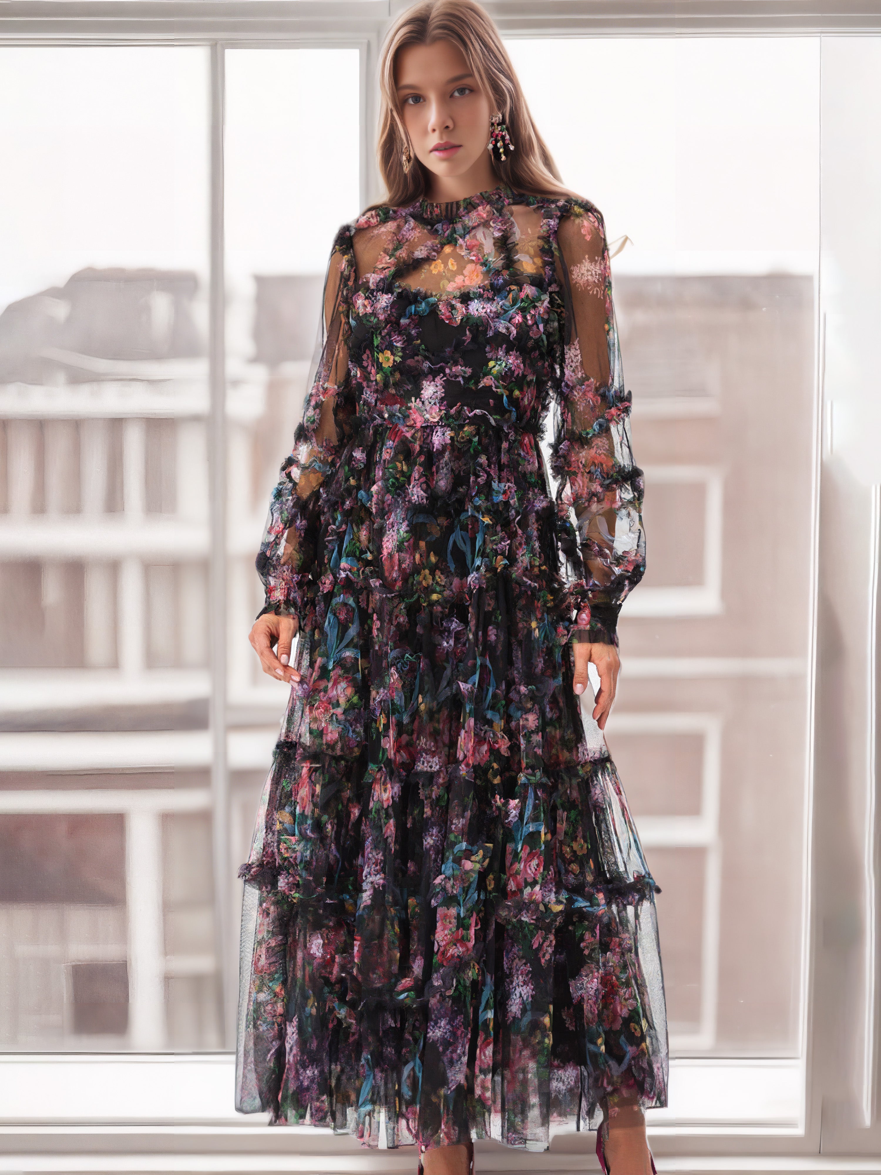 Mock Neck Floral Lange Ärmel Tüll Tiered Ruffle Hochzeit Gastkleider