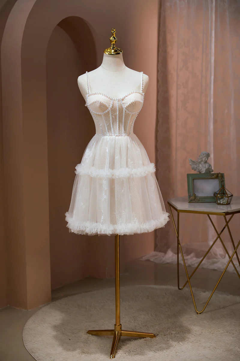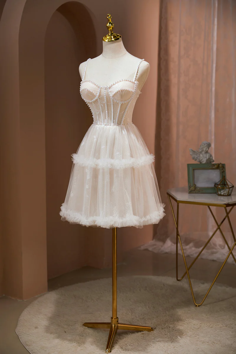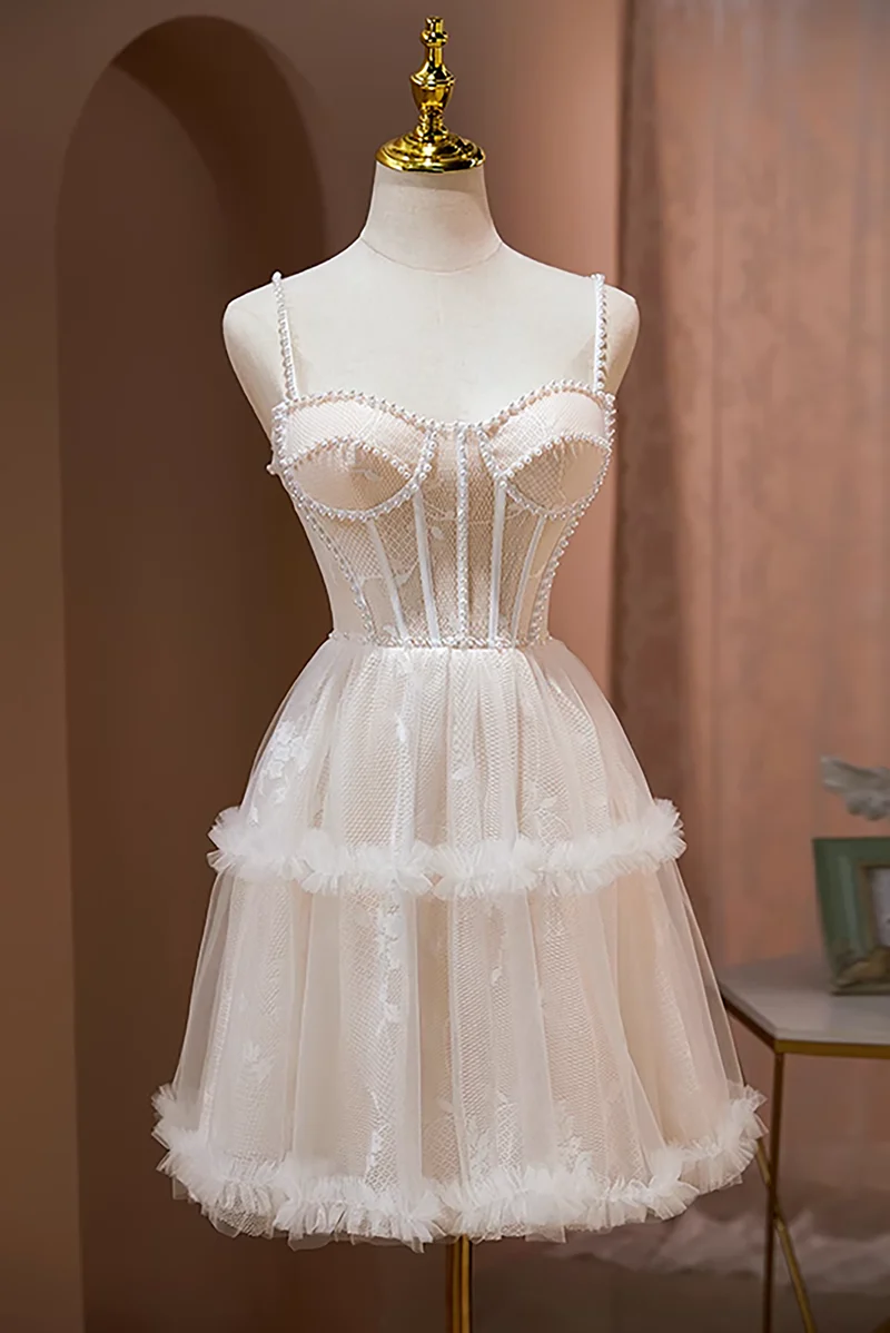 Rosa Spaghetti-Träger Perlen-Tüll Ballkleider
