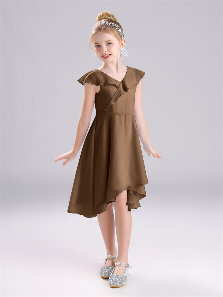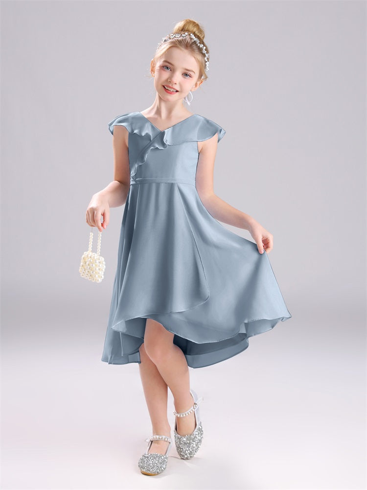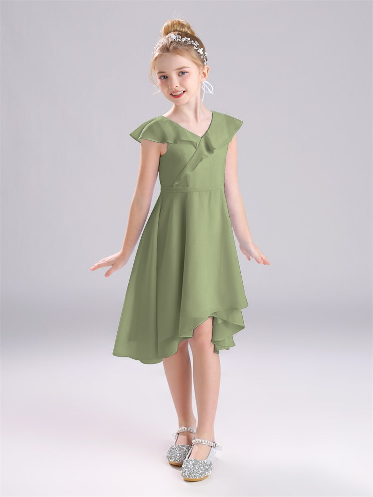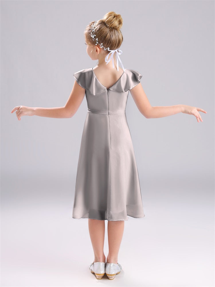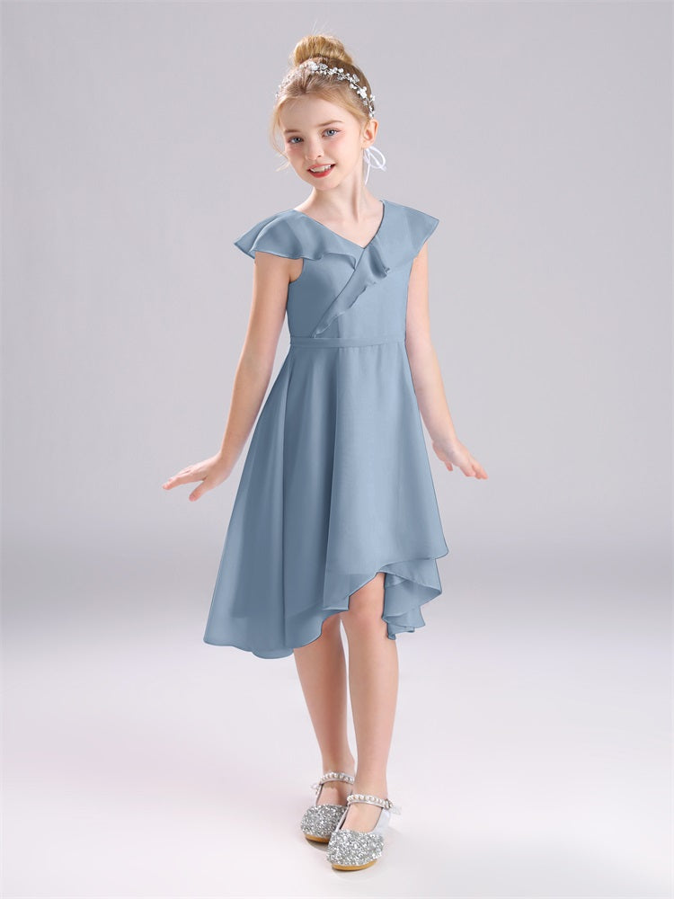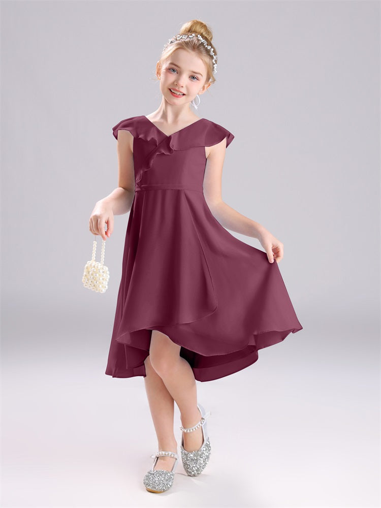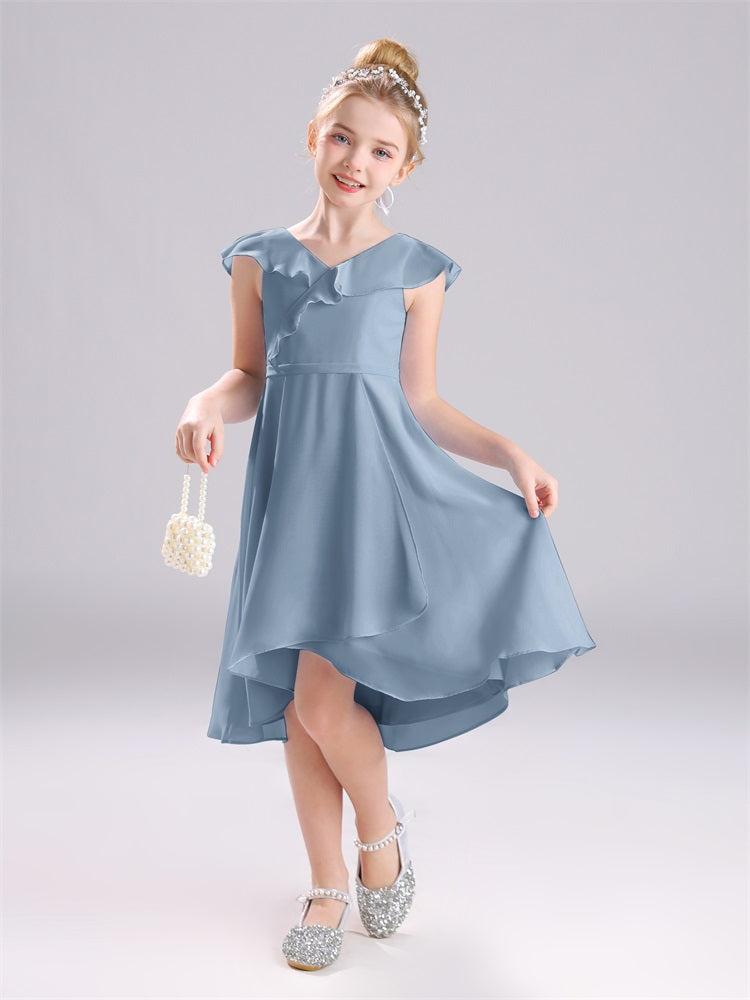 Rüschen V-Ausschnitt Tee-Länge Chiffon Junior Brautjungfernkleider