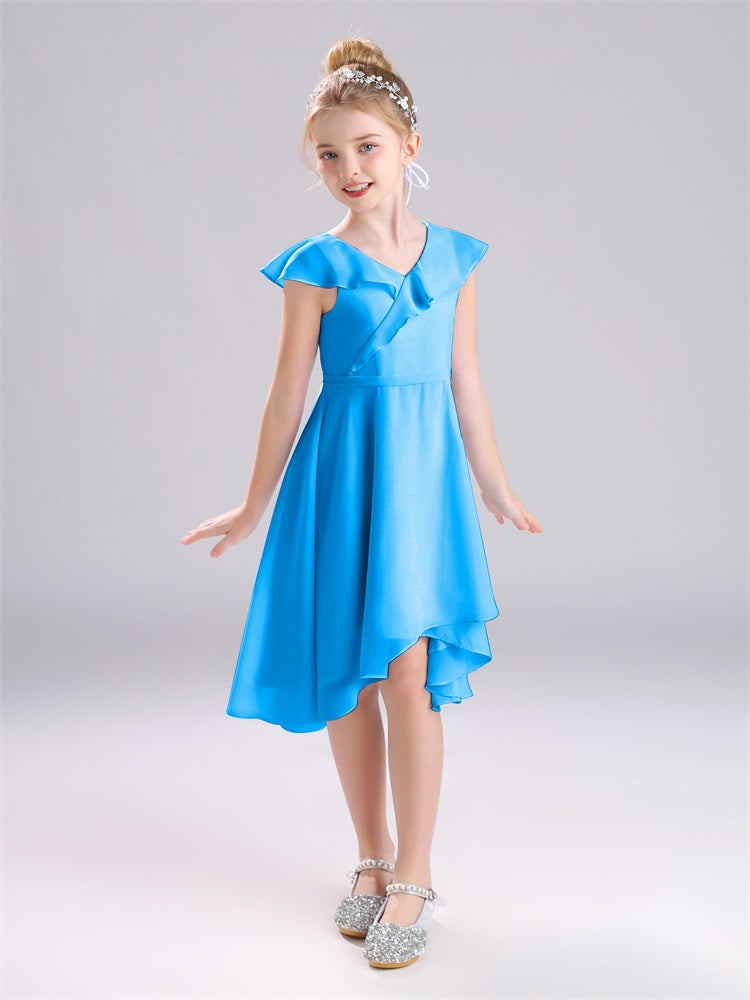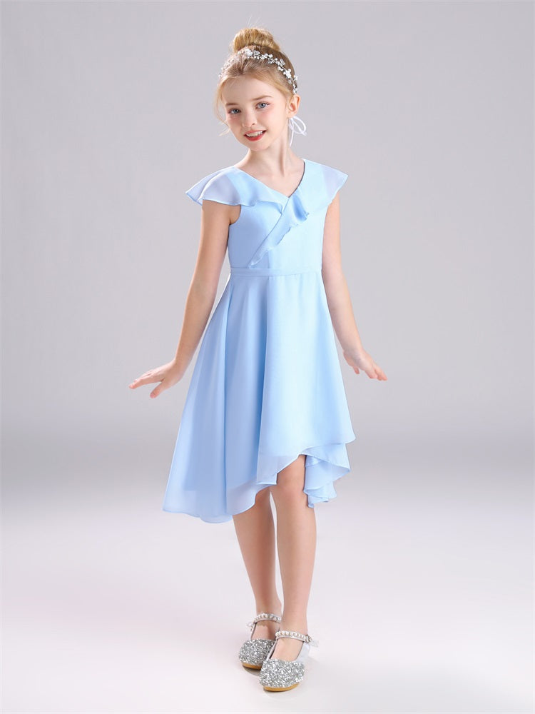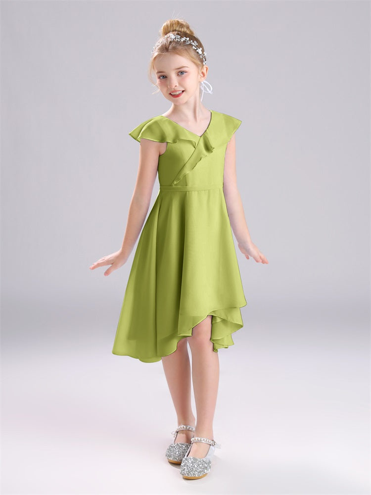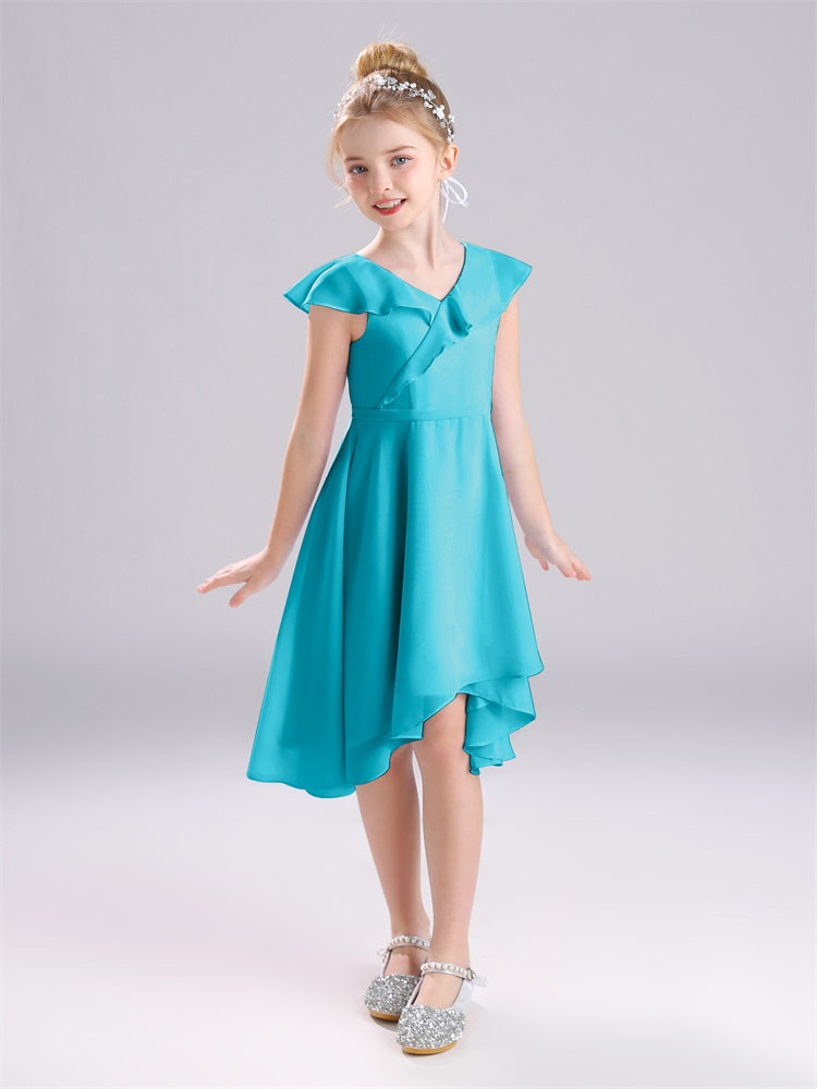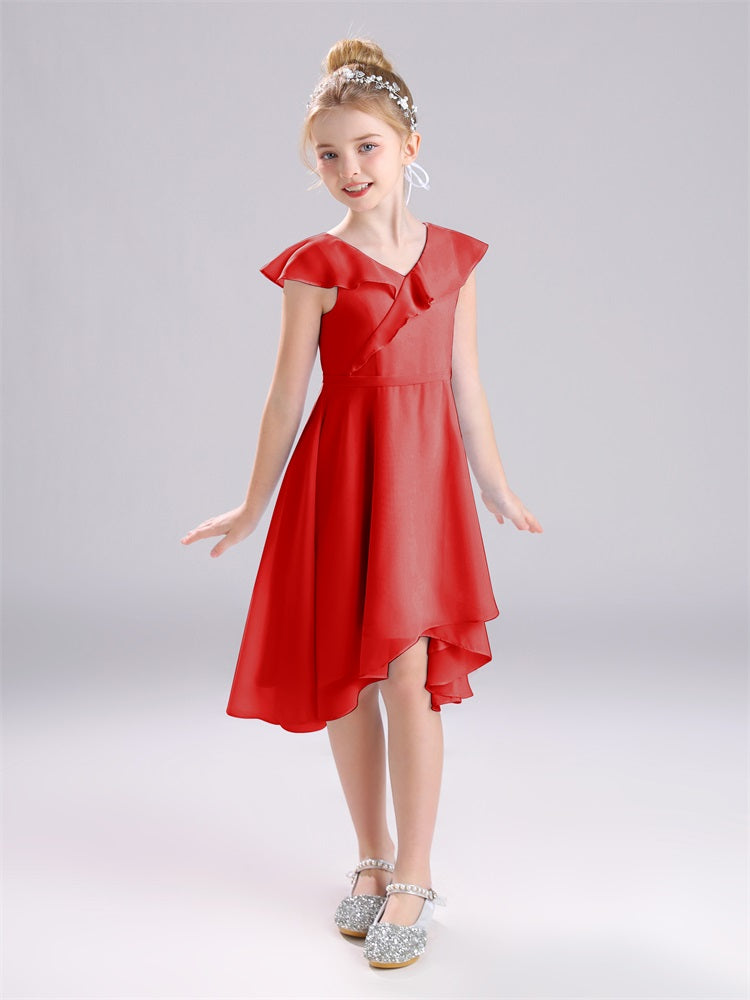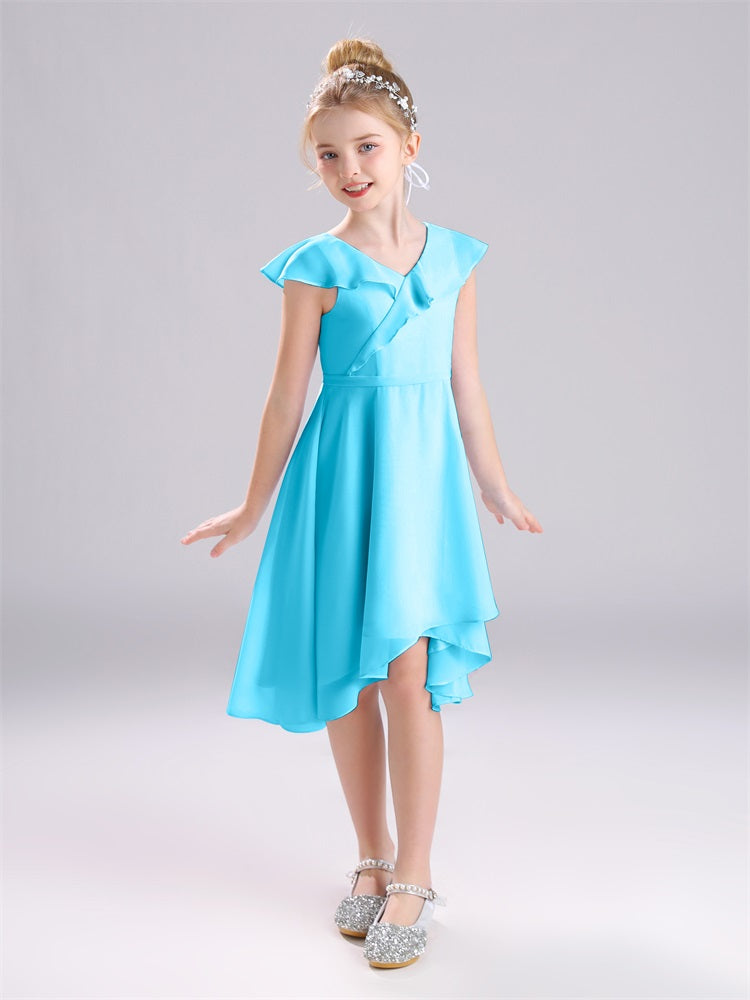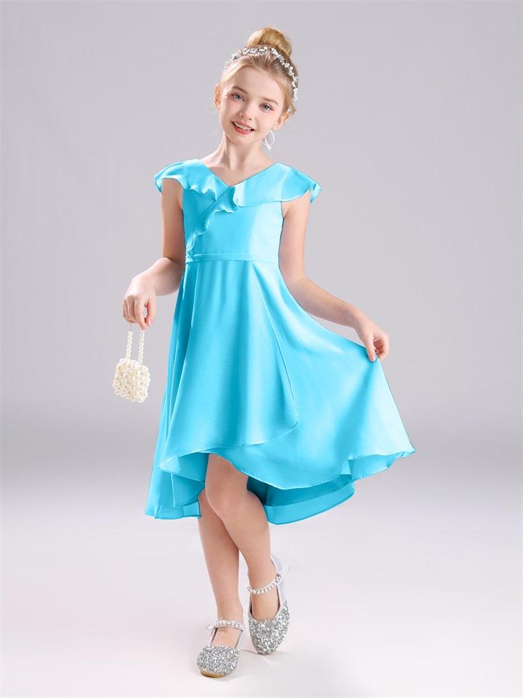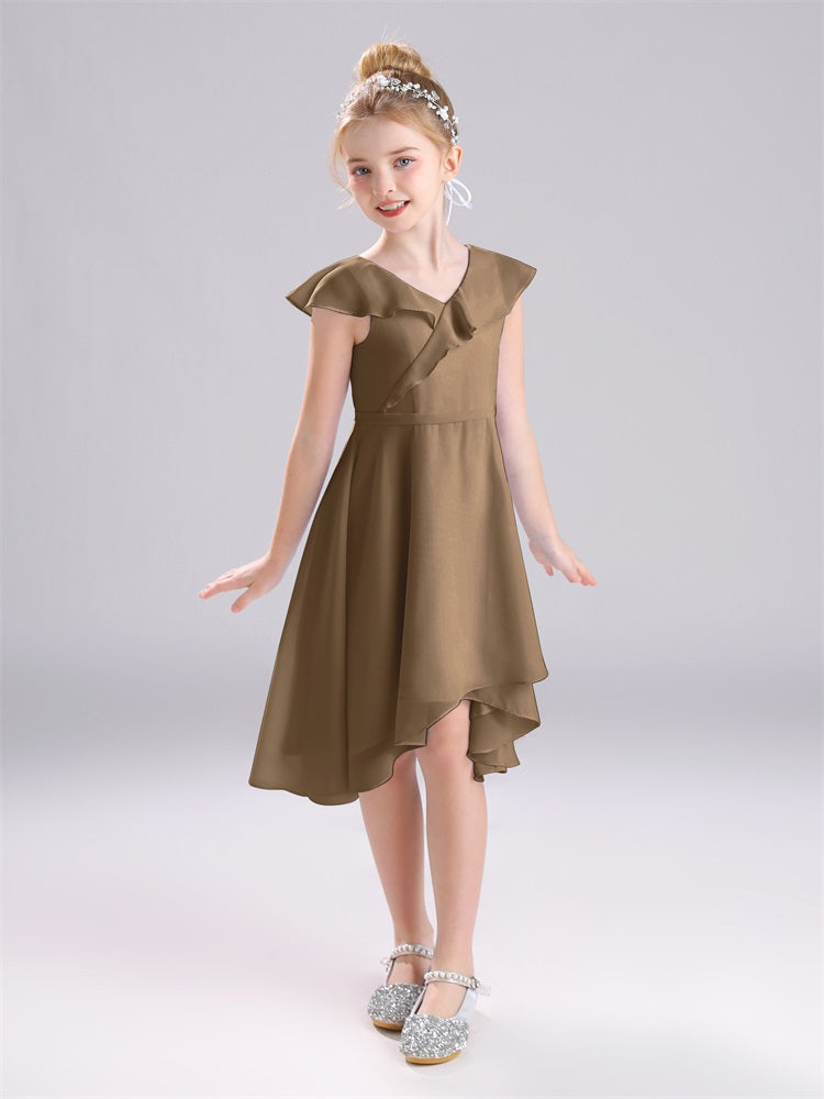 Rüschen V-Ausschnitt Tee-Länge Chiffon Junior Brautjungfernkleider