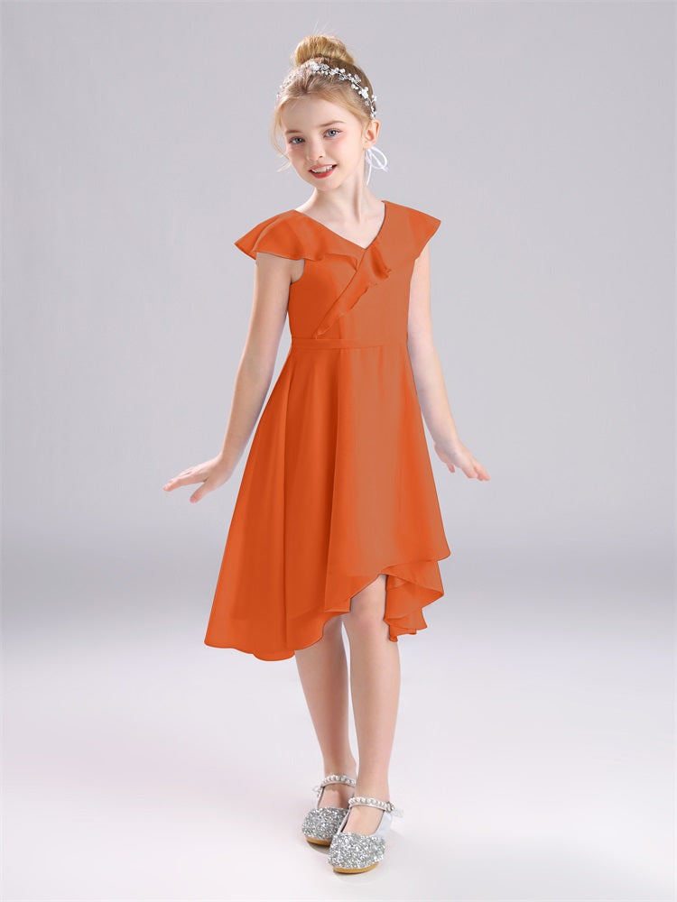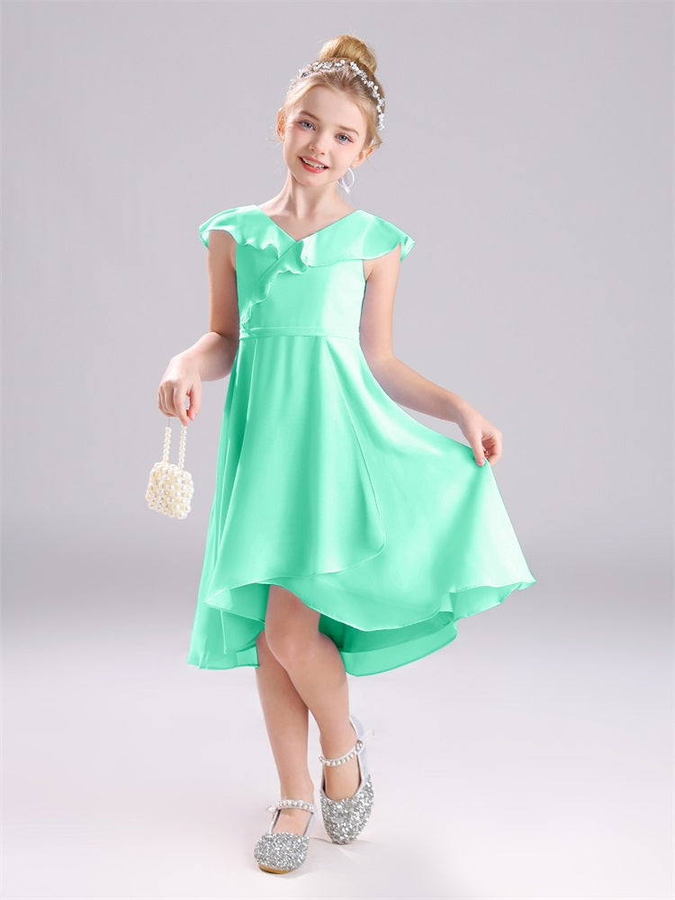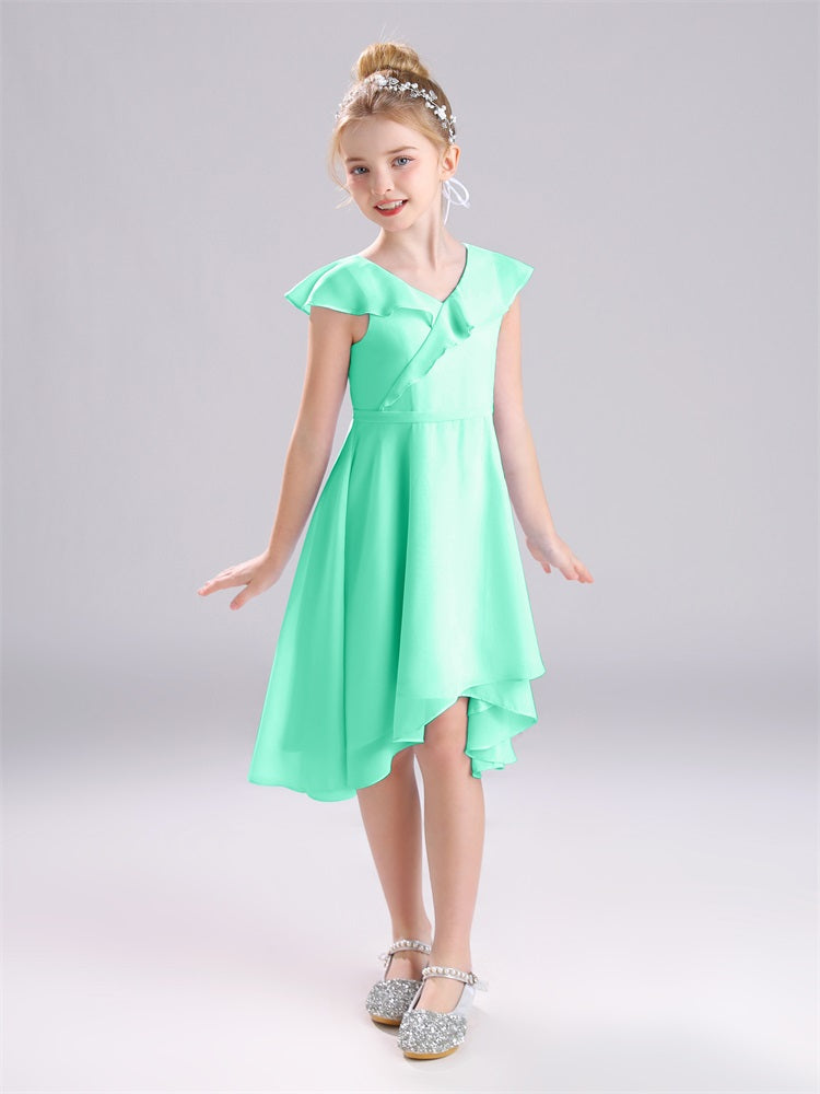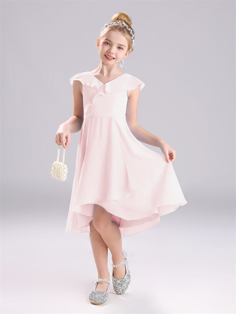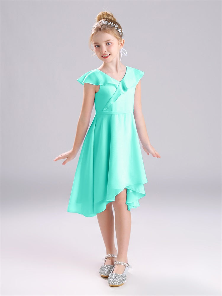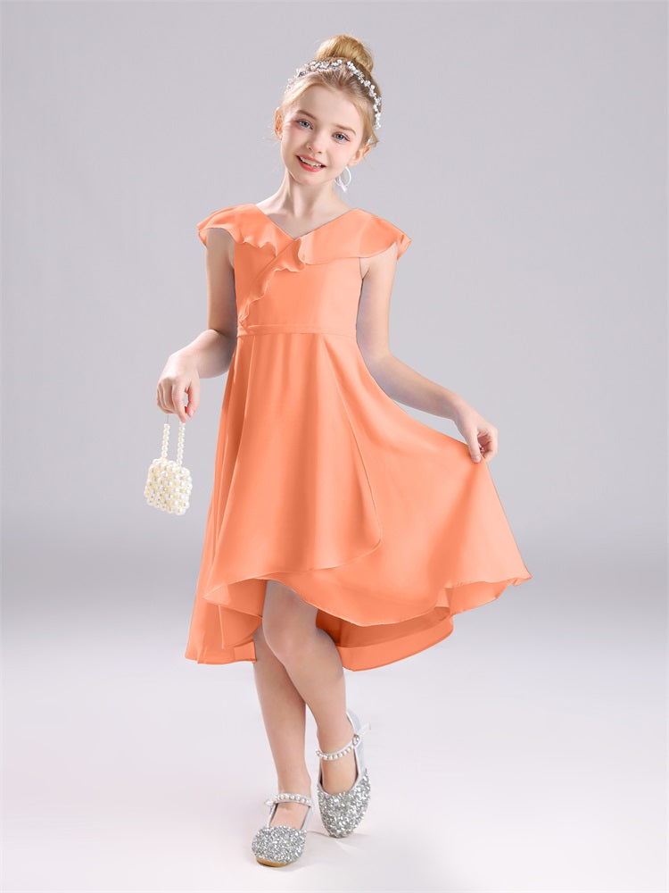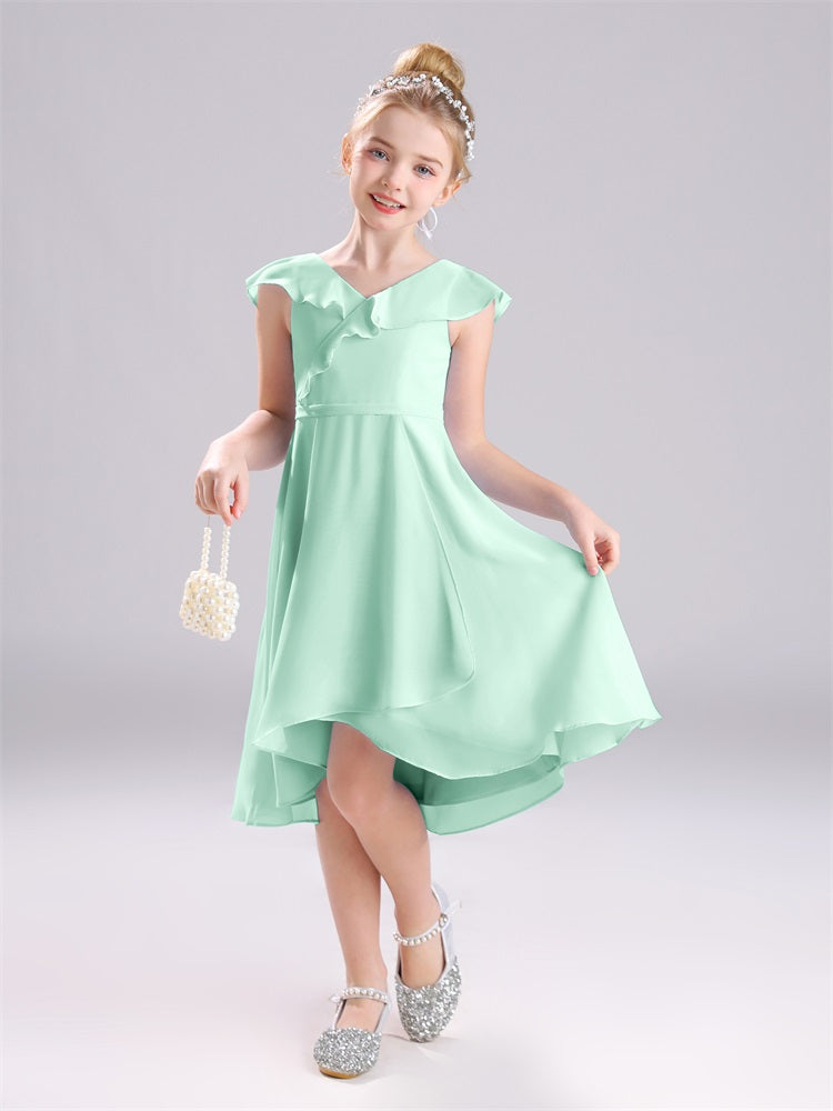 Dieses Chiffon-Brautjungfernkleid mit V-Ausschnitt und Rüschen in Teelänge ist eine elegante Wahl für Hochzeiten und formelle Anlässe. Das fließende Chiffon-Material und die zarten Rüschen verleihen dem Kleid einen eleganten Touch, während der teelange Stil perfekt für Junior-Brautjungfern ist. Dank der hochwertigen Konstruktion und des Designs ist es eine stilvolle und bequeme Option für junge Brautjungfern.