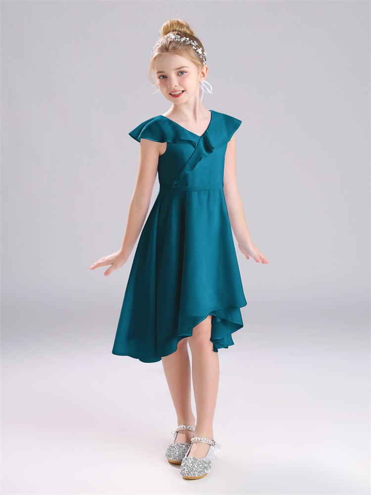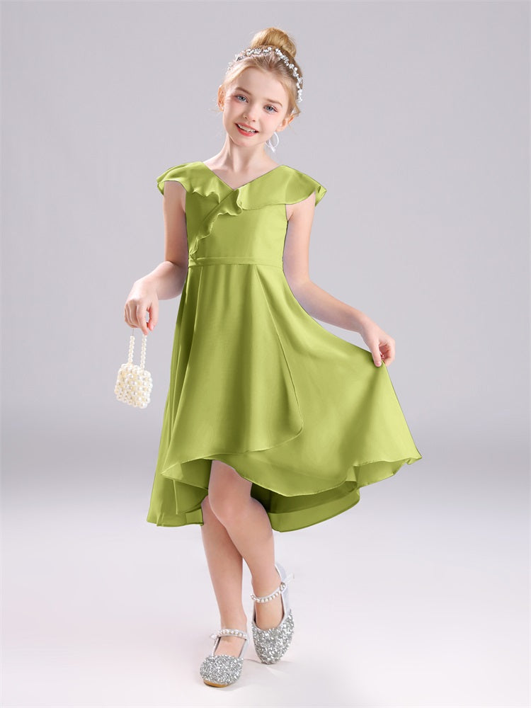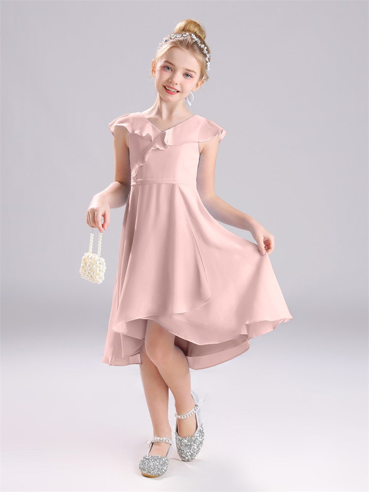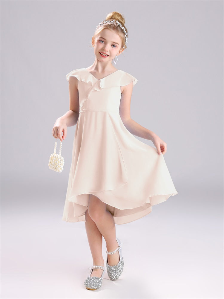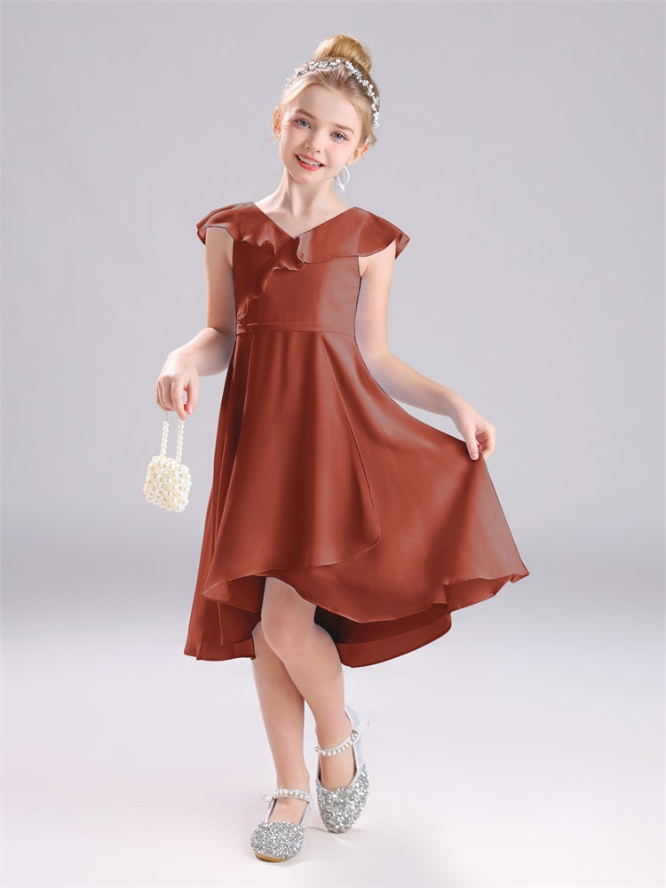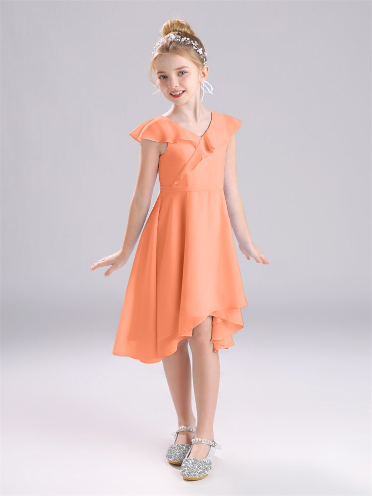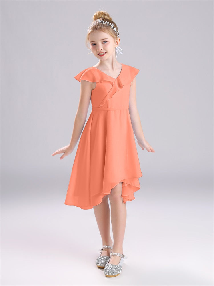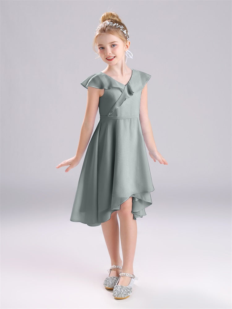Dieses Chiffon-Brautjungfernkleid mit V-Ausschnitt und Rüschen in Teelänge ist eine elegante Wahl für Hochzeiten und formelle Anlässe. Das fließende Chiffon-Material und die zarten Rüschen verleihen dem Kleid einen eleganten Touch, während der teelange Stil perfekt für Junior-Brautjungfern ist. Dank der hochwertigen Konstruktion und des Designs ist es eine stilvolle und bequeme Option für junge Brautjungfern.