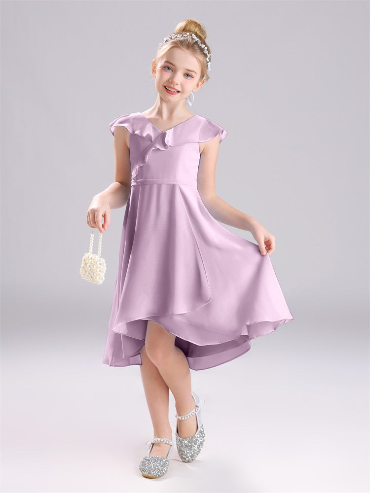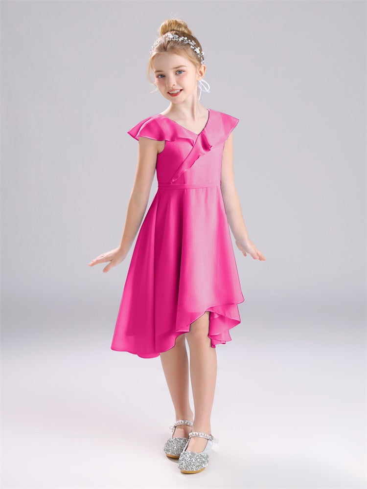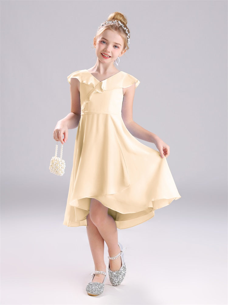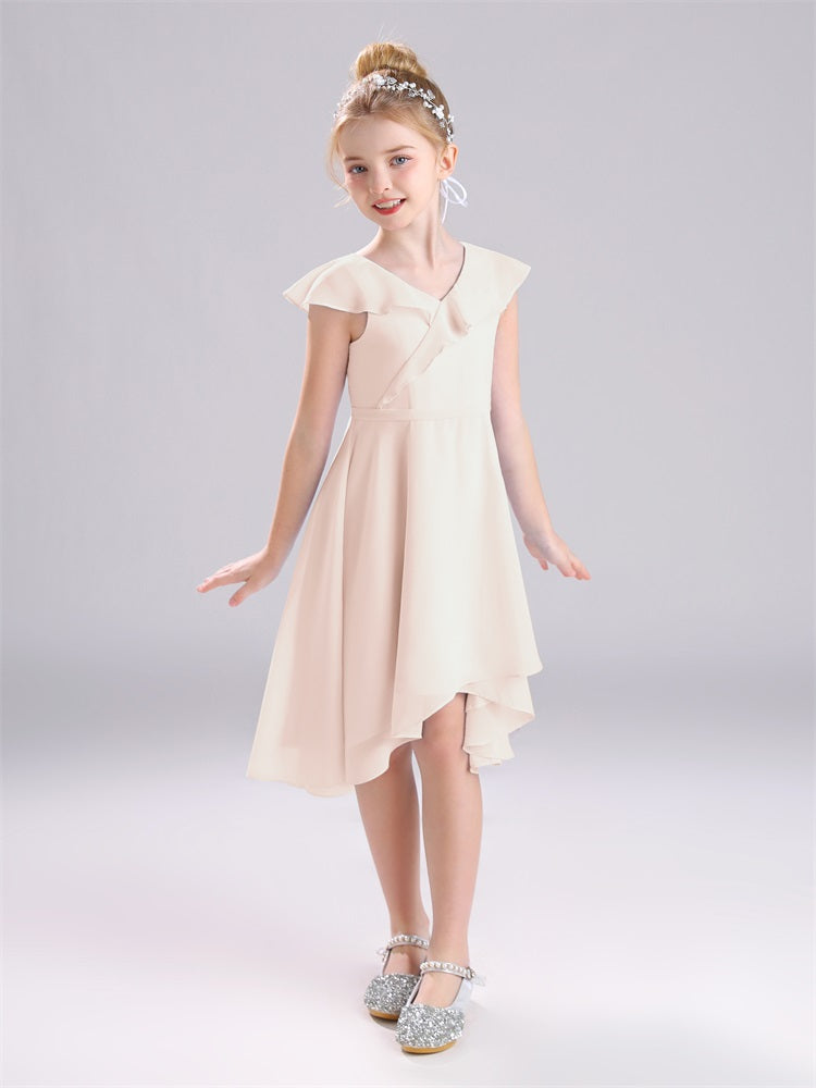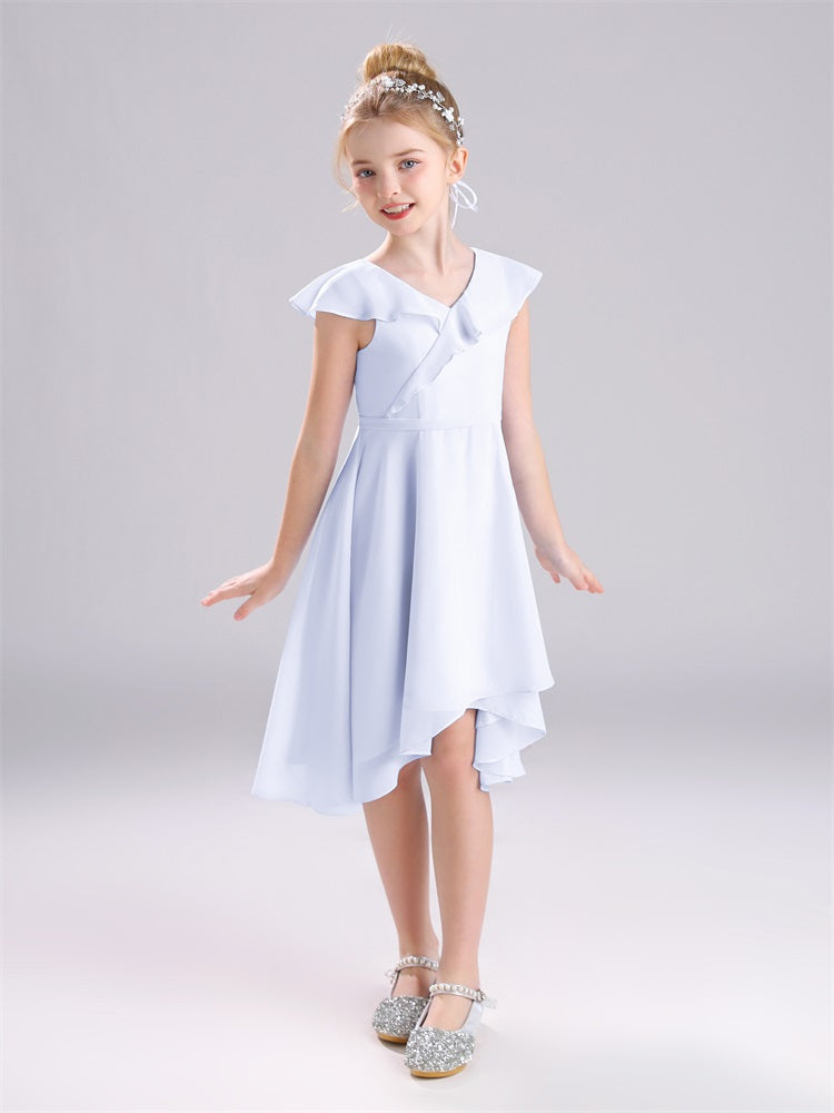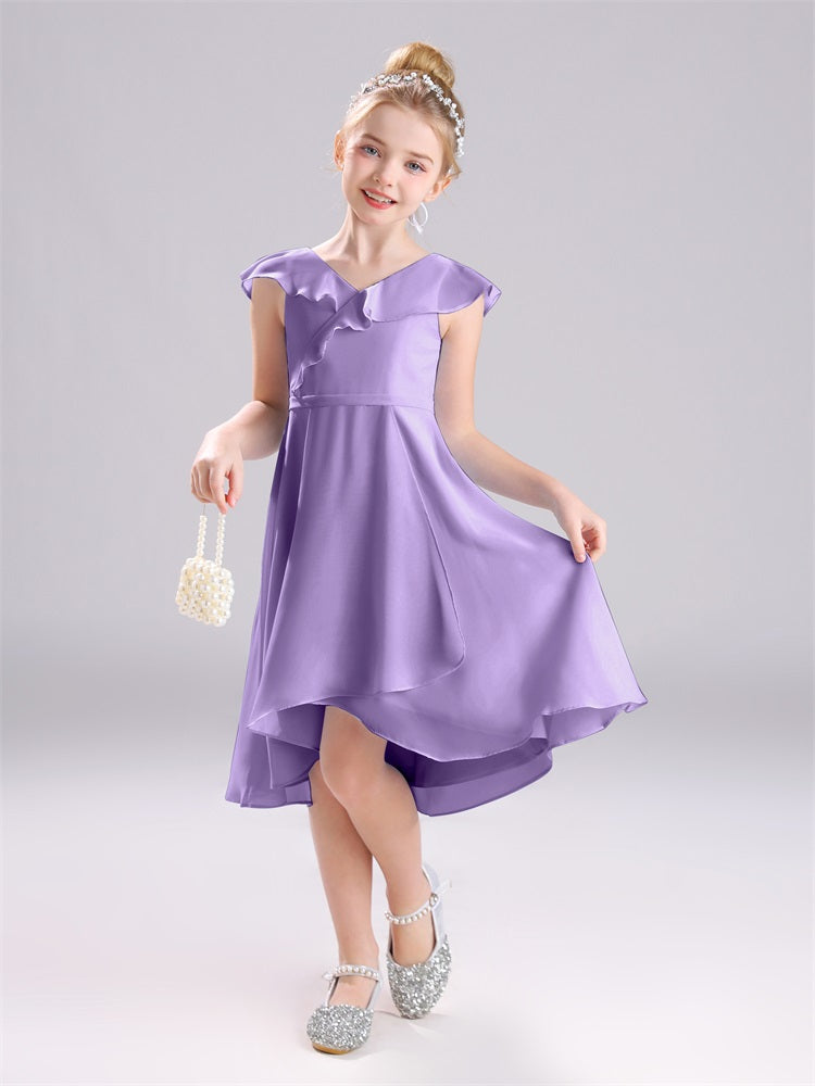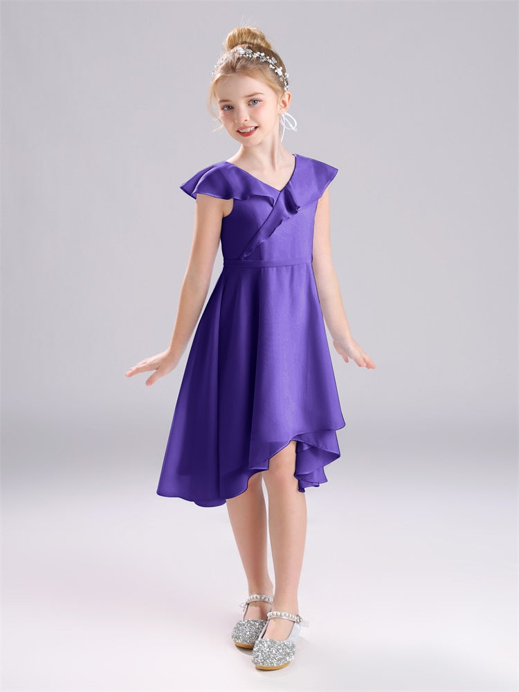Dieses Chiffon-Brautjungfernkleid mit V-Ausschnitt und Rüschen in Teelänge ist eine elegante Wahl für Hochzeiten und formelle Anlässe. Das fließende Chiffon-Material und die zarten Rüschen verleihen dem Kleid einen eleganten Touch, während der teelange Stil perfekt für Junior-Brautjungfern ist. Dank der hochwertigen Konstruktion und des Designs ist es eine stilvolle und bequeme Option für junge Brautjungfern.