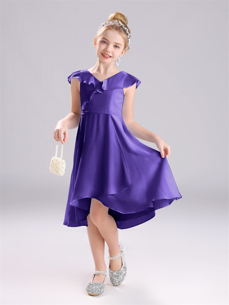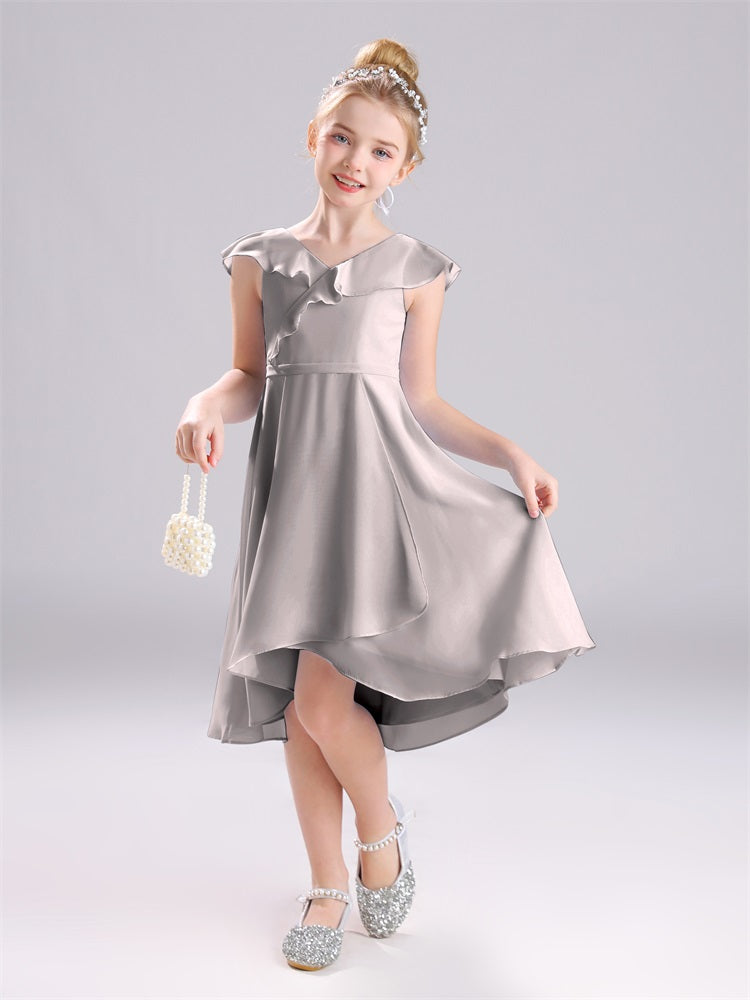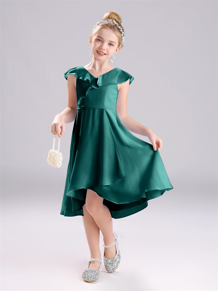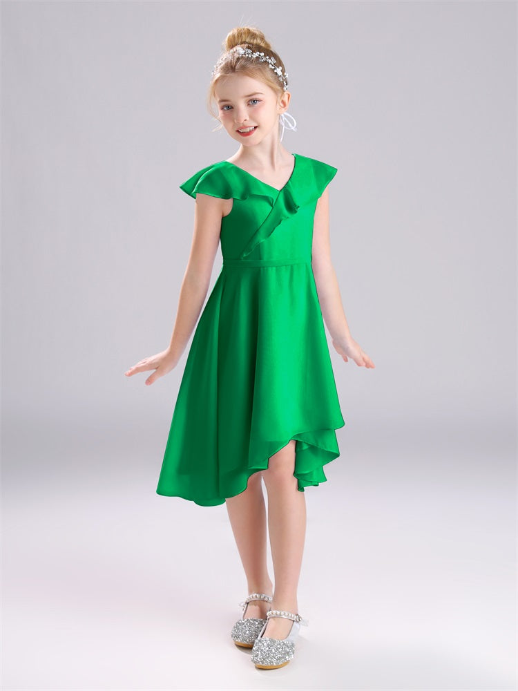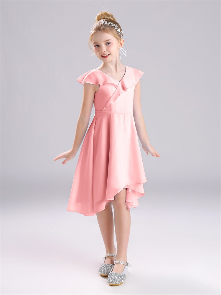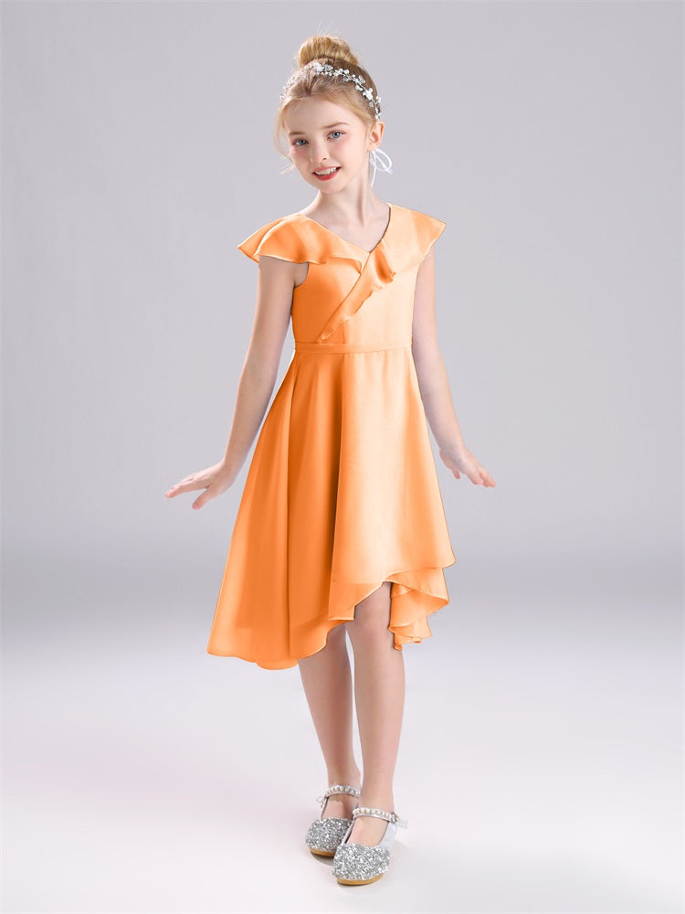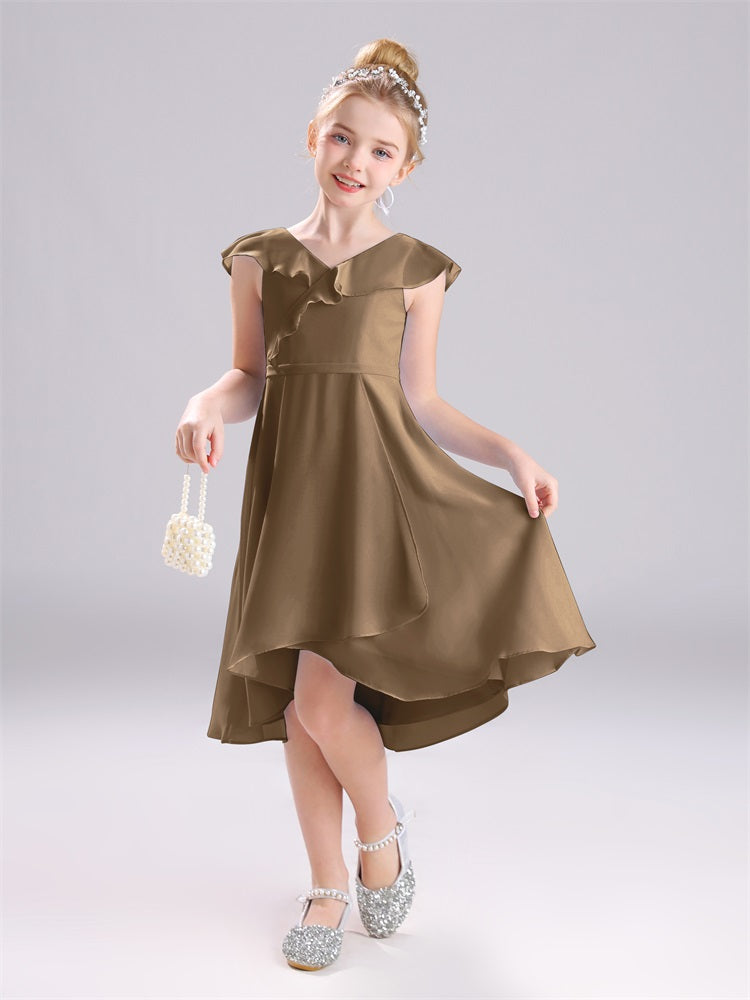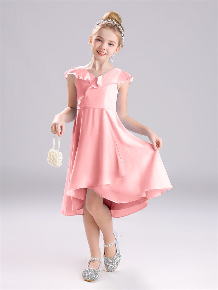 Dieses Chiffon-Brautjungfernkleid mit V-Ausschnitt und Rüschen in Teelänge ist eine elegante Wahl für Hochzeiten und formelle Anlässe. Das fließende Chiffon-Material und die zarten Rüschen verleihen dem Kleid einen eleganten Touch, während der teelange Stil perfekt für Junior-Brautjungfern ist. Dank der hochwertigen Konstruktion und des Designs ist es eine stilvolle und bequeme Option für junge Brautjungfern.