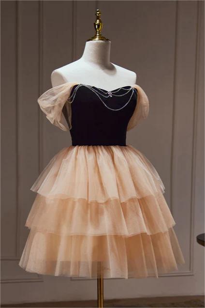 Schicke Champagner Off The Shoulder Perlen Tüll Kurze Ballkleider