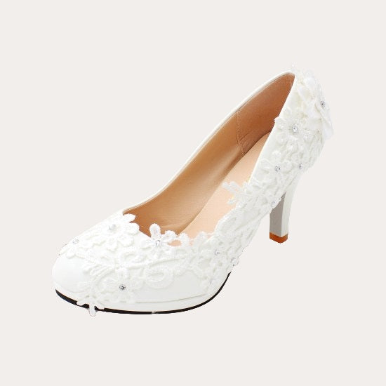 Diese wunderschönen Hochzeitsschuhe sind mit einer zarten Spitze und funkelnden Diamanten verziert. Die perfekte Wahl, um Ihrem Hochzeitslook Glanz zu verleihen. Tanzen Sie mit Komfort und Eleganz durch den schönsten Tag Ihres Lebens. Erhalten Sie zahlreiche Komplimente für Ihren atemberaubenden Stil.