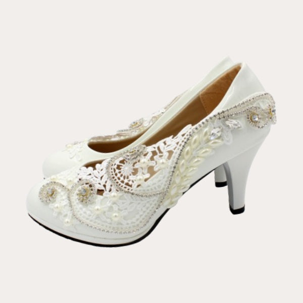 Verleihen Sie Ihrer Hochzeit einen eleganten Touch mit unseren Strass Rebe Perle Spitze Blatt Hochzeitsschuhen. Das filigrane Design aus Spitze und Perlen verleiht Ihnen einen glanzvollen Auftritt und lässt Sie strahlen. Perfekt für jeden Hochzeitsstil und sorgt für bequemen Tragekomfort den ganzen Tag lang.
