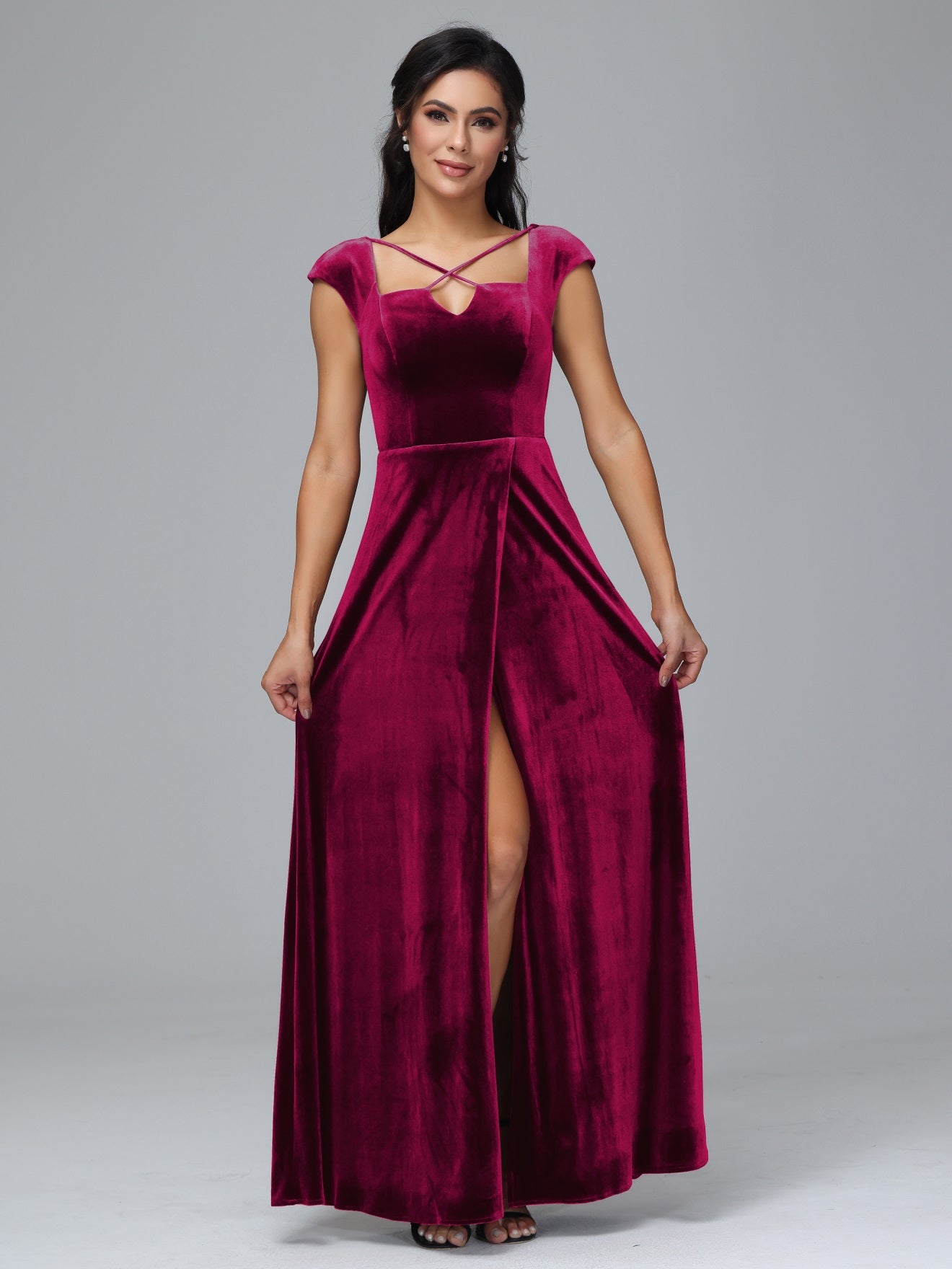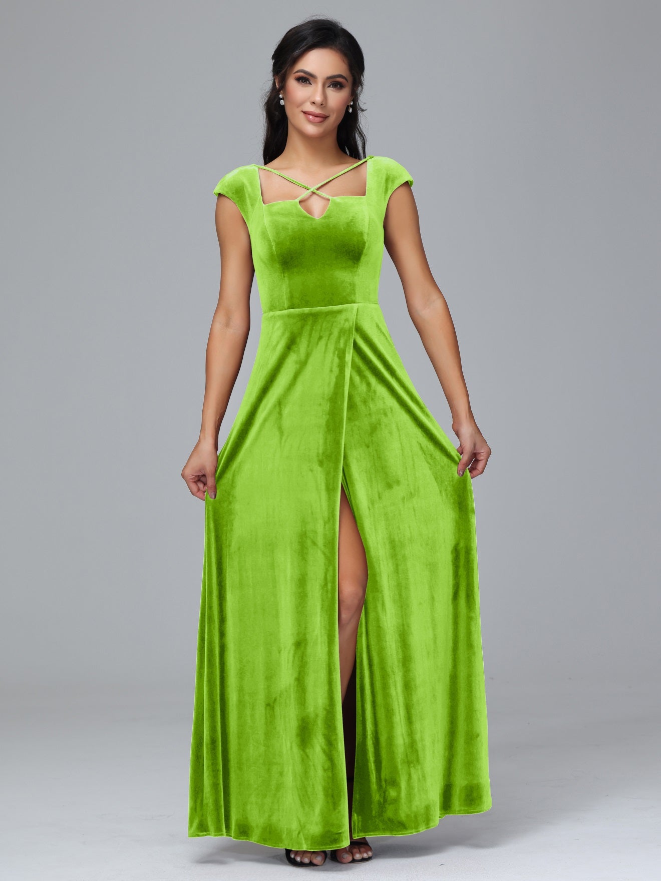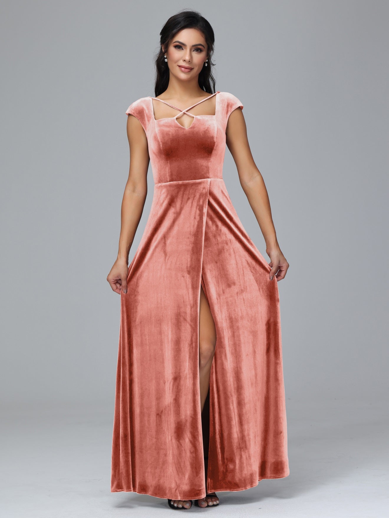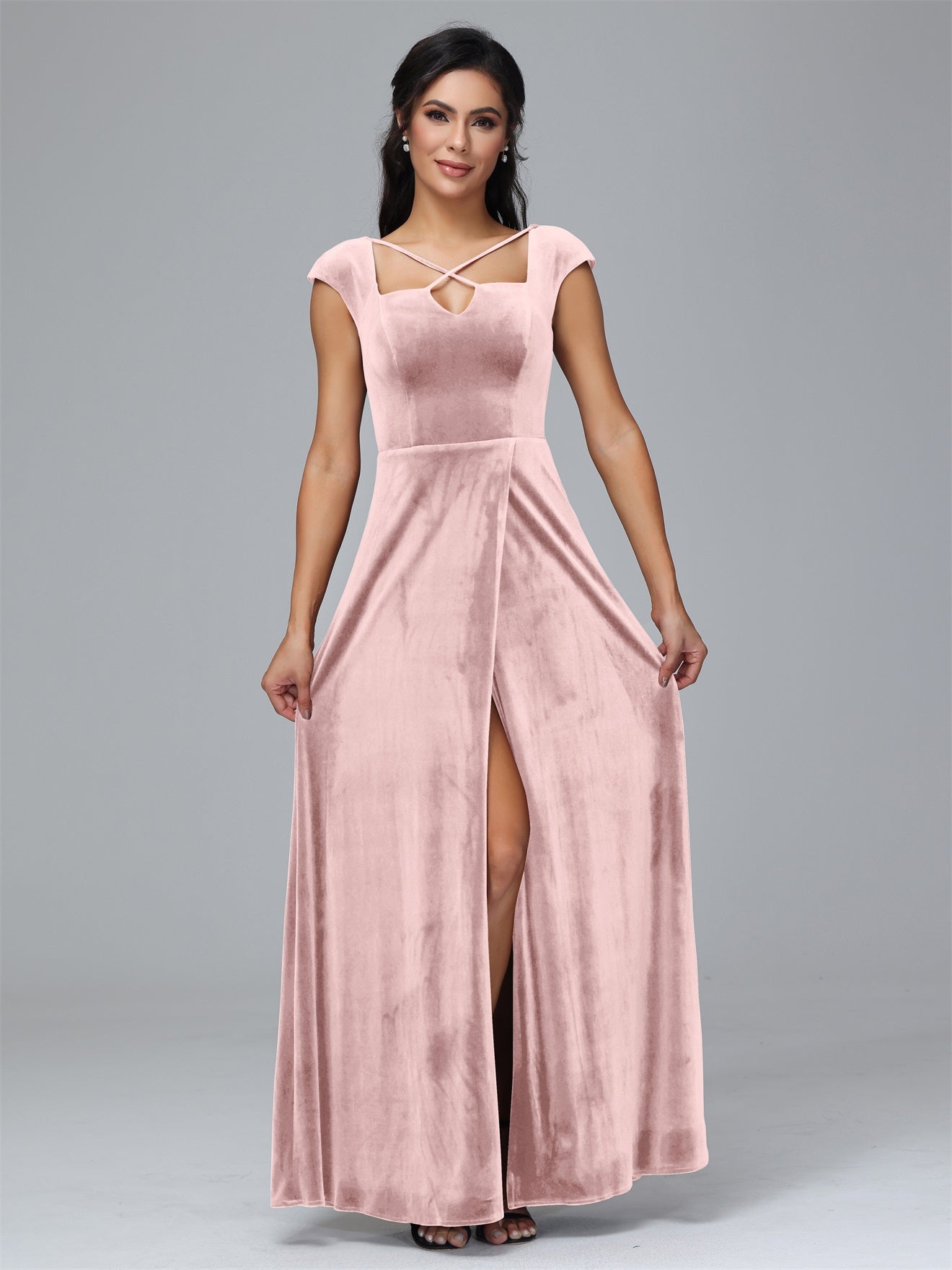 Übergröße Geschlitzter quadratischer Ausschnitt Samt mit Ärmeln Brautjungfernkleider