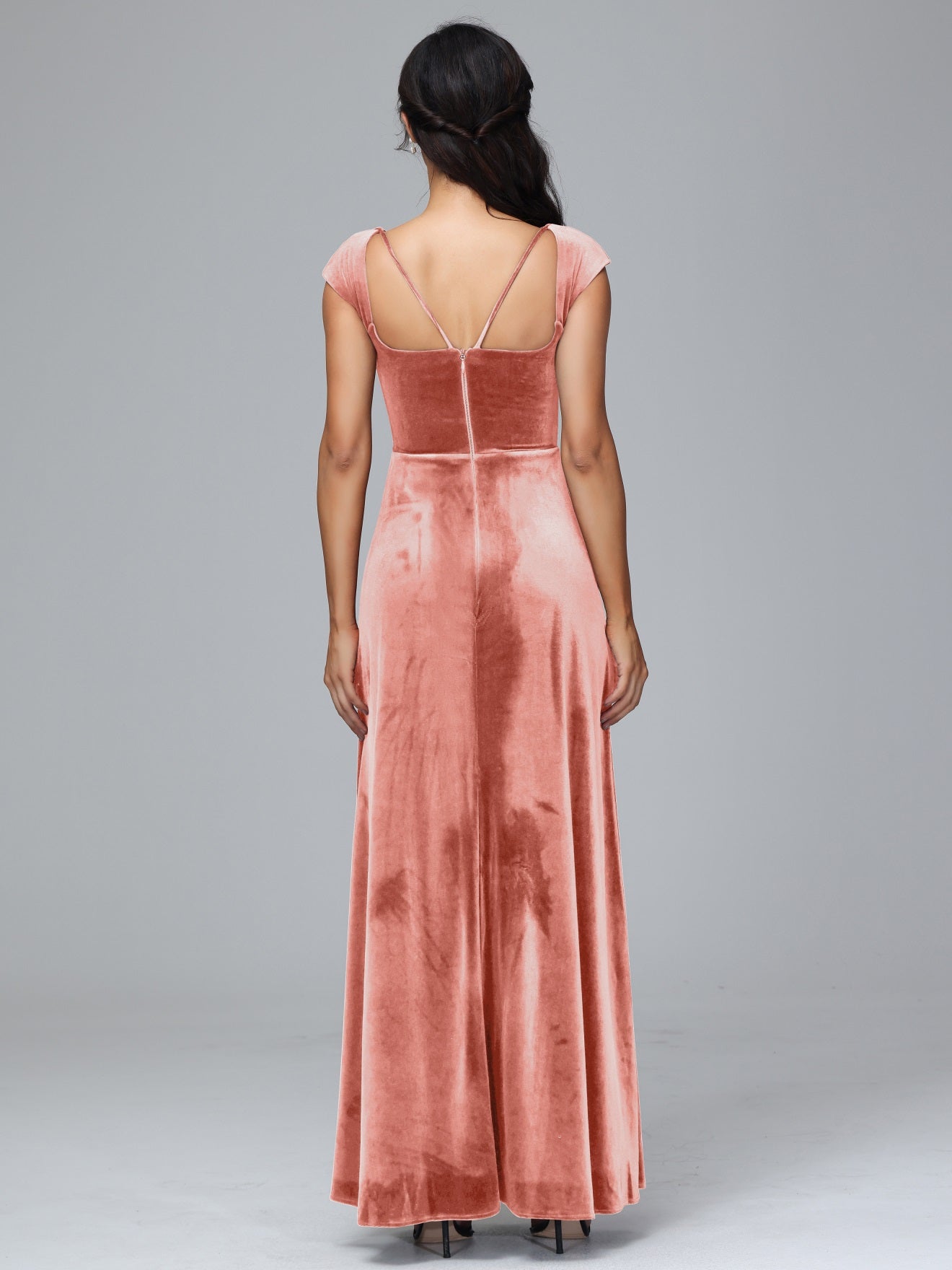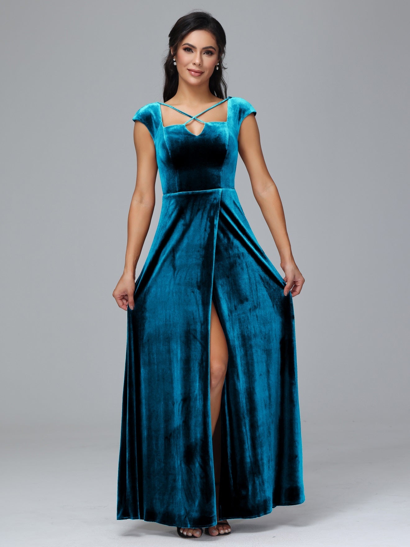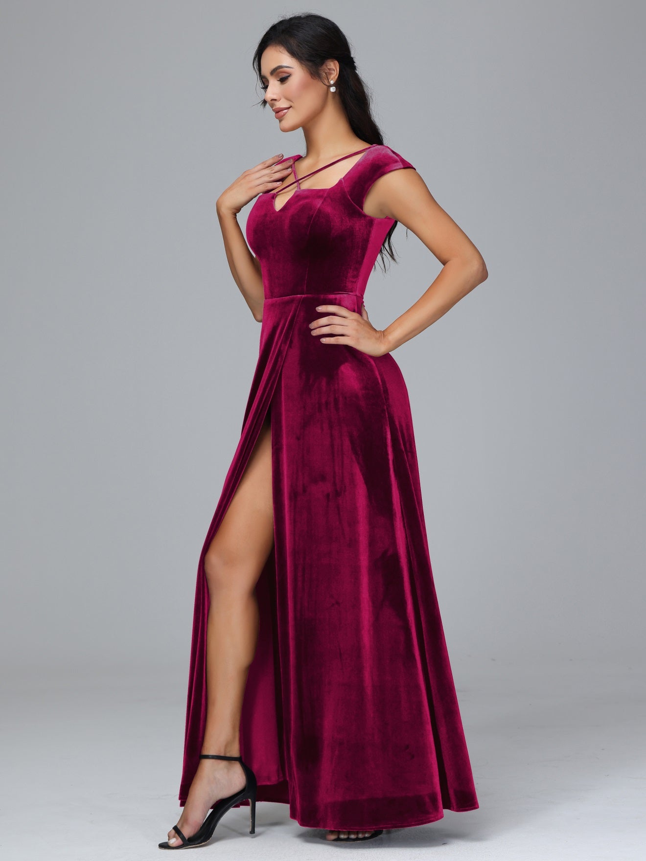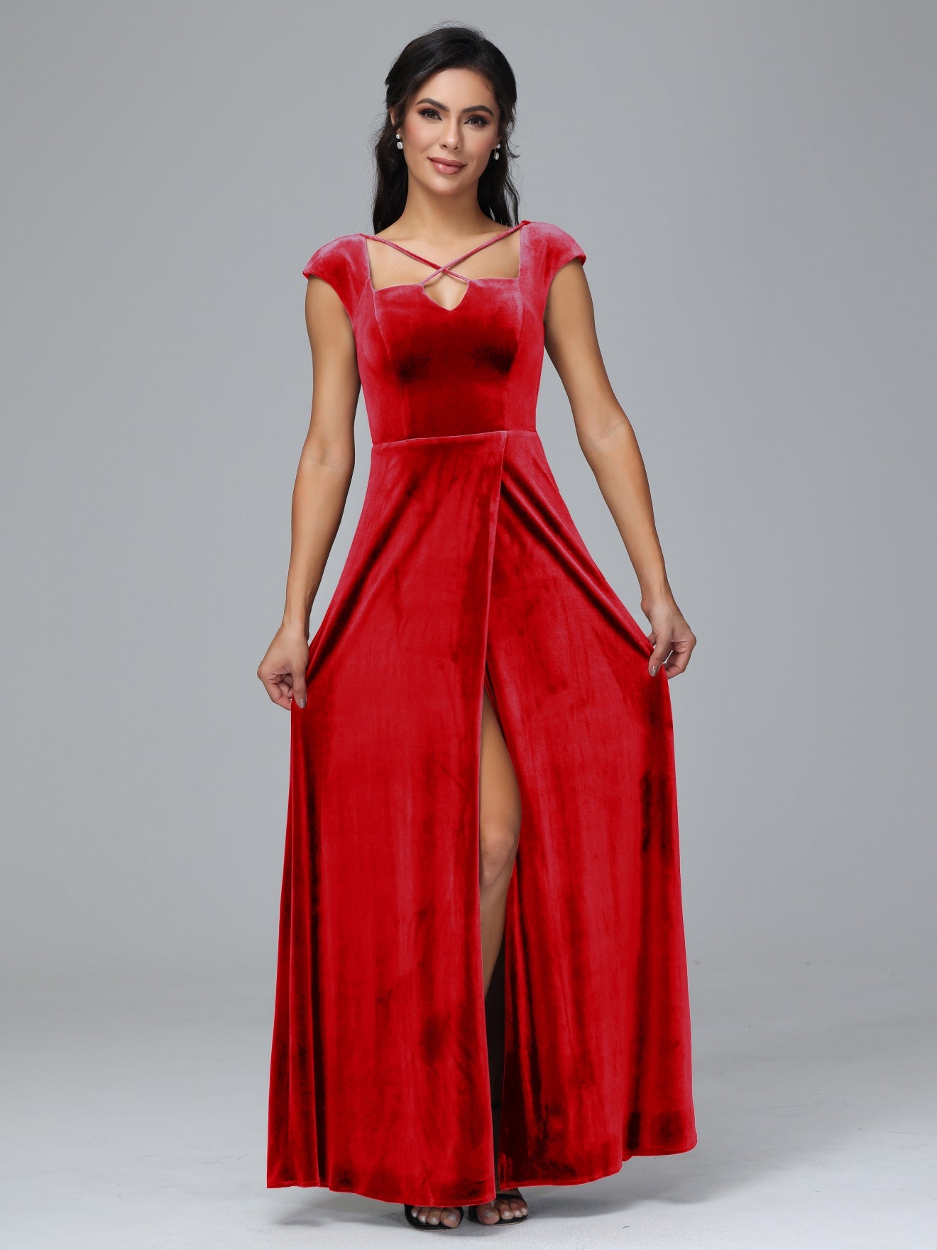 Übergröße Geschlitzter quadratischer Ausschnitt Samt mit Ärmeln Brautjungfernkleider