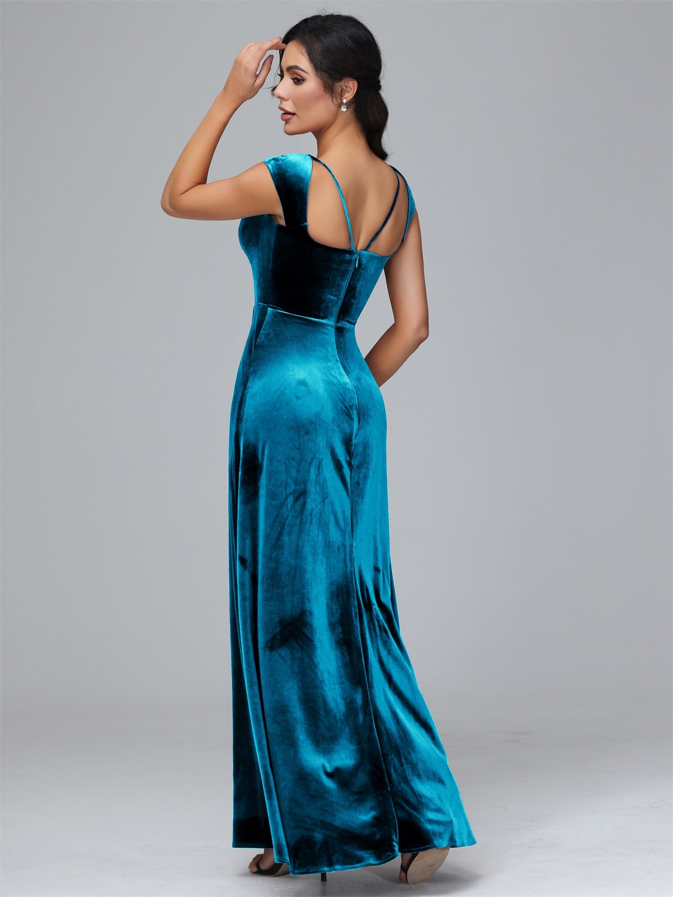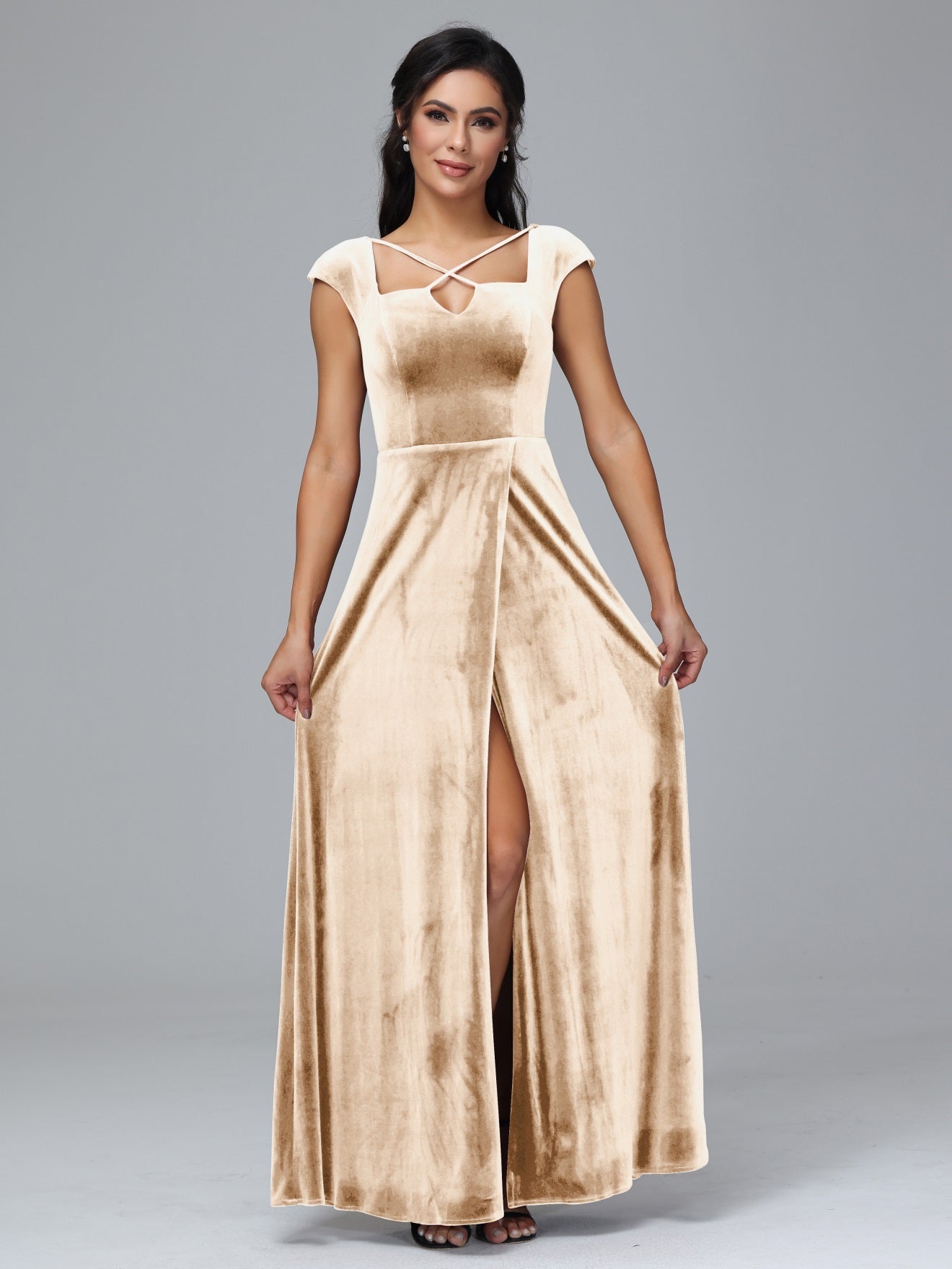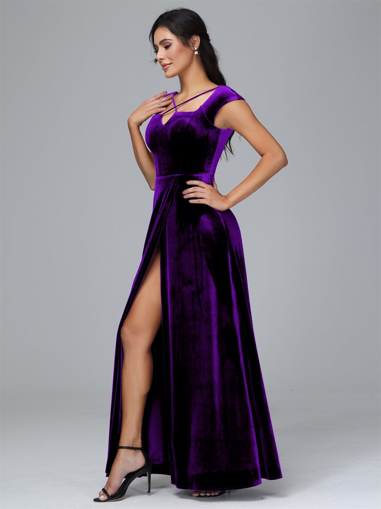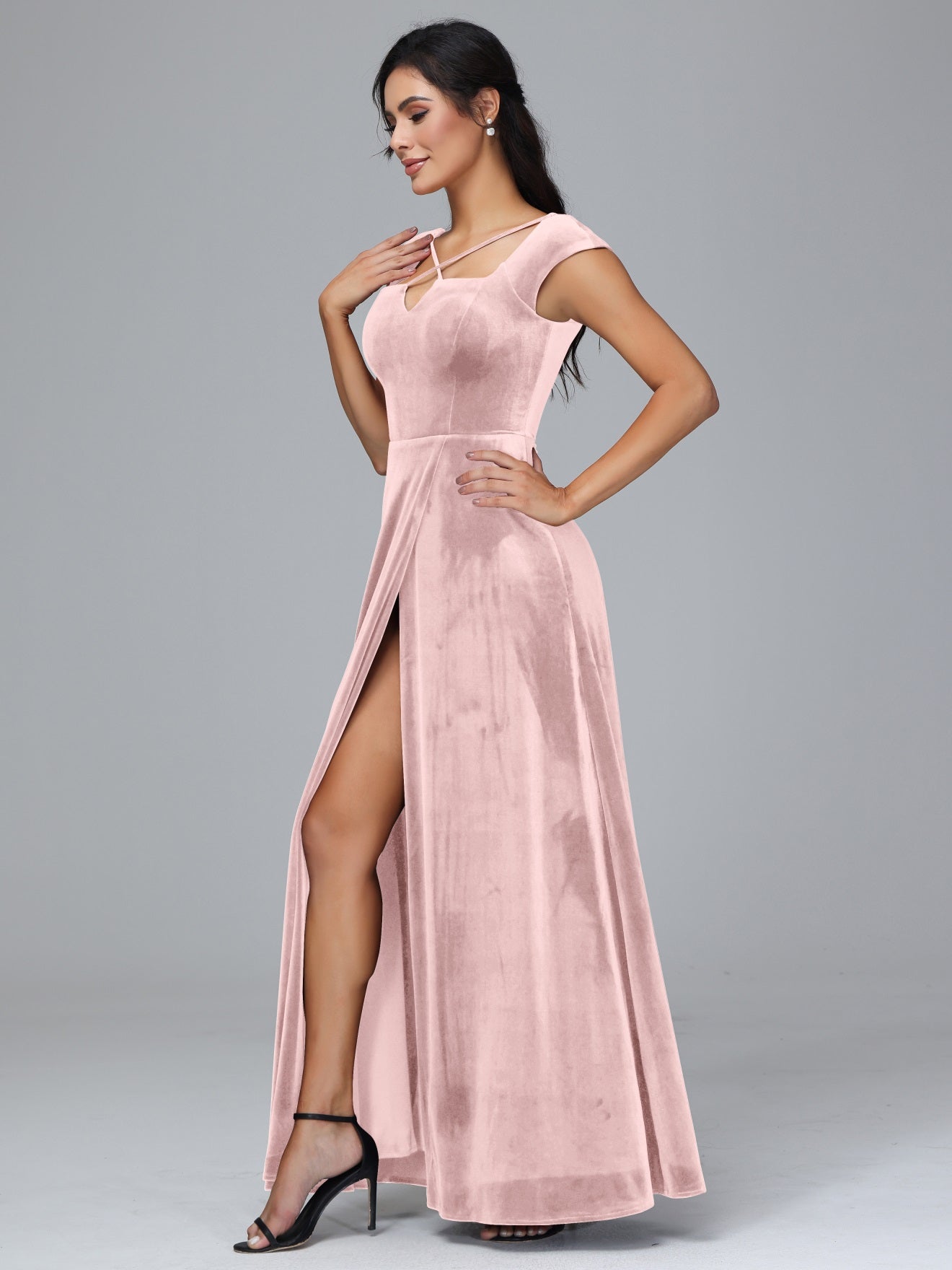 Übergröße Geschlitzter quadratischer Ausschnitt Samt mit Ärmeln Brautjungfernkleider