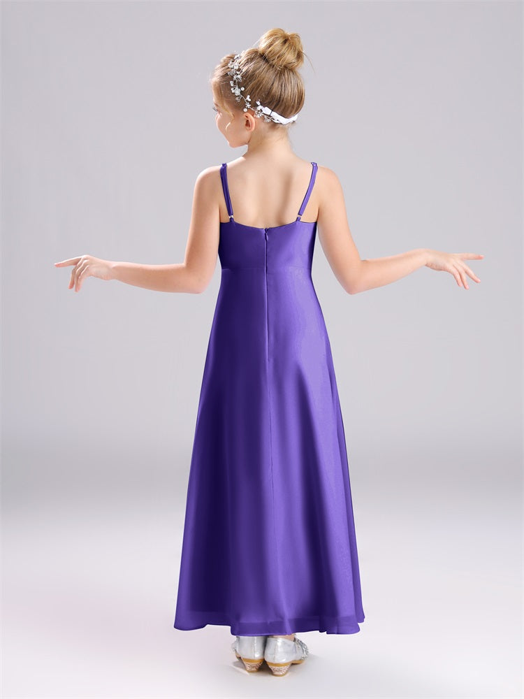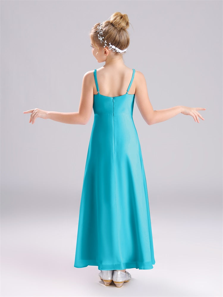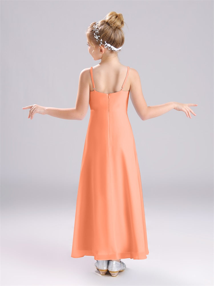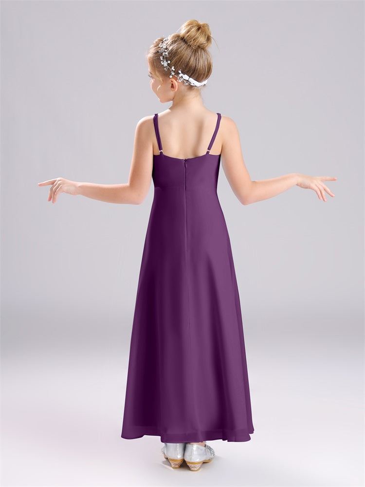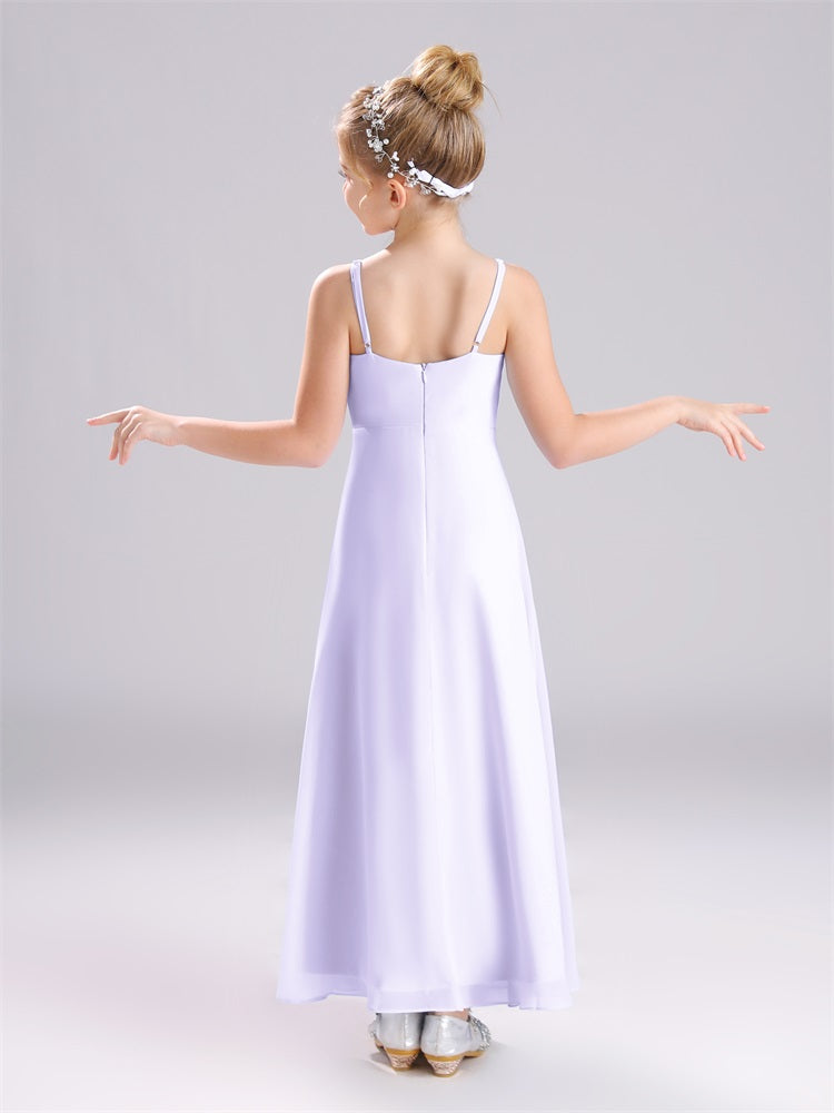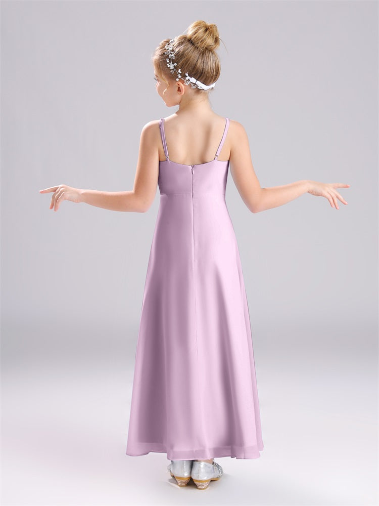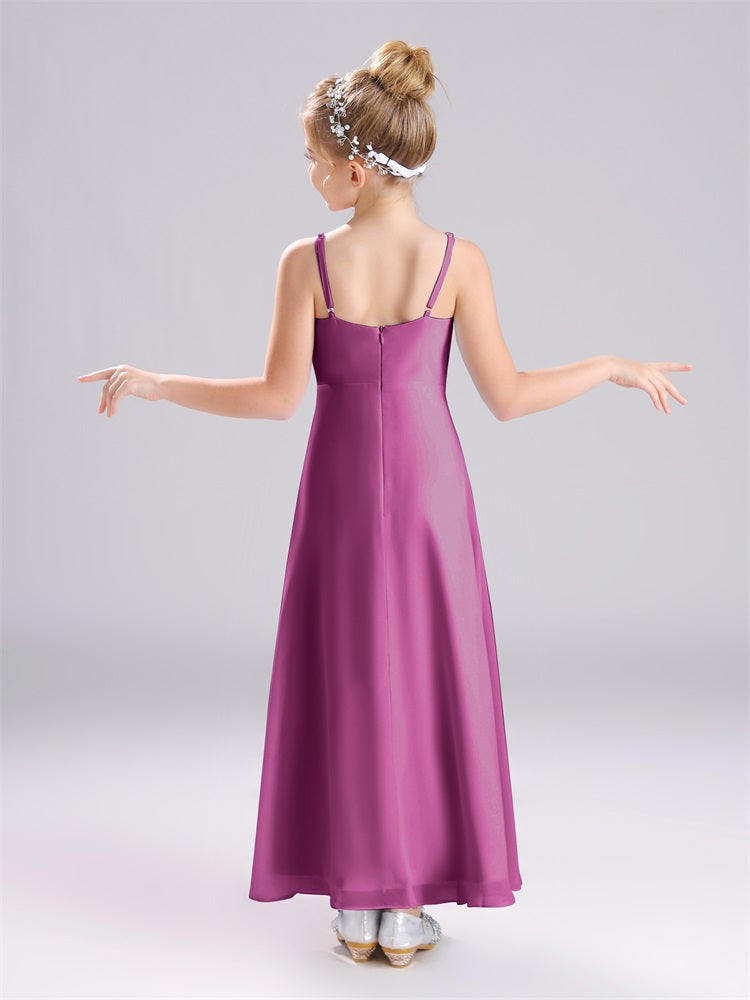 Dieses Junior-Brautjungfernkleid mit V-Ausschnitt verfügt über Spaghettiträger, Falten und Chiffonmaterial. Sein elegantes Design und die bequeme Passform machen es zur perfekten Wahl für jede Hochzeit. Die Plisseefalten verleihen ihm einen Hauch von Raffinesse, während der Chiffon ein leichtes und fließendes Gefühl vermittelt. Sehen Sie umwerfend aus und fühlen Sie sich selbstbewusst an Ihrem großen Tag.