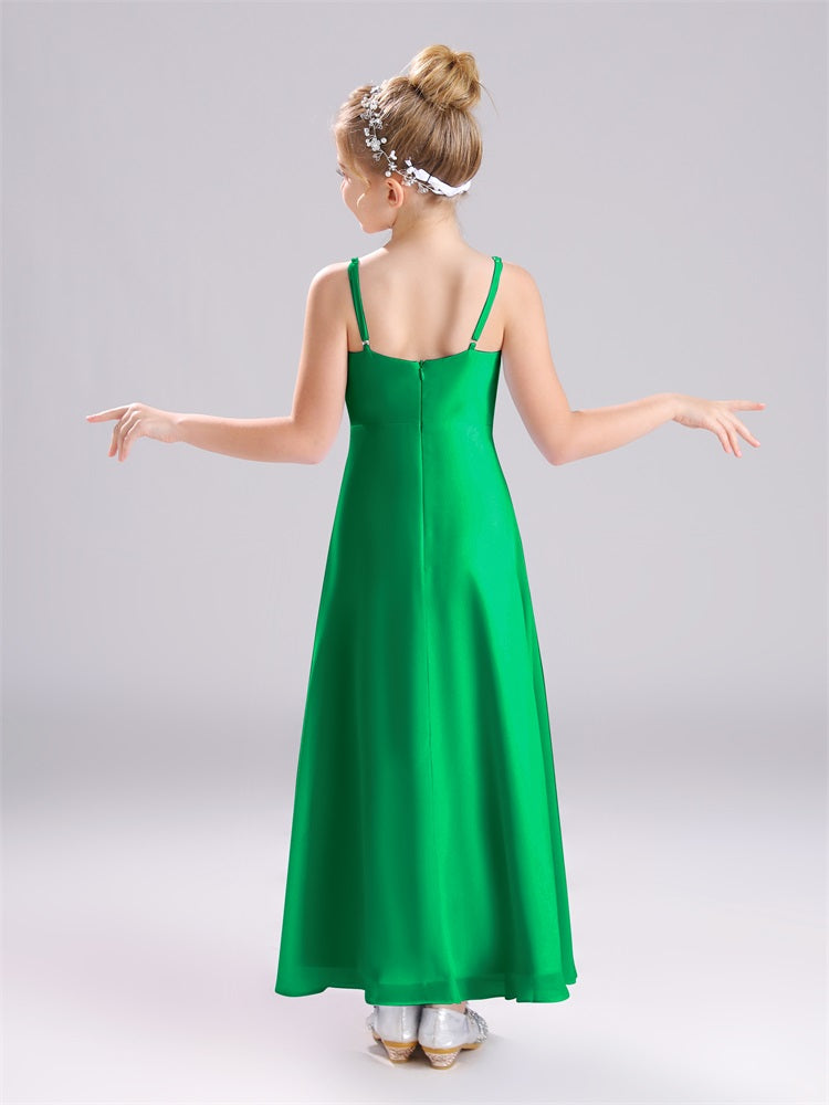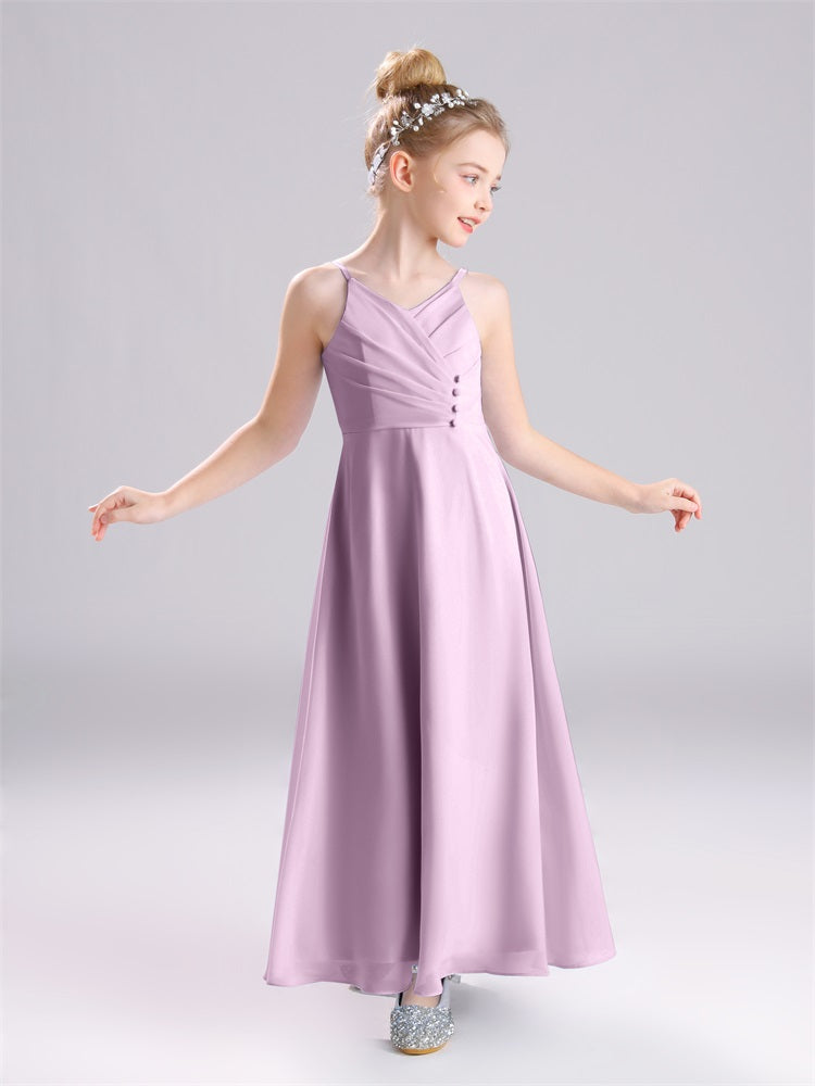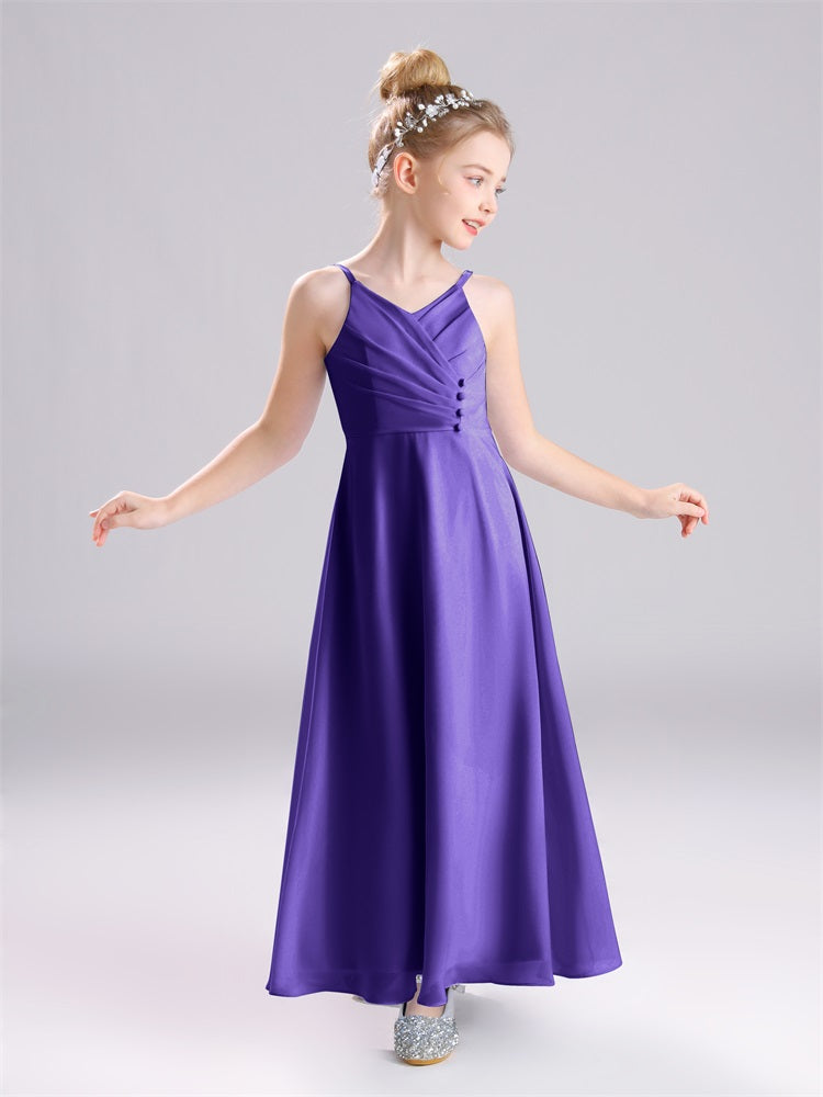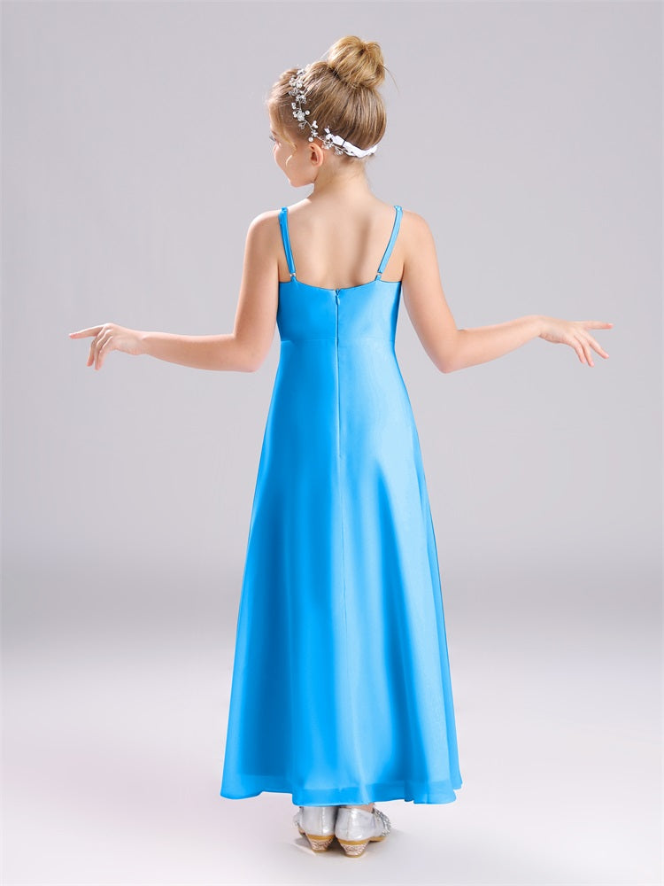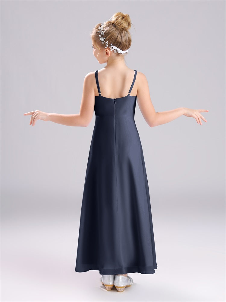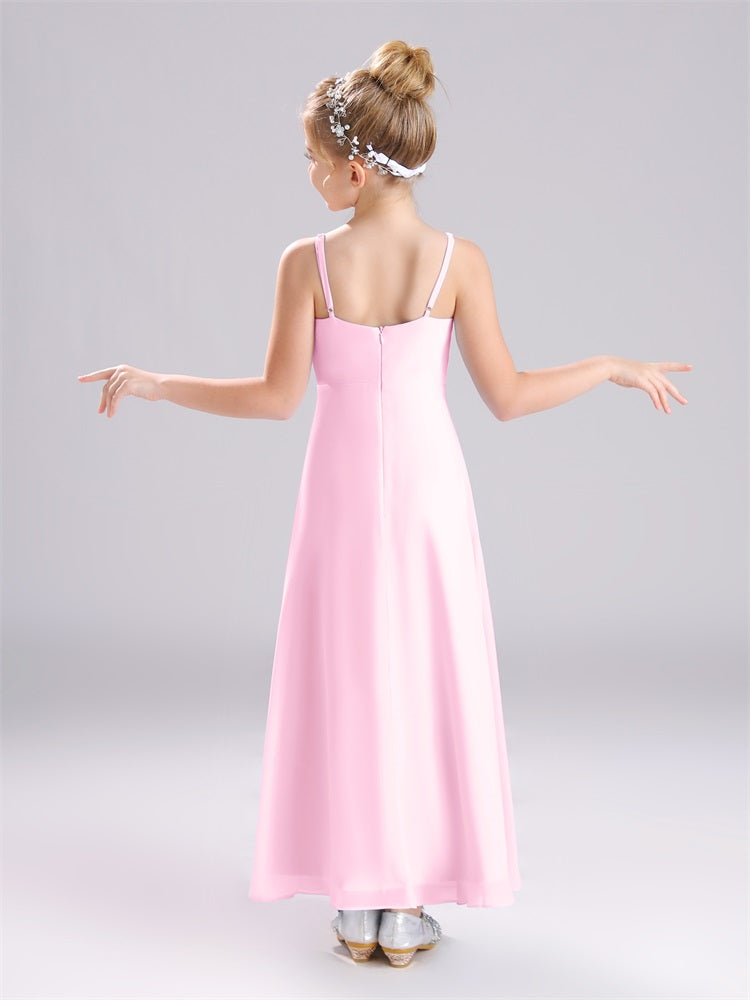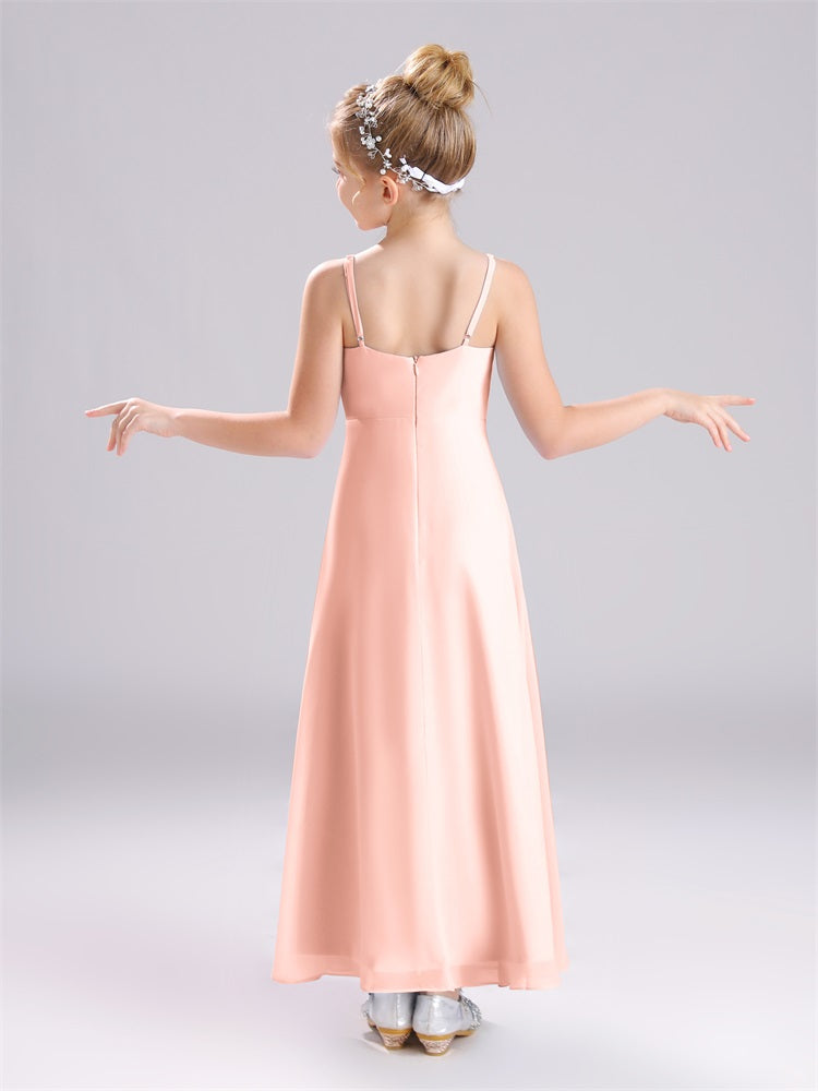 Dieses Junior-Brautjungfernkleid mit V-Ausschnitt verfügt über Spaghettiträger, Falten und Chiffonmaterial. Sein elegantes Design und die bequeme Passform machen es zur perfekten Wahl für jede Hochzeit. Die Plisseefalten verleihen ihm einen Hauch von Raffinesse, während der Chiffon ein leichtes und fließendes Gefühl vermittelt. Sehen Sie umwerfend aus und fühlen Sie sich selbstbewusst an Ihrem großen Tag.