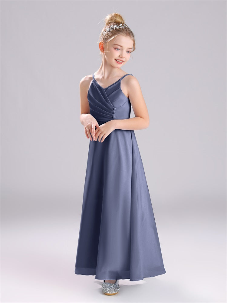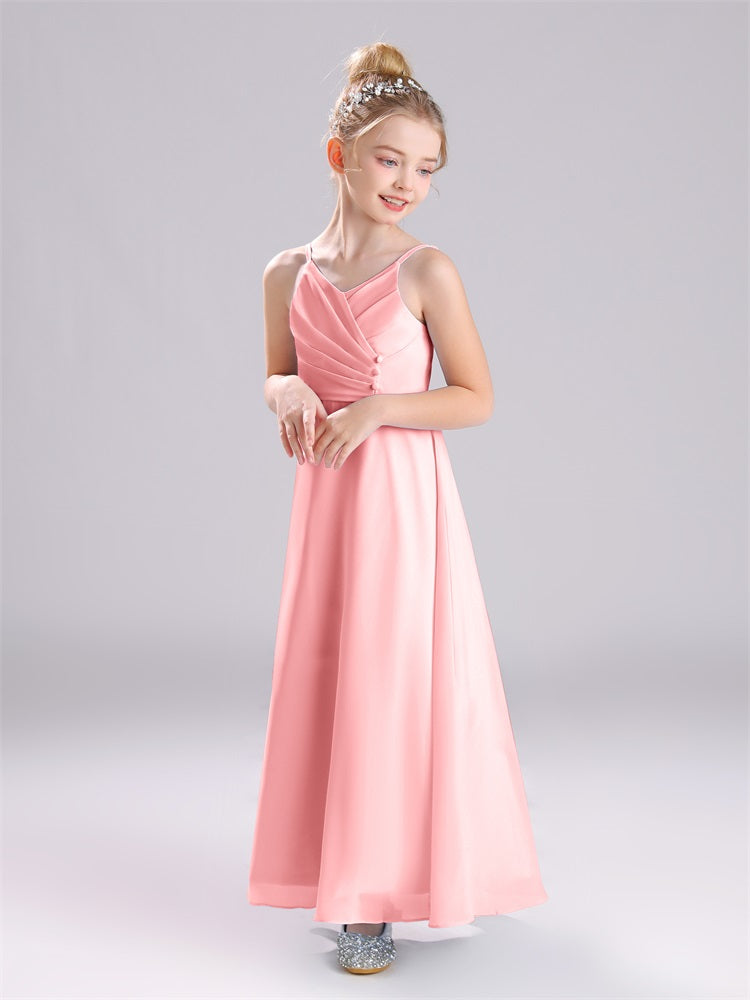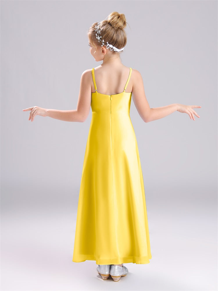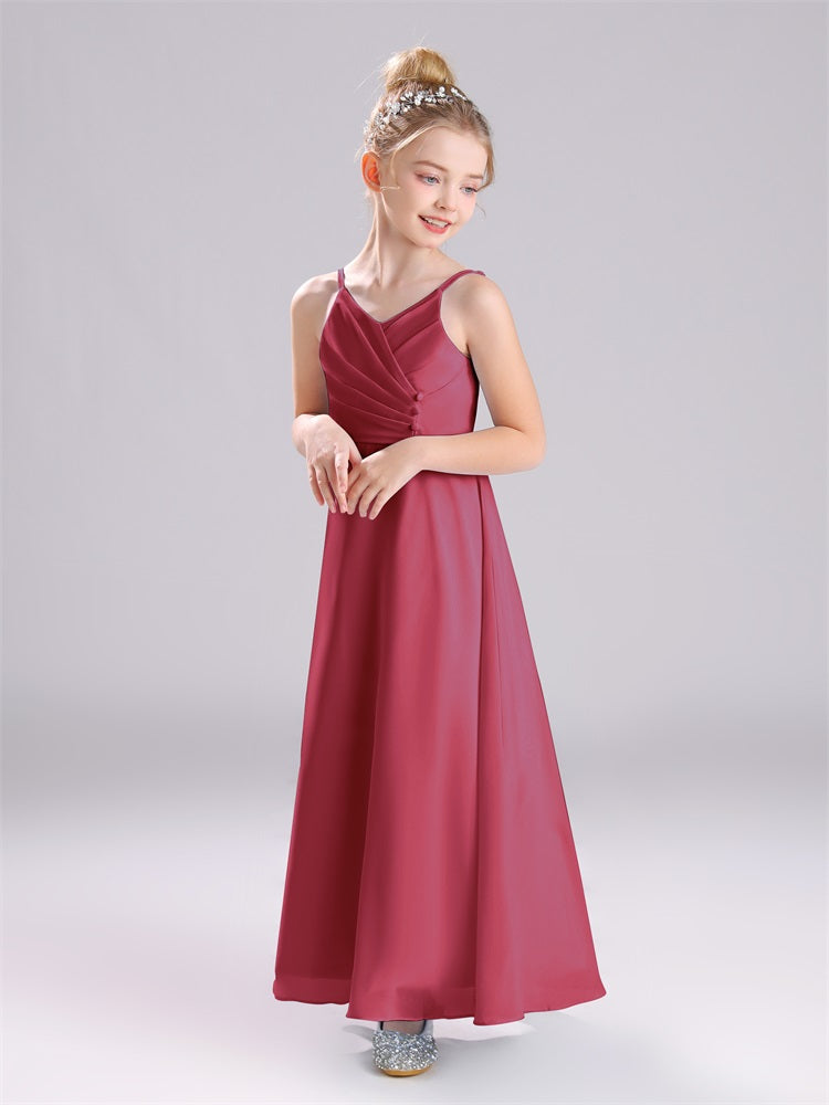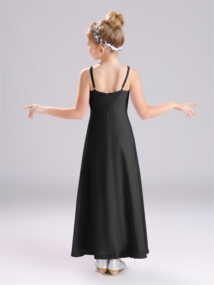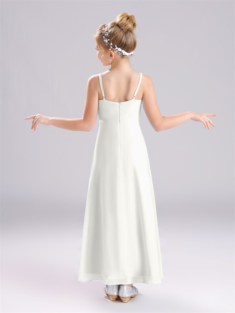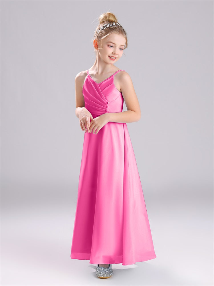 Dieses Junior-Brautjungfernkleid mit V-Ausschnitt verfügt über Spaghettiträger, Falten und Chiffonmaterial. Sein elegantes Design und die bequeme Passform machen es zur perfekten Wahl für jede Hochzeit. Die Plisseefalten verleihen ihm einen Hauch von Raffinesse, während der Chiffon ein leichtes und fließendes Gefühl vermittelt. Sehen Sie umwerfend aus und fühlen Sie sich selbstbewusst an Ihrem großen Tag.