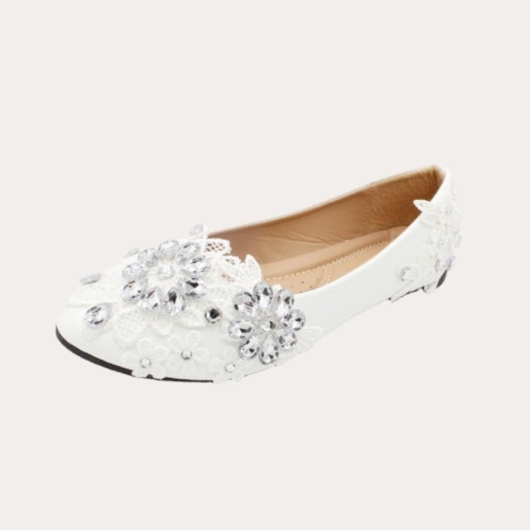 Mit diesen wunderschönen Hochzeitsschuhen, verziert mit funkelnden Diamanten, Spitze und Blumen, werden Sie sich wie eine Prinzessin fühlen. Die perfekte Kombination aus Eleganz und Komfort, um Ihren besonderen Tag noch schöner zu machen. Lassen Sie sich von diesen traumhaften Schuhen verzaubern und tanzen Sie durch die Nacht.