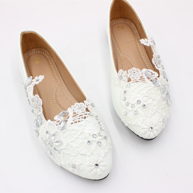Diese atemberaubenden Hochzeitsschuhe sind mit funkelnden Diamanten und zarter Spitze verziert. Die wunderschöne Teardrop-Form verleiht dem Schuh einen Hauch von Eleganz und die Blumenapplikation macht ihn zu einem perfekten Begleiter für den schönsten Tag in Ihrem Leben. Genießen Sie das Gefühl, wie eine Prinzessin zu laufen.